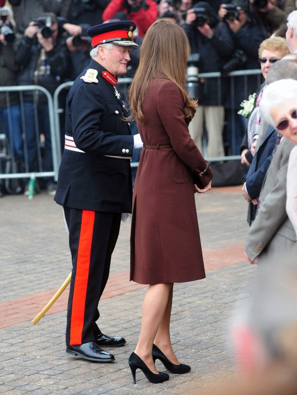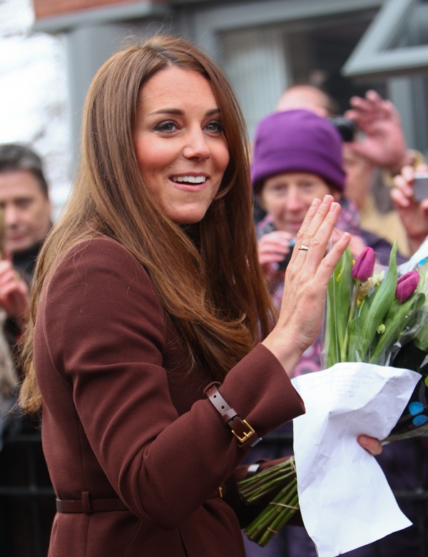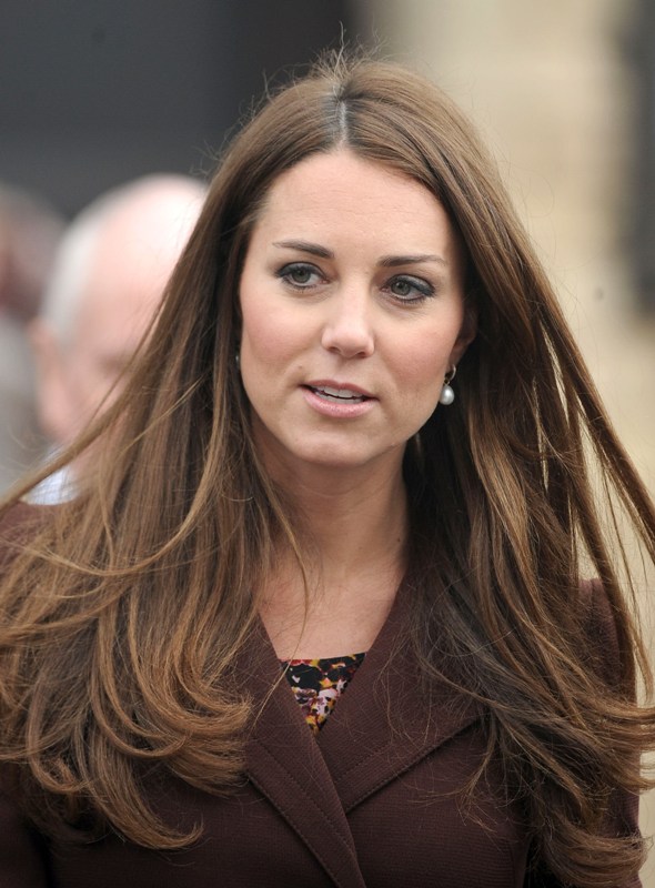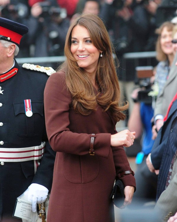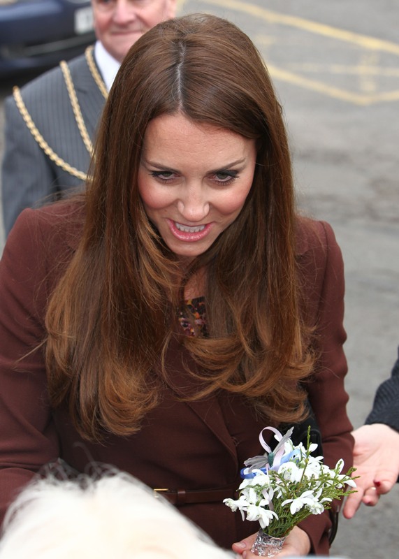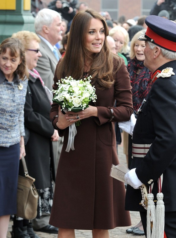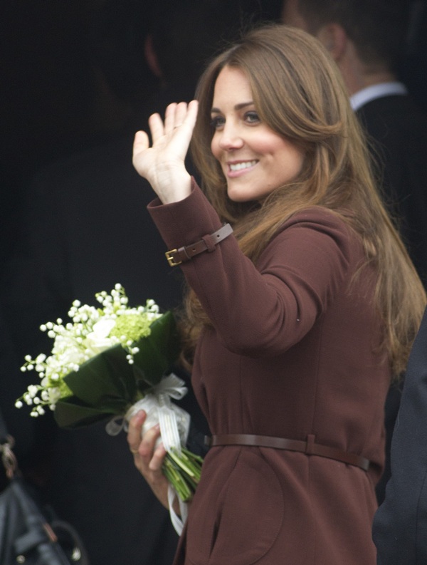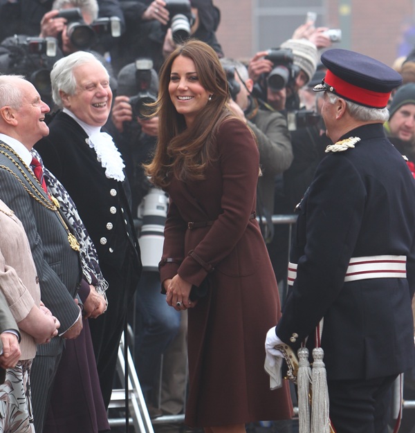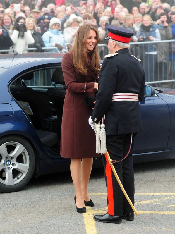 After attending a wedding with William and Harry this weekend in Switzerland, Catherine Cambridge is back in England, on official business today in Grimsby where she visited the National Fishing Heritage Centre. As expected, Kate recycled -- this Hobbs coat was previously worn last year, on Valentine’s Day, in Liverpool. Click here for a refresher. Makes sense, especially now. She’s thrifty to begin with, and I can’t imagine she’d bother with clothes she’ll wear once at that size. As for underneath, those eagle eyes at What Kate Wore have identified that it’s a pretty pleated dress by Cezanne that retails for around US$115. Click here to see. But what I really like is that she’s not ringletting her ends so much.