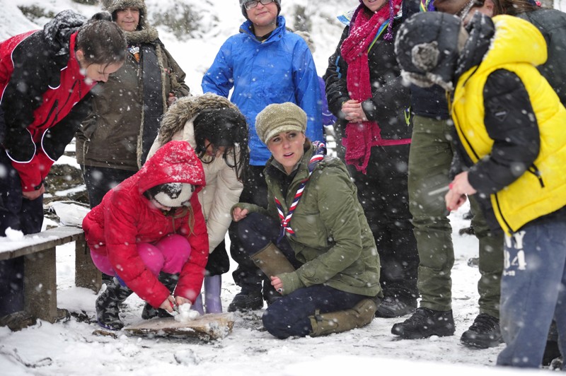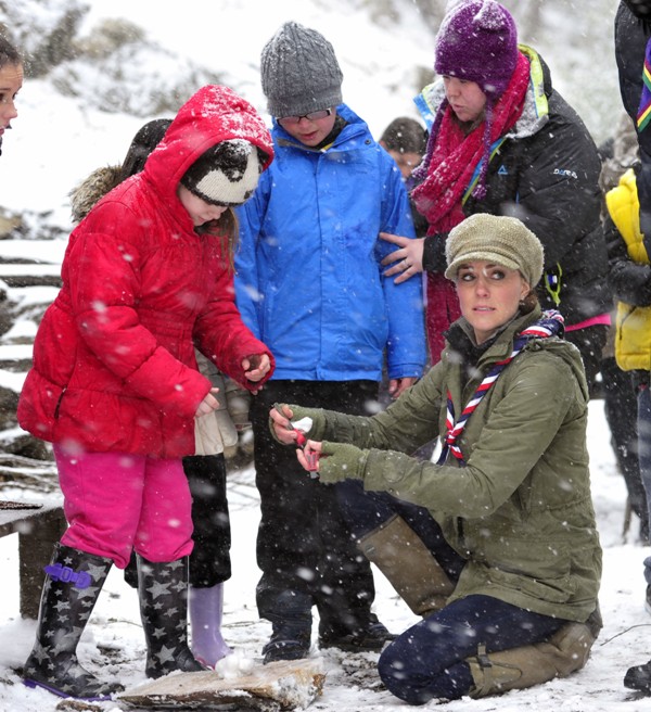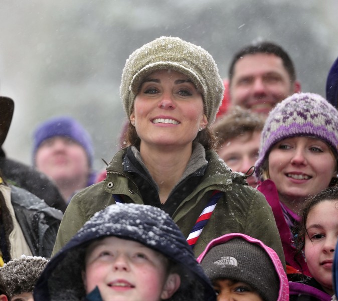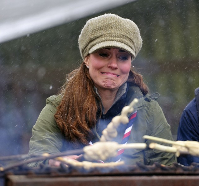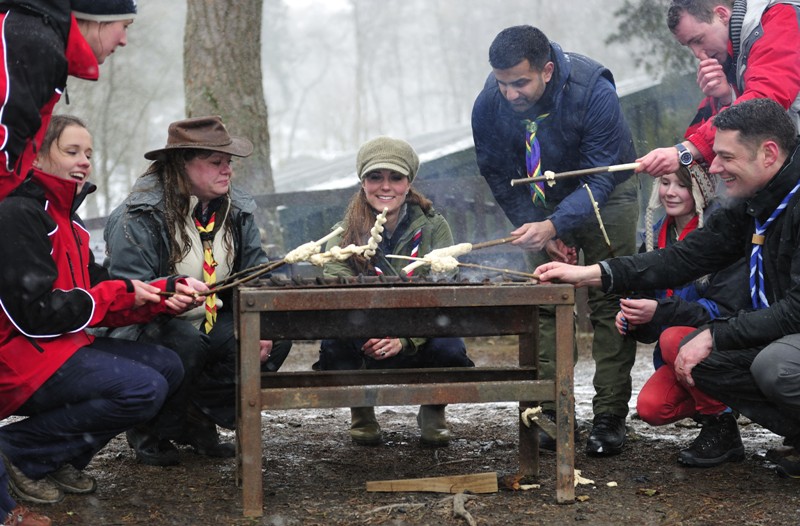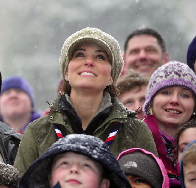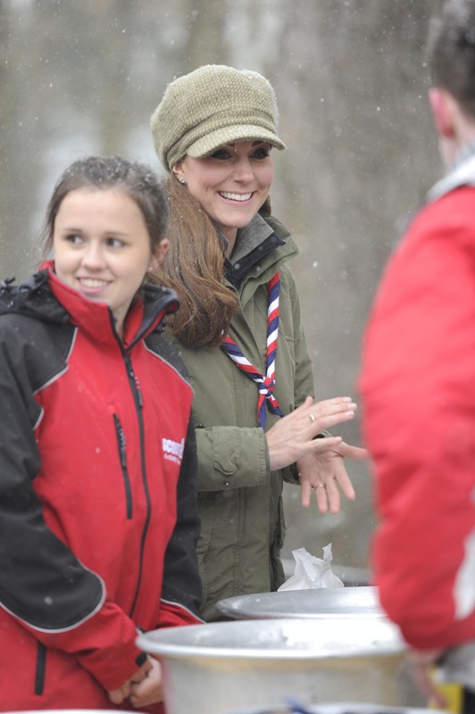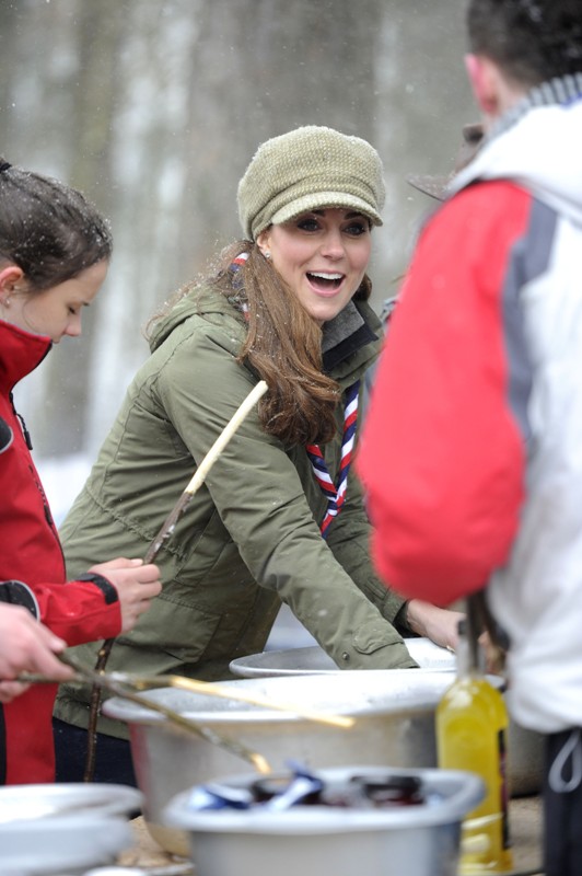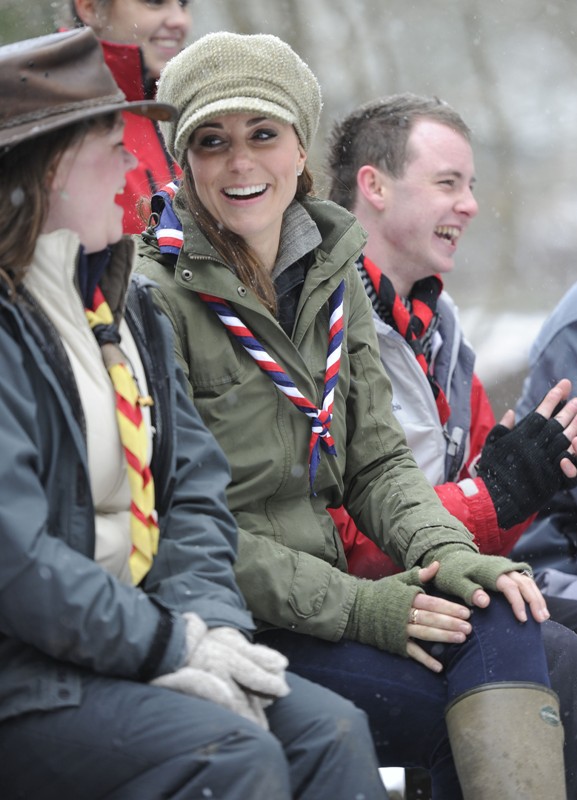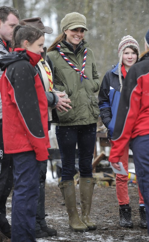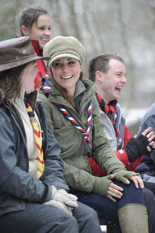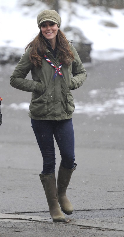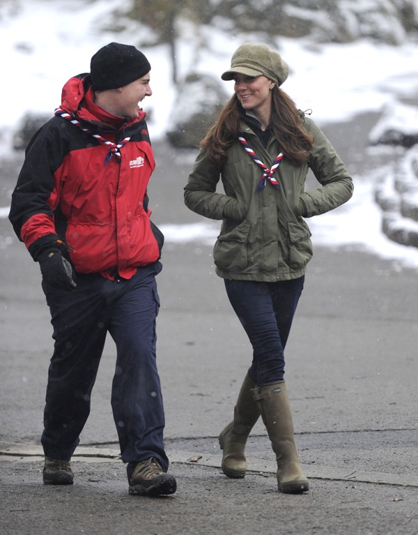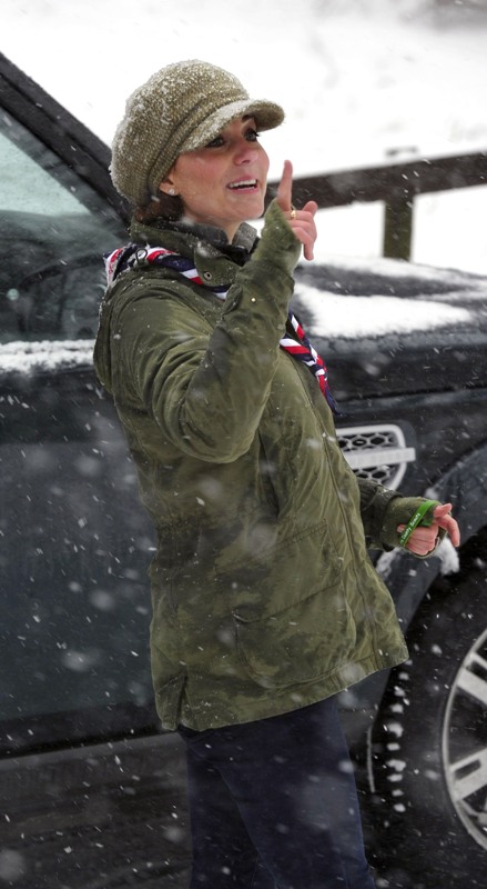 Today, despite the deep freeze all over England right now, she was at the Great Tower Scout Camp in Cumbria with other adult volunteers of the Scout Association learning some new scout skills. She made a fire. She roasted some dough. She knelt on the ground in the snow. She giggled. She wore a scout scarf and a knit cap. I am a little concerned that it’s green but, as it could, in a stretch, be called part of a uniform, we may be able to get away from the cuckold connotation (a Chinese thing) but anyway, I mean, um, erm, really, is fidelity really a Windsor attribute? Besides, as we know, Kate is much more pragmatic than Diana was.