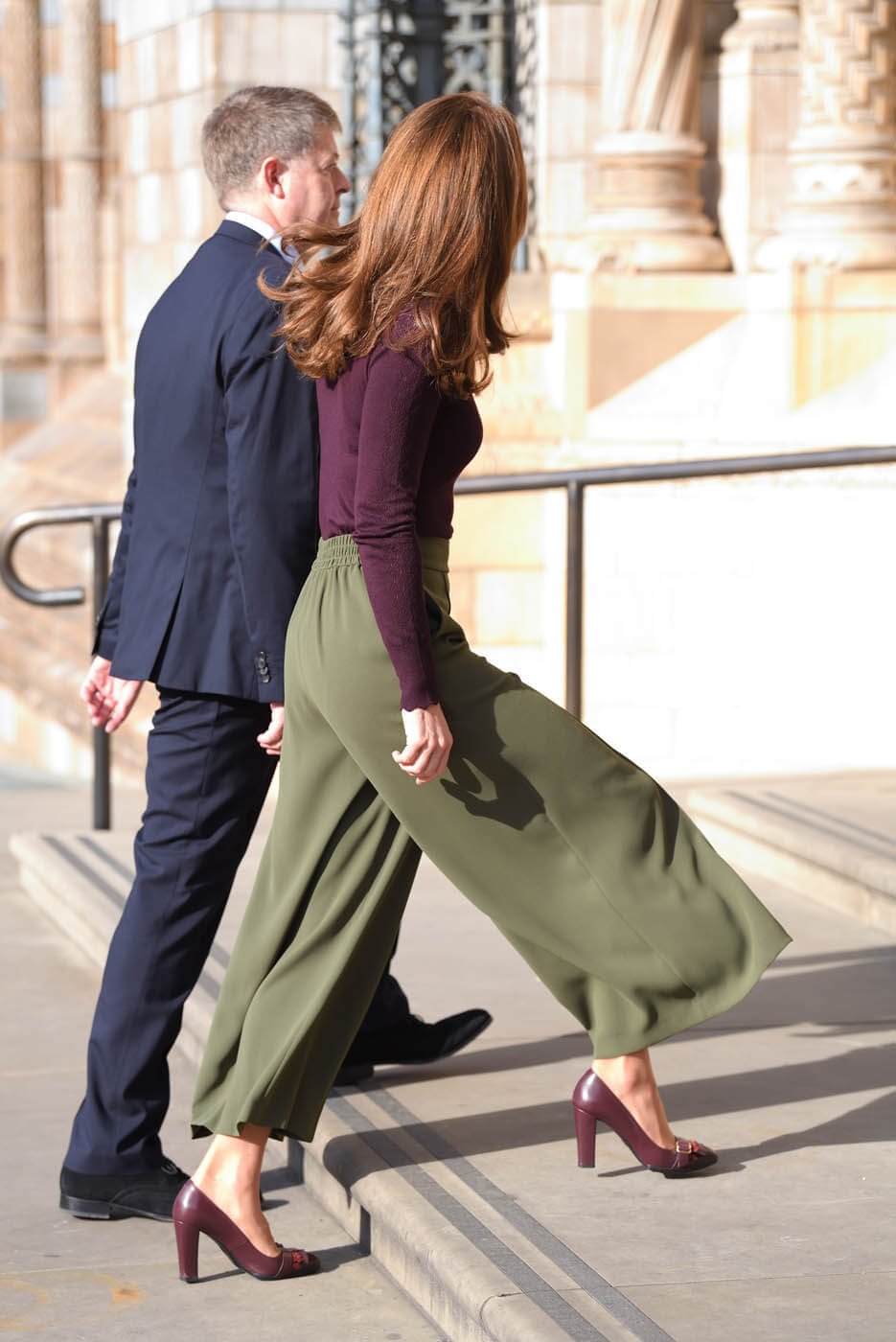 Catherine of House Cambridge is a patron of the National History Museum and she visited today to highlight the wildlife protection work at the Angela Marmont Centre for UK Biodiversity. This is a great outfit. I like the colour combination – oxblood and olive – and I like that she’s been ever so slightly updating her style. This is the year that Kate went for the culottes. We’ve seen her wearing them a few times now, it’s a new era.