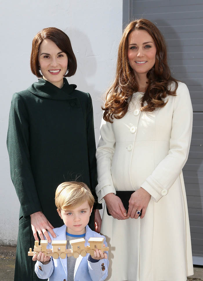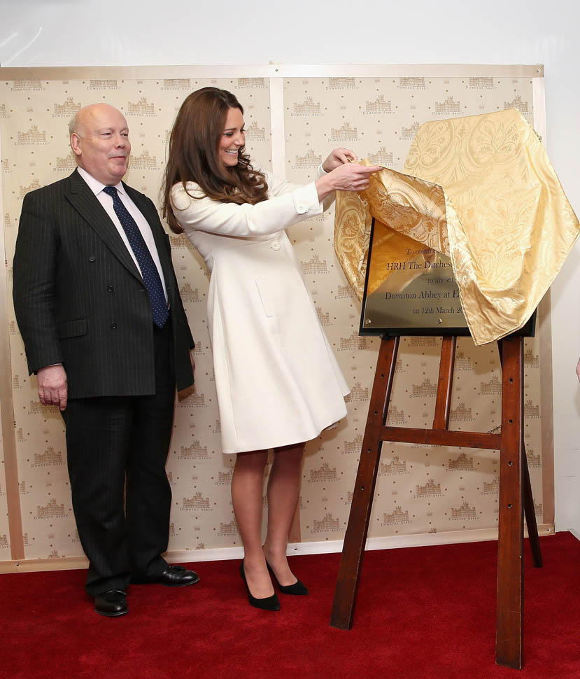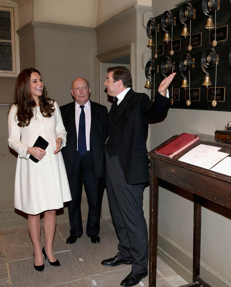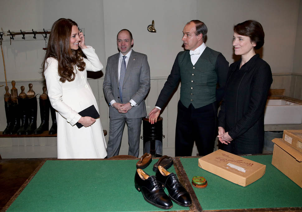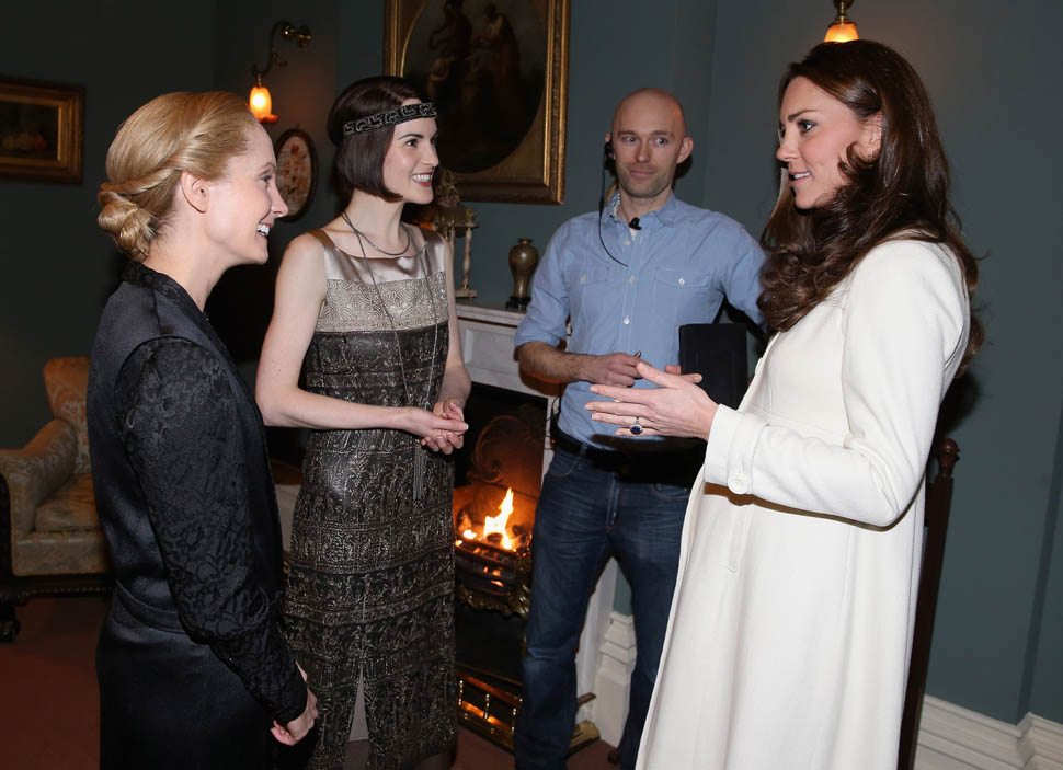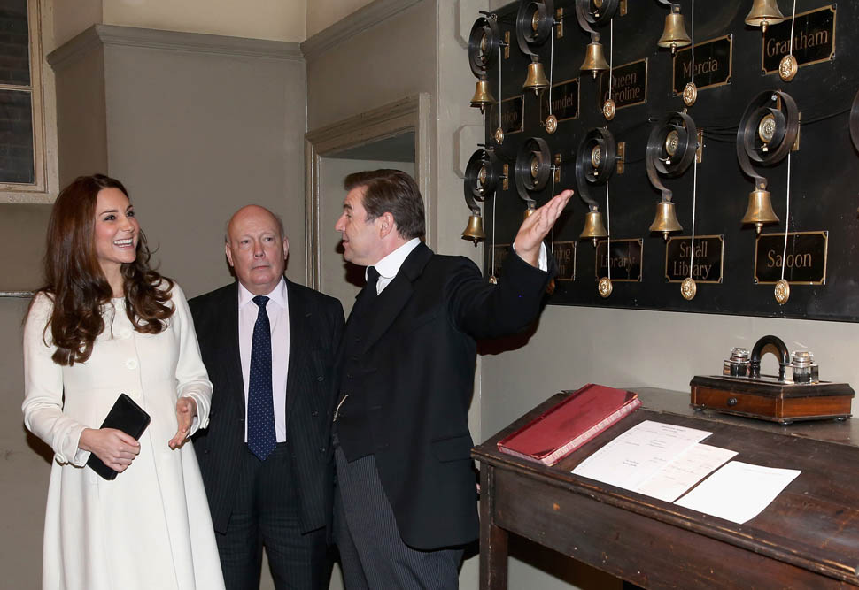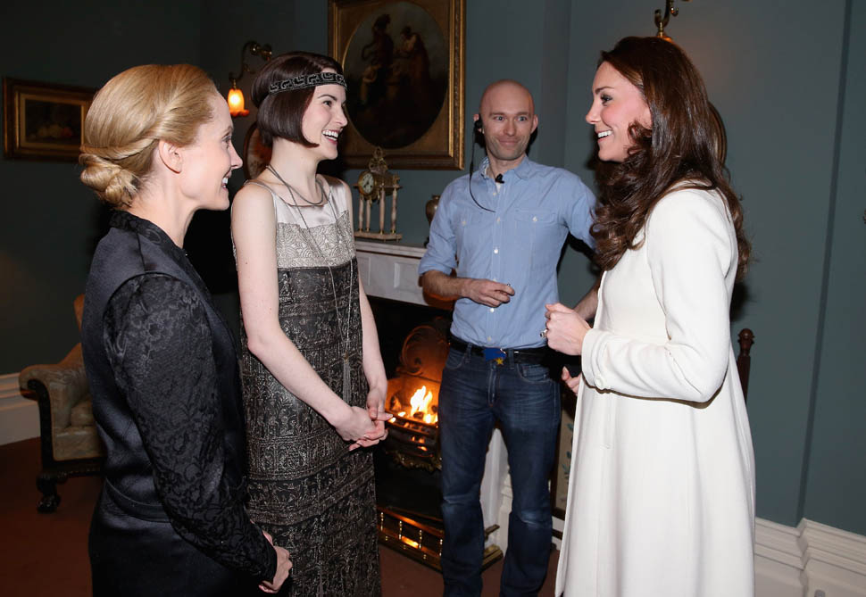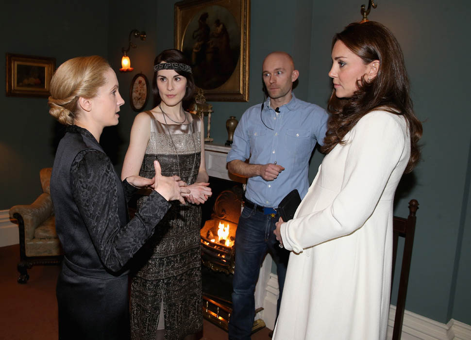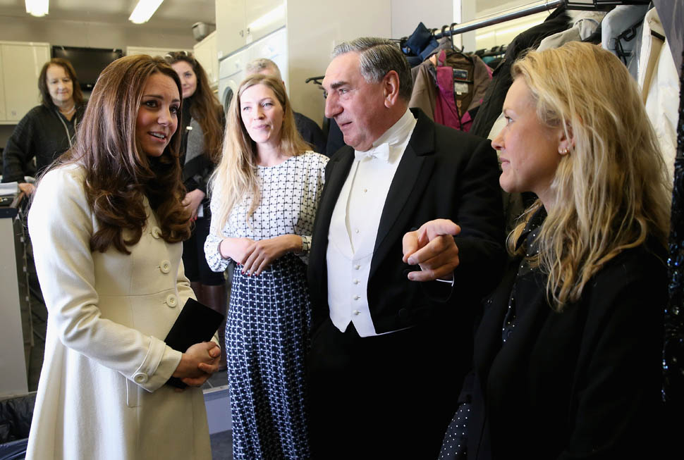 Princess Catherine visited the set of Downton Abbey today and everyone’s making “duchess-duchess” quips. She’s a big deal, the show’s a big deal, Royal + Show Business is always a good sell. And apparently she told them she’s a big fan of the show so they took a group photo that looks hilariously like a royal family photo, except that it’s in the servants’ area of the house. If that had been the Queen who was visiting, what would be the protocol around suggesting that location for the picture?