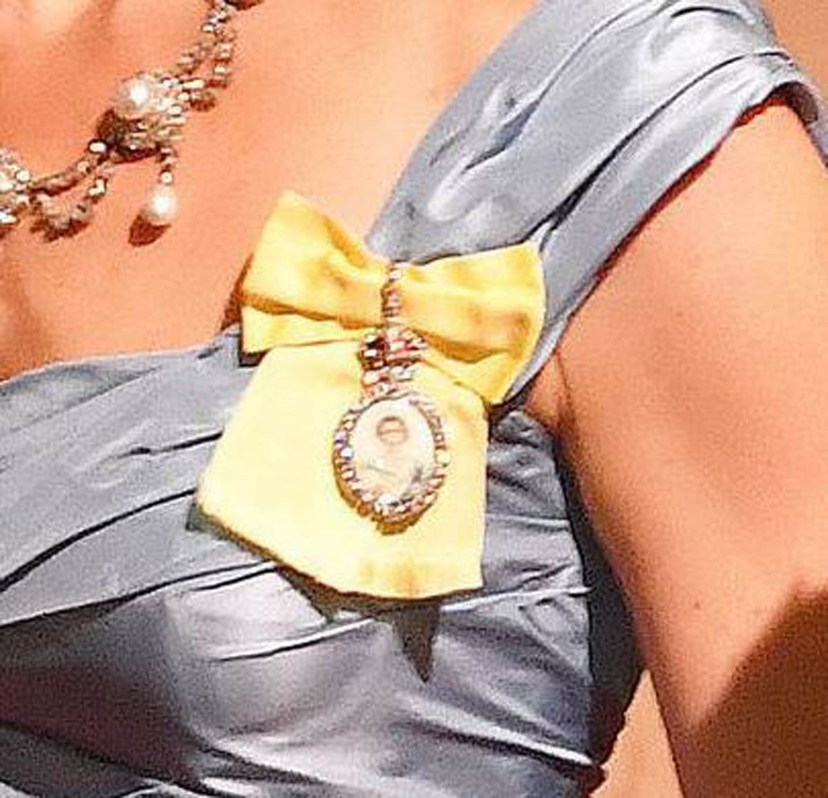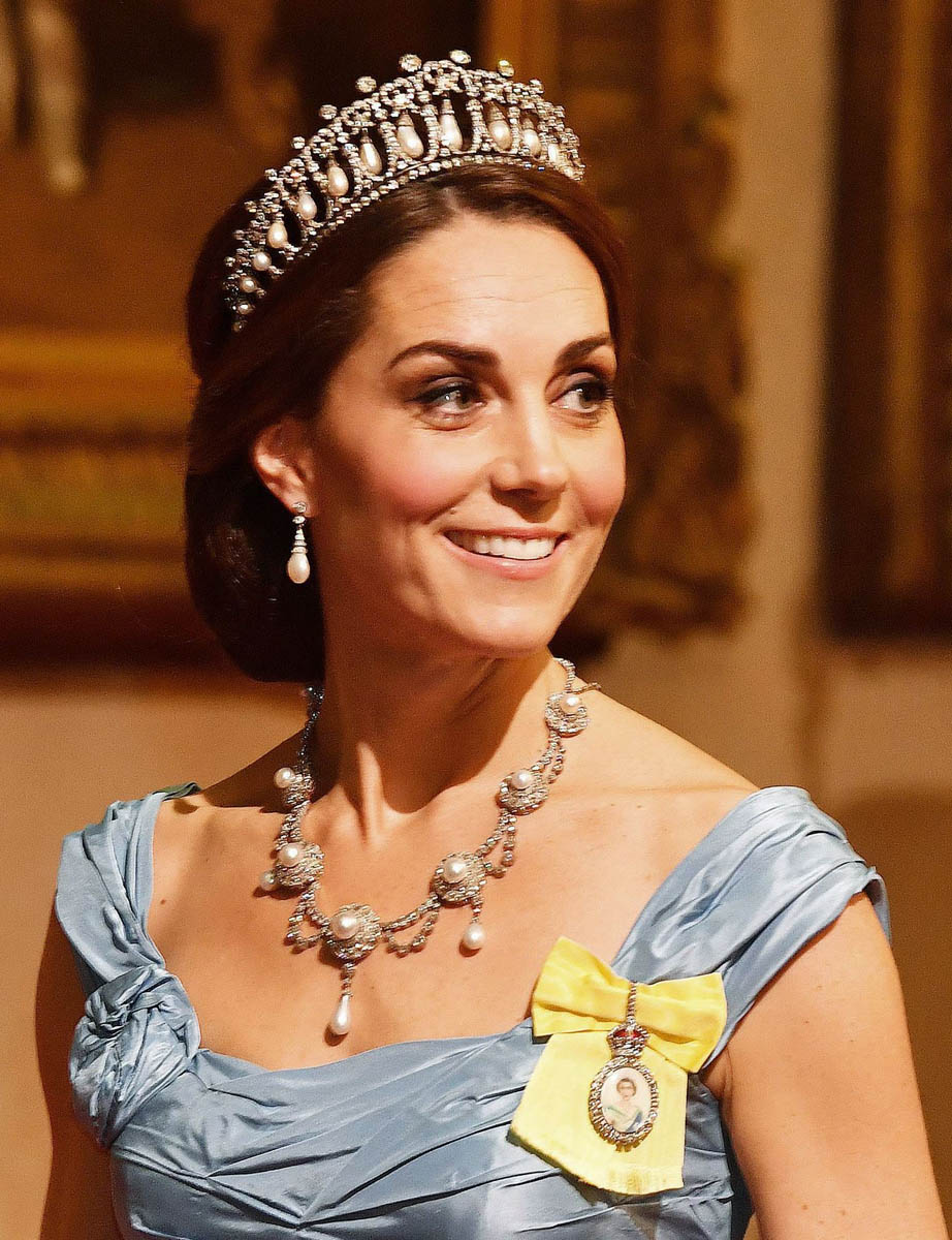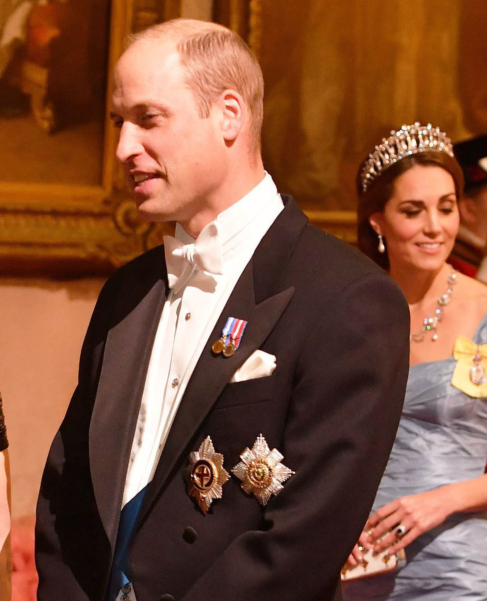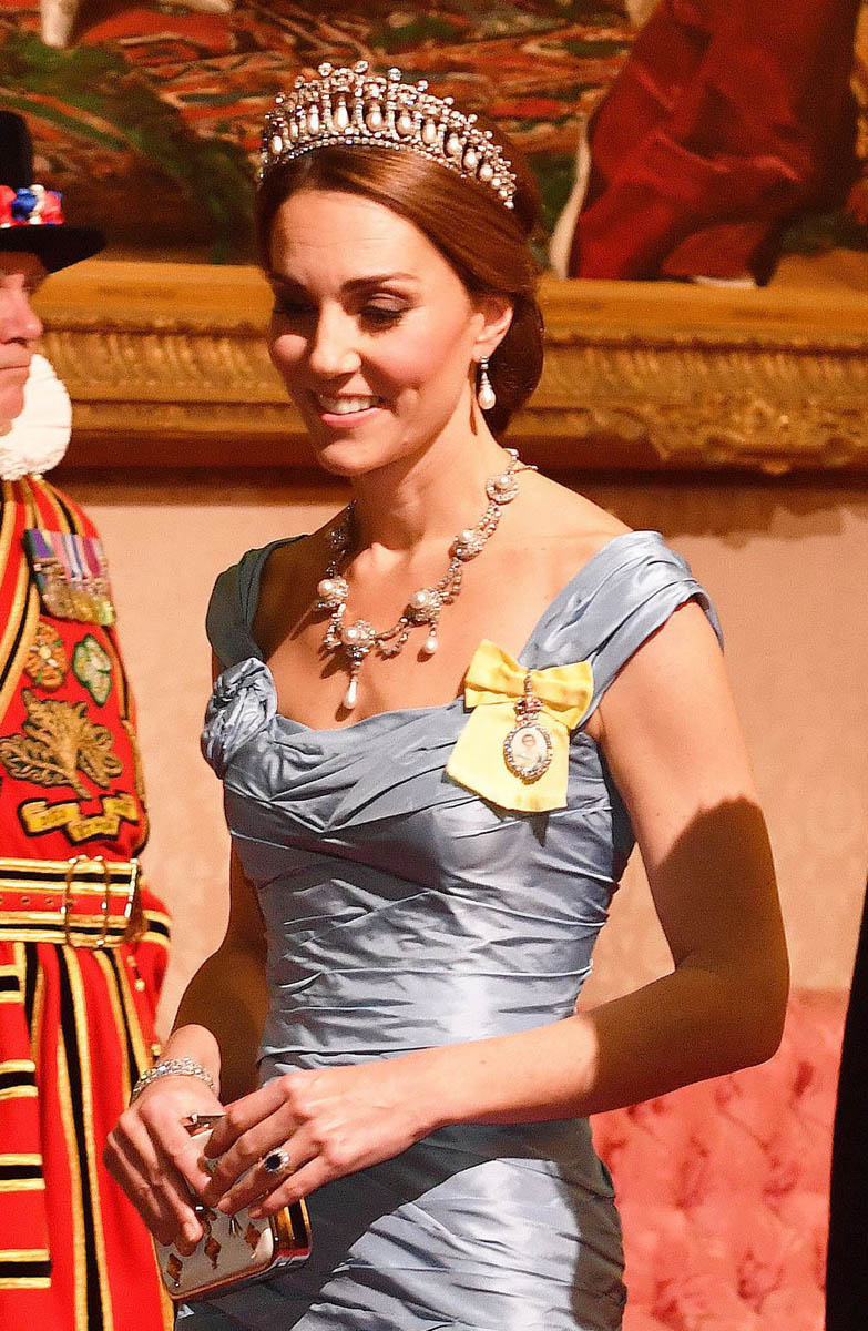 As for the dress, it’s Alexander McQueen – and it’s hideous. That said, it had a purpose. You can’t do much in the way of fashion forward at a royal ball with this crowd and this crowd, older generation monarchs etc, would 100% be into this dress. And as ugly as it is, the dress’s most important feature is the fit. Kate is showing off her figure, like really showing it off, for the first time since Trey was born in April. Showing it off = showing that it’s back. Sometimes you pick a dress knowing that it won’t be talked about. And sometimes you pick a dress knowing that you will for sure be talked about. This dress, even though, again, it’s heinous, was chosen because it would make headlines. All of it is making headlines: the tiara, the earrings, the dress, and the brooch. The brooch is the Royal Family Order, a “personal gift” from the Queen, made of glass, bearing the Queen’s image. Kate first wore it last December.