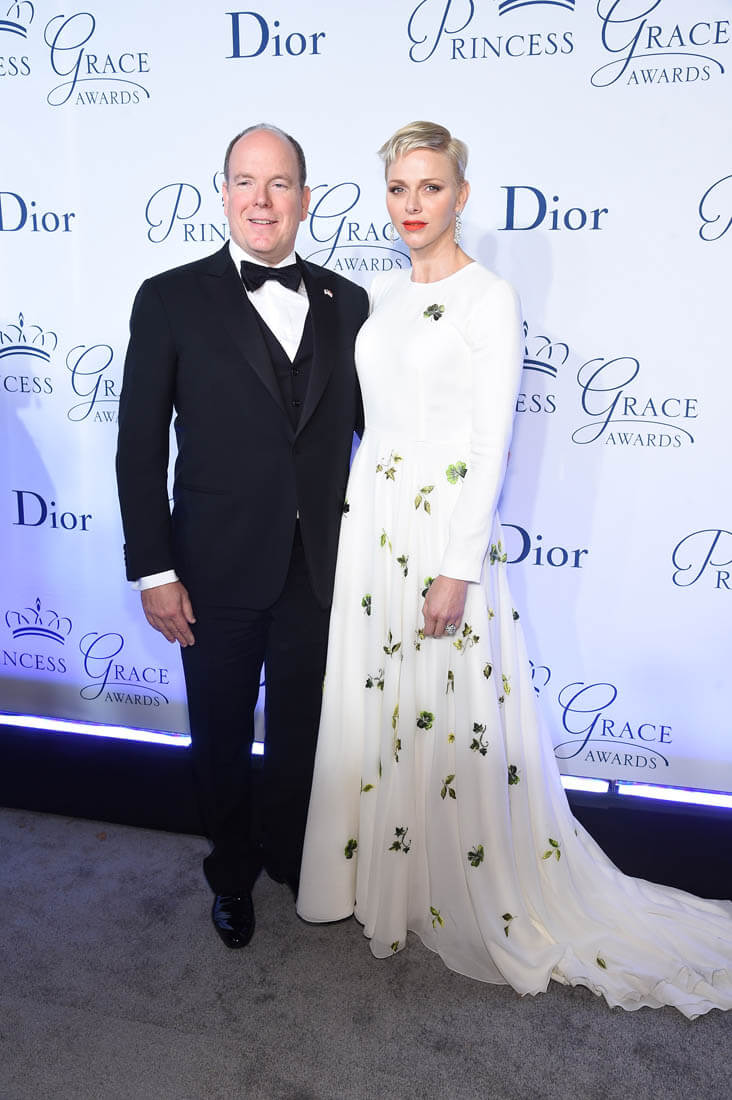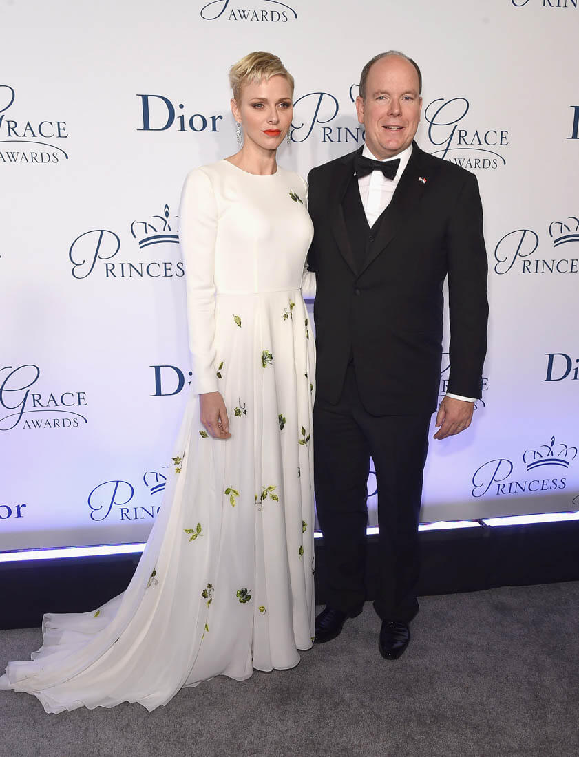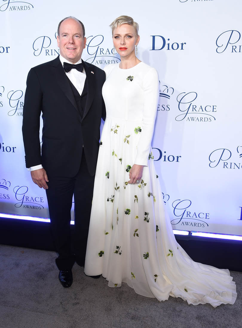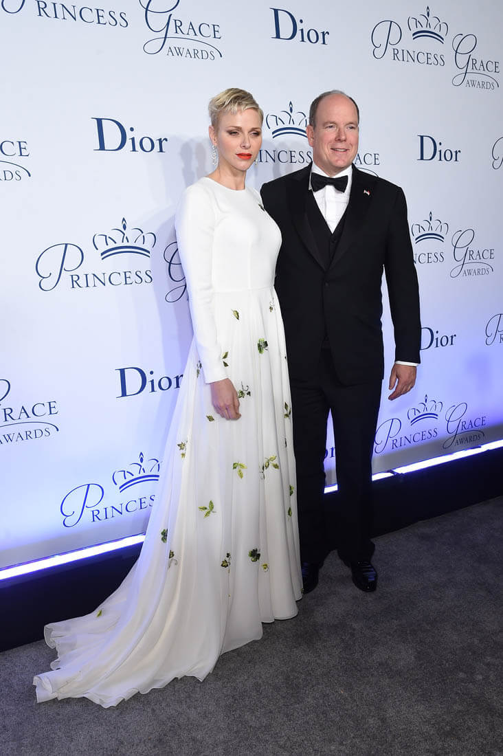 It’s been a while since we caught up with Princess Charlene of Serene of Monaco. She and Prince Albert were in New York last night for the Princess Grace Awards Gala. This is such a lovely dress on her. Those green flowers are so pretty against the white fabric. And I like her hair a little spikey like that.