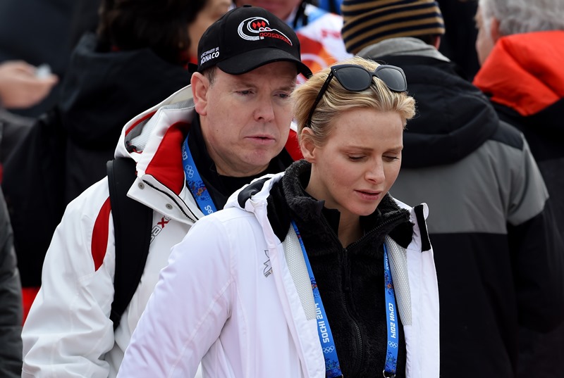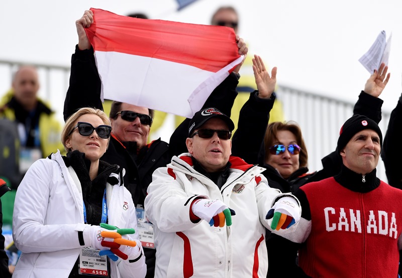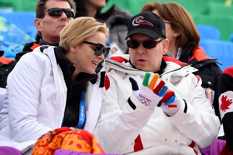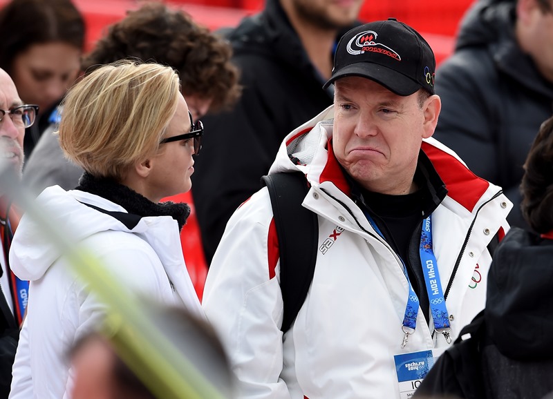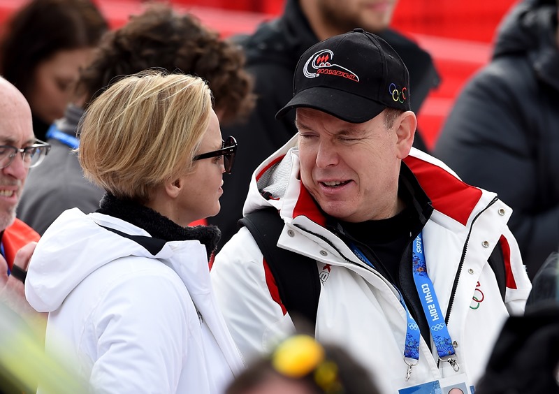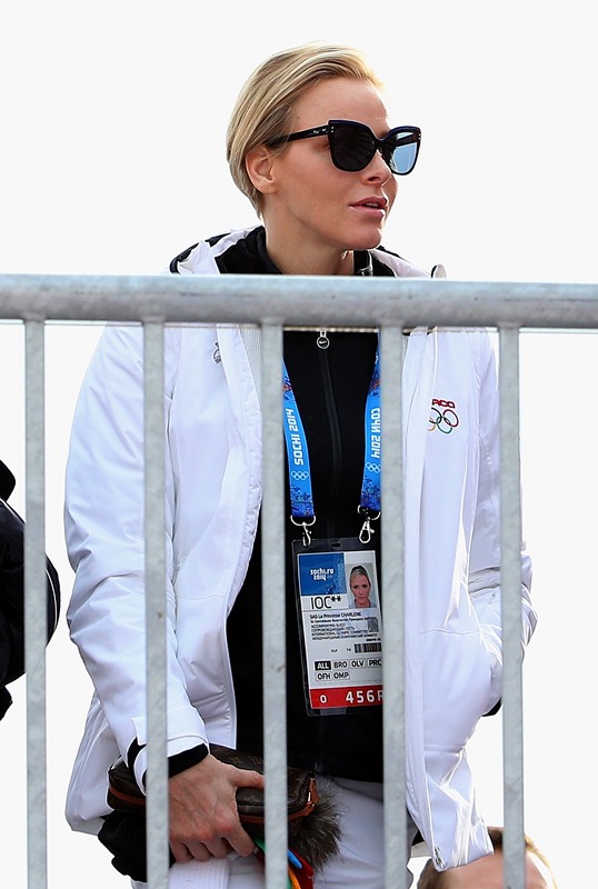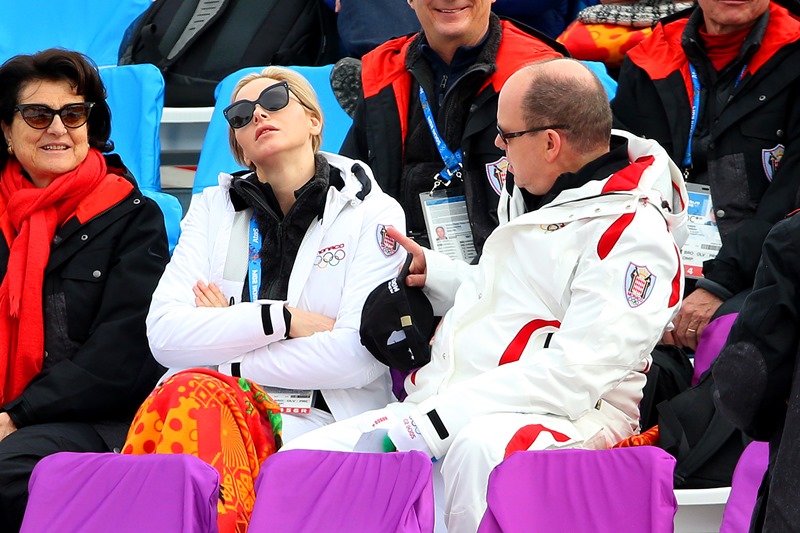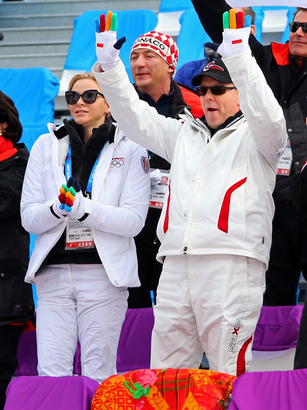 Here’s Charlene with Prince Albert, that giant dork, on Day 2 of the Olympics watching Alpine skiing.
