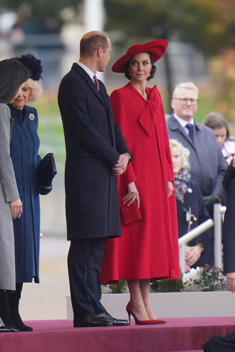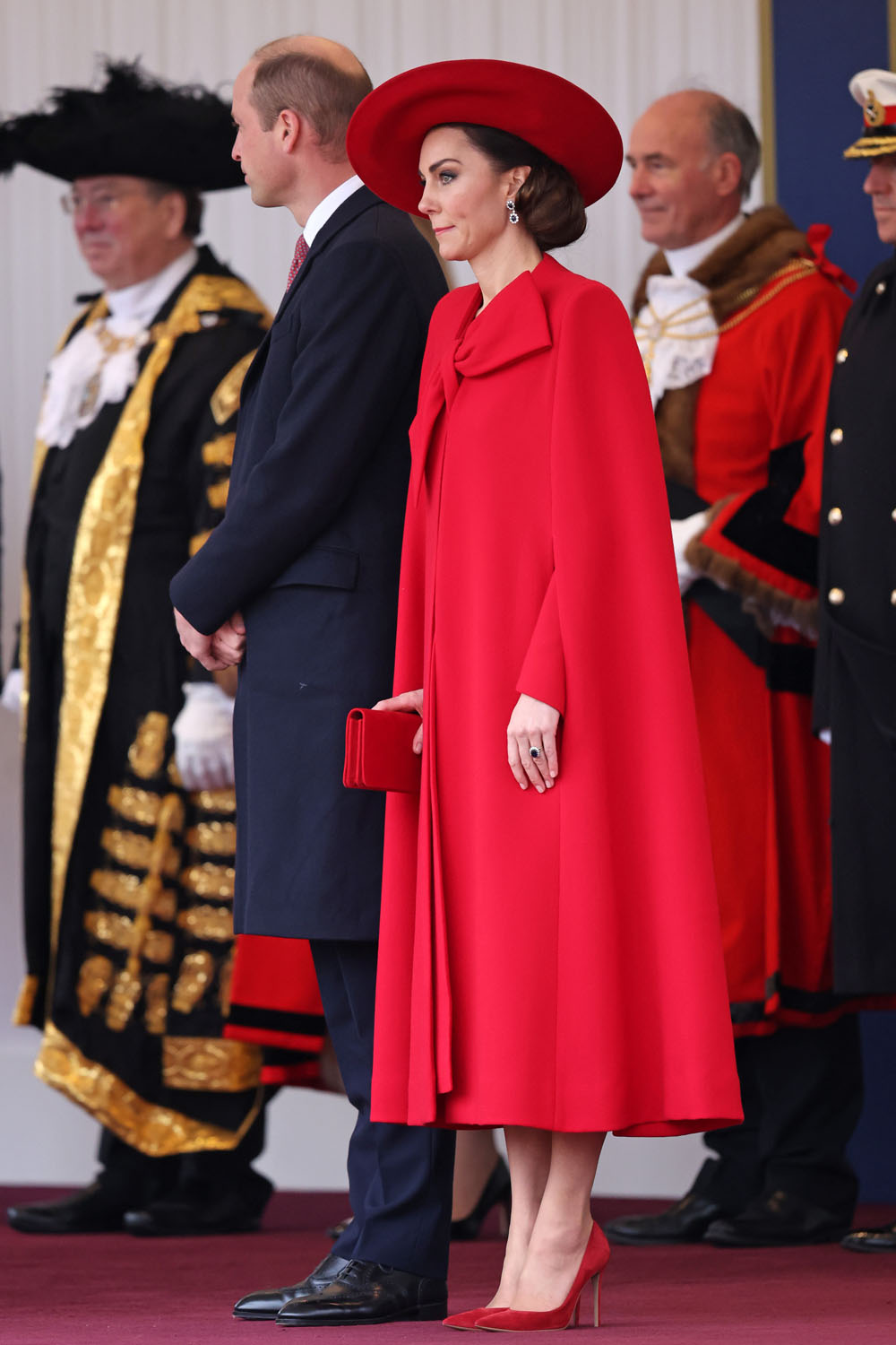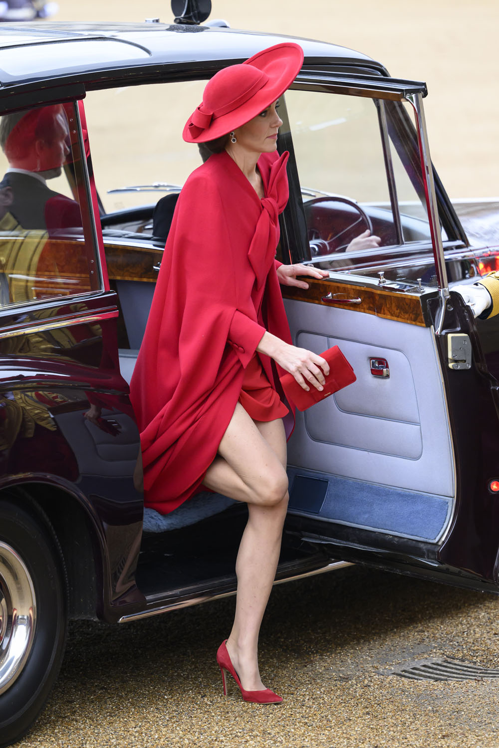 This red cape dress, Catherine Walker & Co, with the big bow tied off-kilter is probably one of her best outfits in a while. The material is exquisite, it looks thick and luxe, it falls beautifully, and it photographs like a dream. There’s not a wrinkle or a fold in sight, it’s so good not even her terrible hair can ruin the moment.