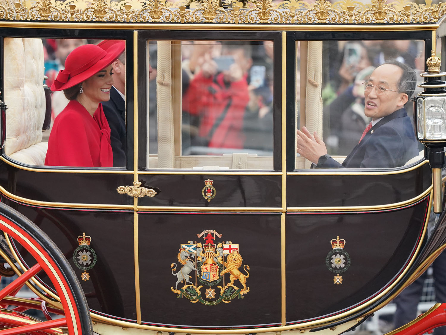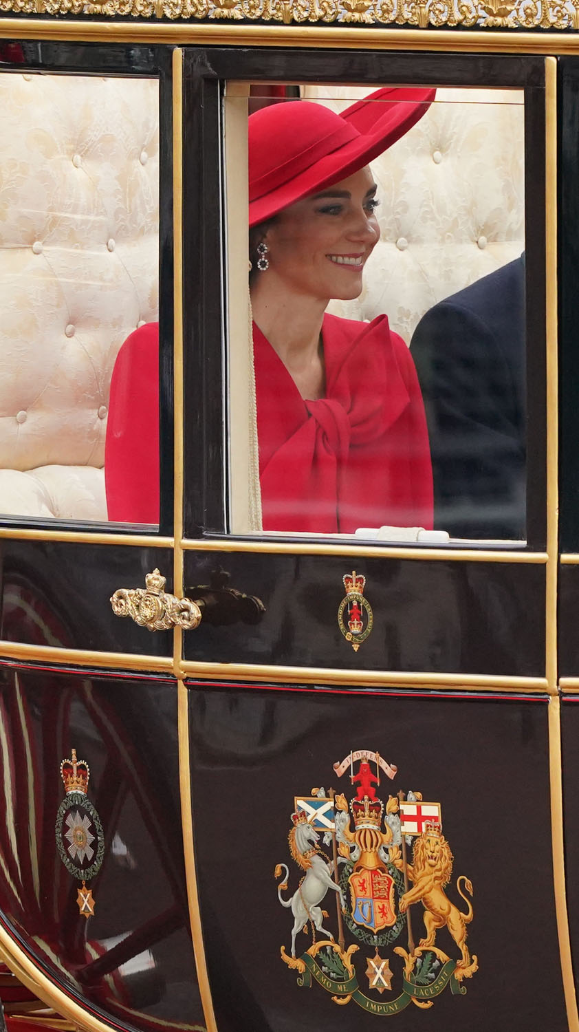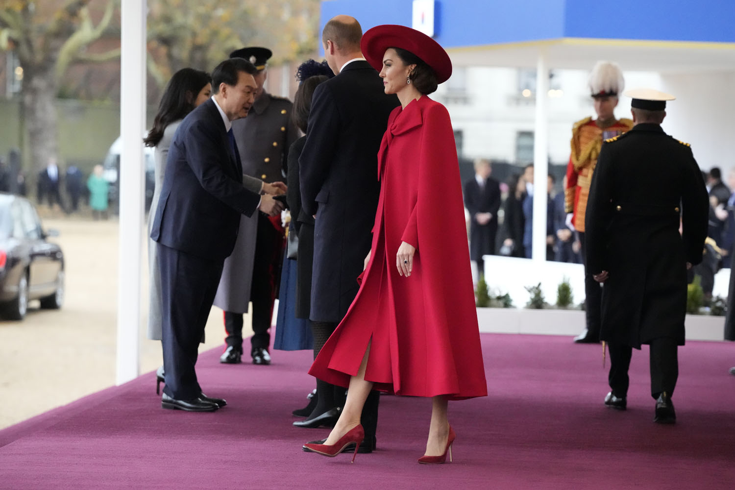 South Korean President Yoon Suk Yeol and First Lady Kim Keon Hee are in London for a two day state visit and Prince William and Kate were responsible for the initial greeting, representing the British royal family, before heading over together to meet King Charles and Camilla. This is what the British monarchy is known for – the pageantry, the spectacle, the carriages, and the jewels. And Kate really brought it today with her look.