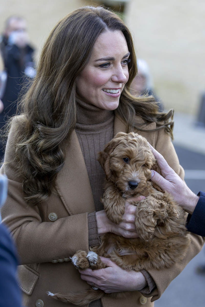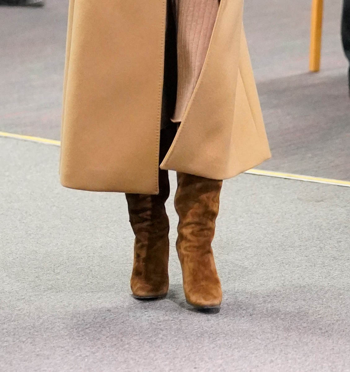 Kate’s in camel monochrome here with the overcoat, the turtleneck, the skirt, and the boots. This is actually a slightly more form-fitting look on her than we typically see on her. The turtleneck is fitted. The skirt is quite fitted – it’s about as body-con as she’s worn in recent memory. As for the boots, I’m not offended by them and I do like the slouch of them but for me, suede doesn’t quite work here. I would have gone with a regular leather with a little shine to mix up the dull textures of the whole outfit.