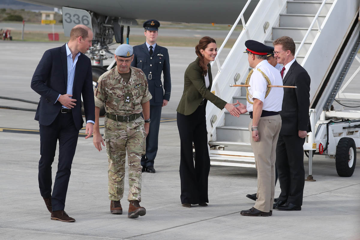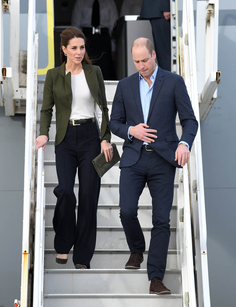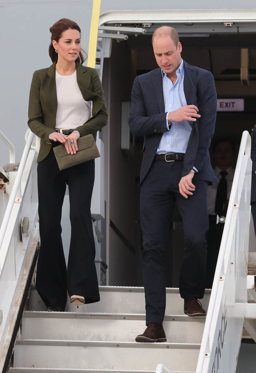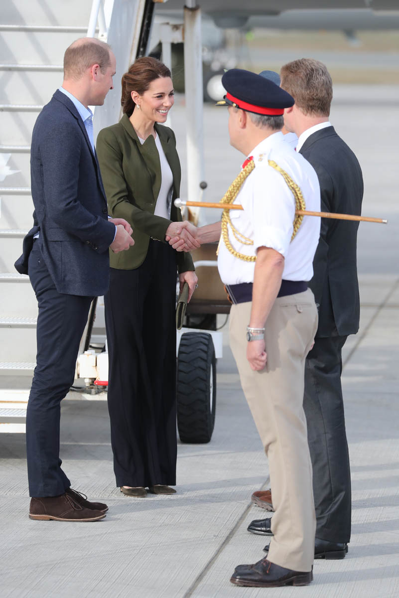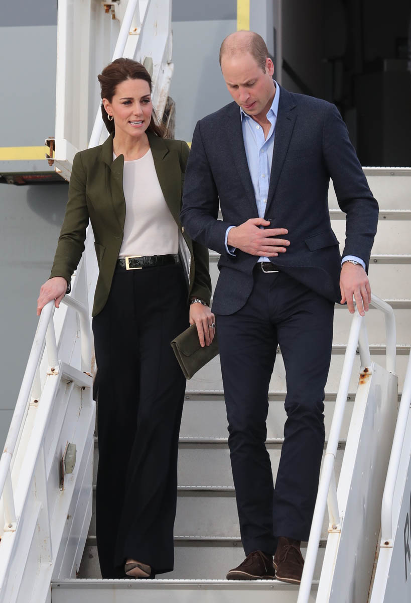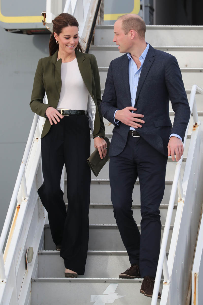 It’s a busy schedule for the Cambridges though as they’re in Cyprus today visiting with thousands of military personnel who’ll be stationed abroad during the holidays. Wasn’t expecting to see her in trousers, were you? This is, as they might say in Britain, such a smart outfit. Really, really polished. Those pants fit her perfectly. They’re perfectly pressed. That’s a great belt too. And the white shirt underneath is a crisp, fresh contrast to the olive jacket. It’s a strong look, back to back to back strong looks, if you count yesterday’s tartan skirt, followed by the ball gown, and now today’s all-business outfit. There’s been an extra zing to Kate’s wardrobe the last few months, non?