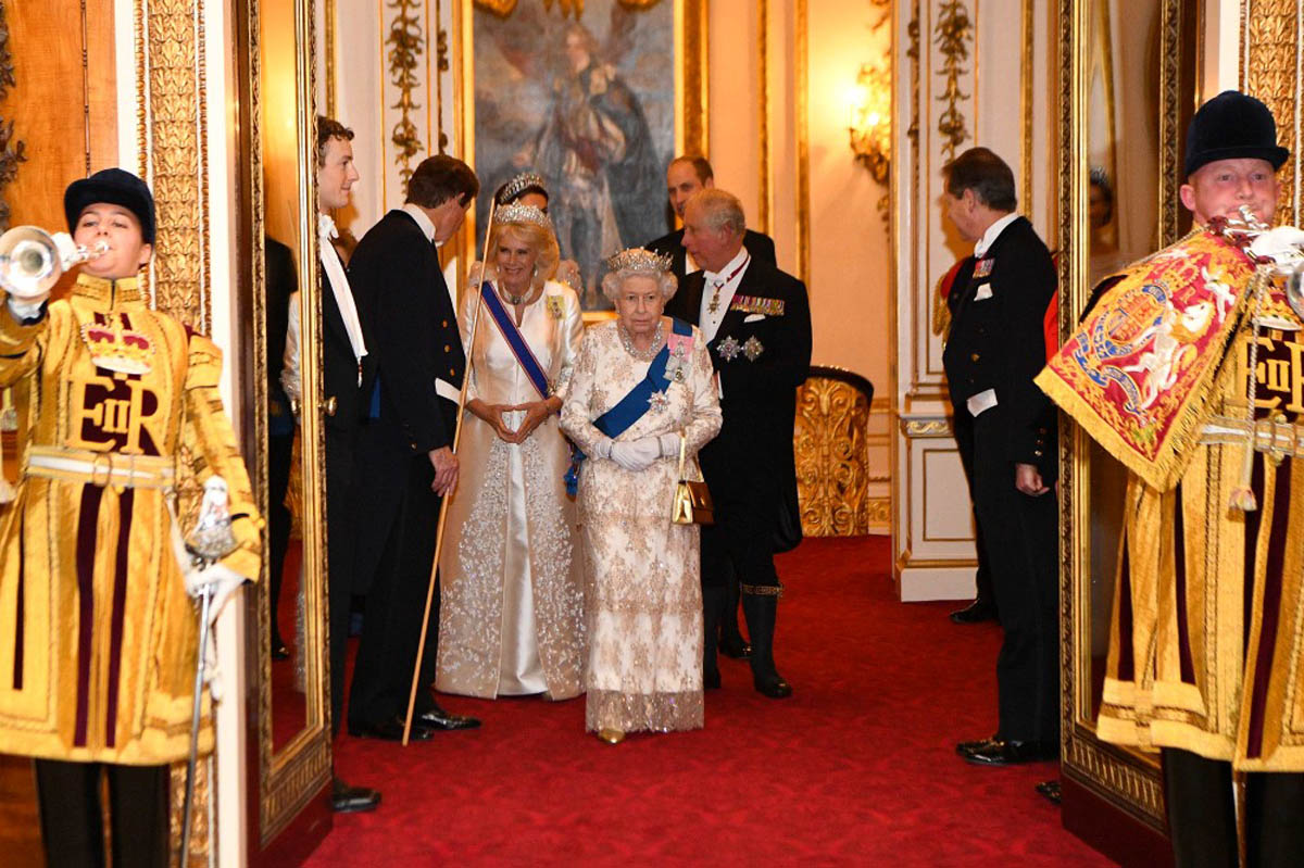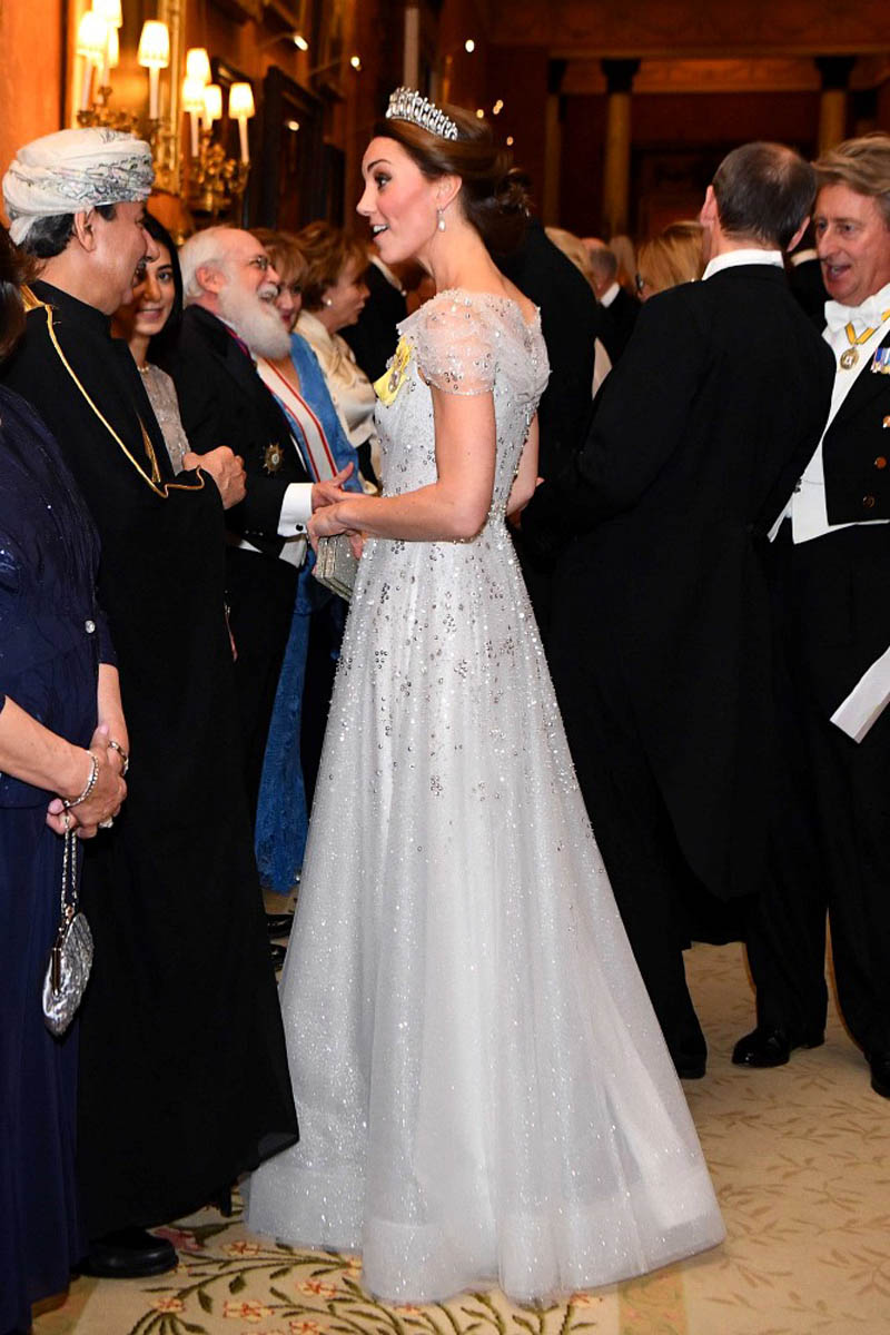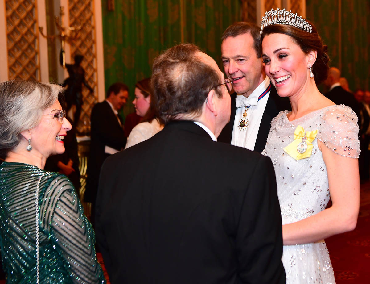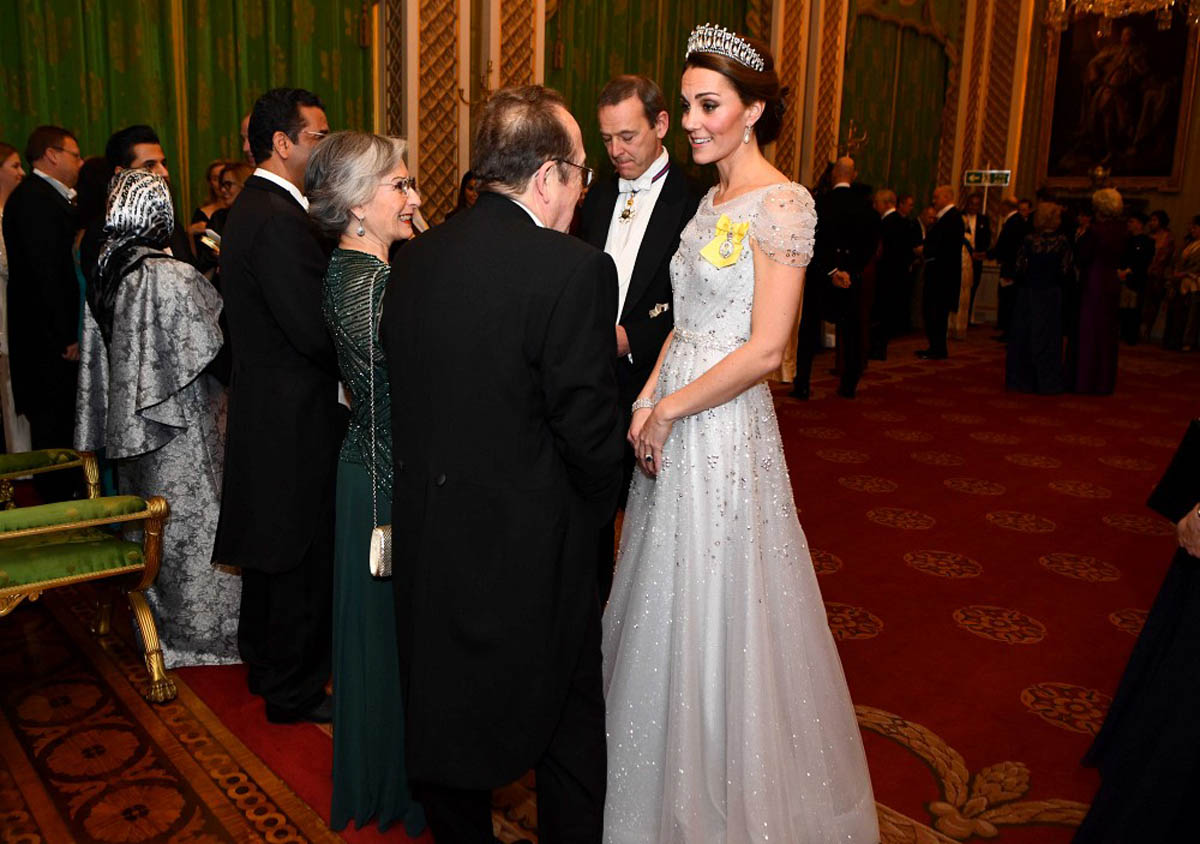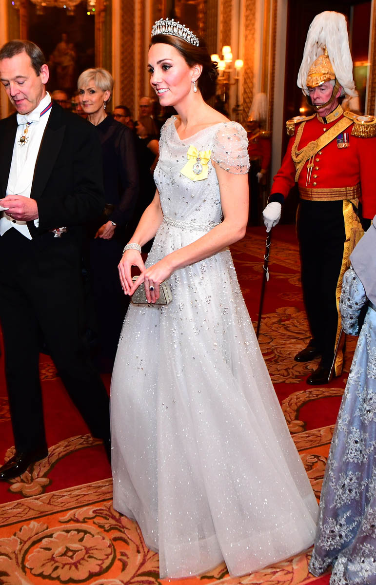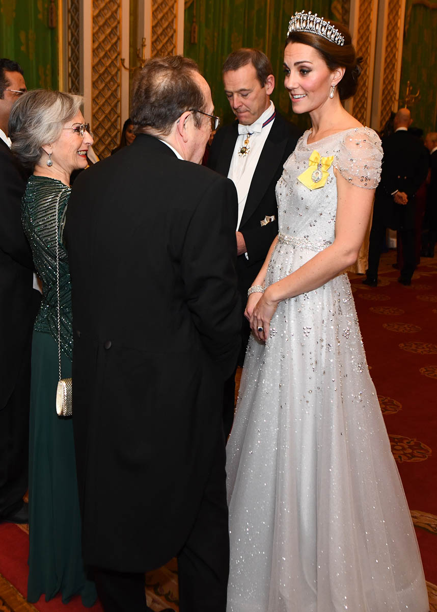 They busted out the tiaras last night at Buckingham Palace for the Diplomatic Corps reception as the Queen hosted foreign dignitaries at her annual party. Her Majesty, Duchess Camilla, and Princess Catherine all had tiaras on. Kate wore the Lovers Knot, the one she’s most often seen in, and a new Jenny Packham dress. It’s a princess dress for sure. Those cap sleeves are all Cinderella vibes, especially in that light, gauzy material. I quite like the silver grey tone going on here too. Might be the best formal gown we’ve seen from her in a while. As usual, I wish she’d do something more updated and modern with her hair.