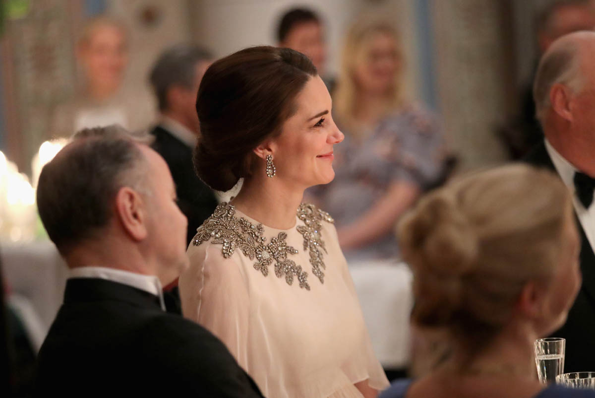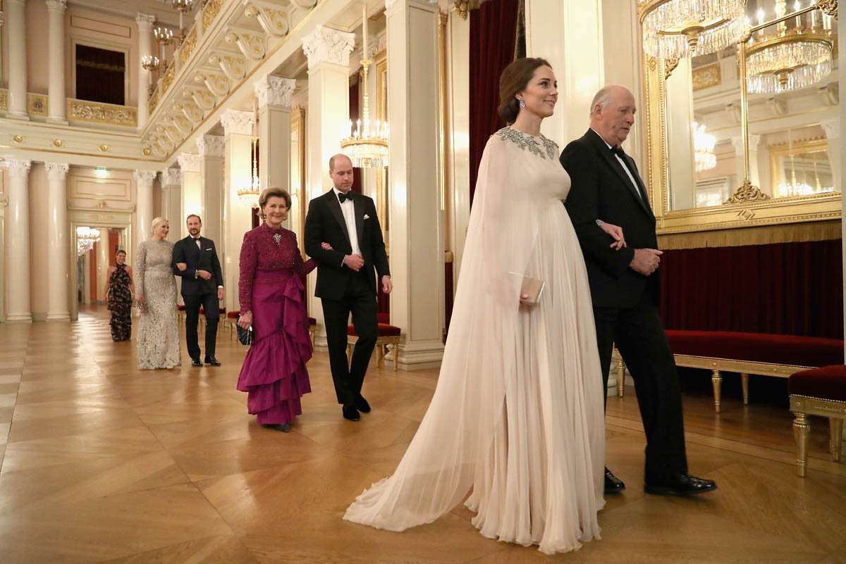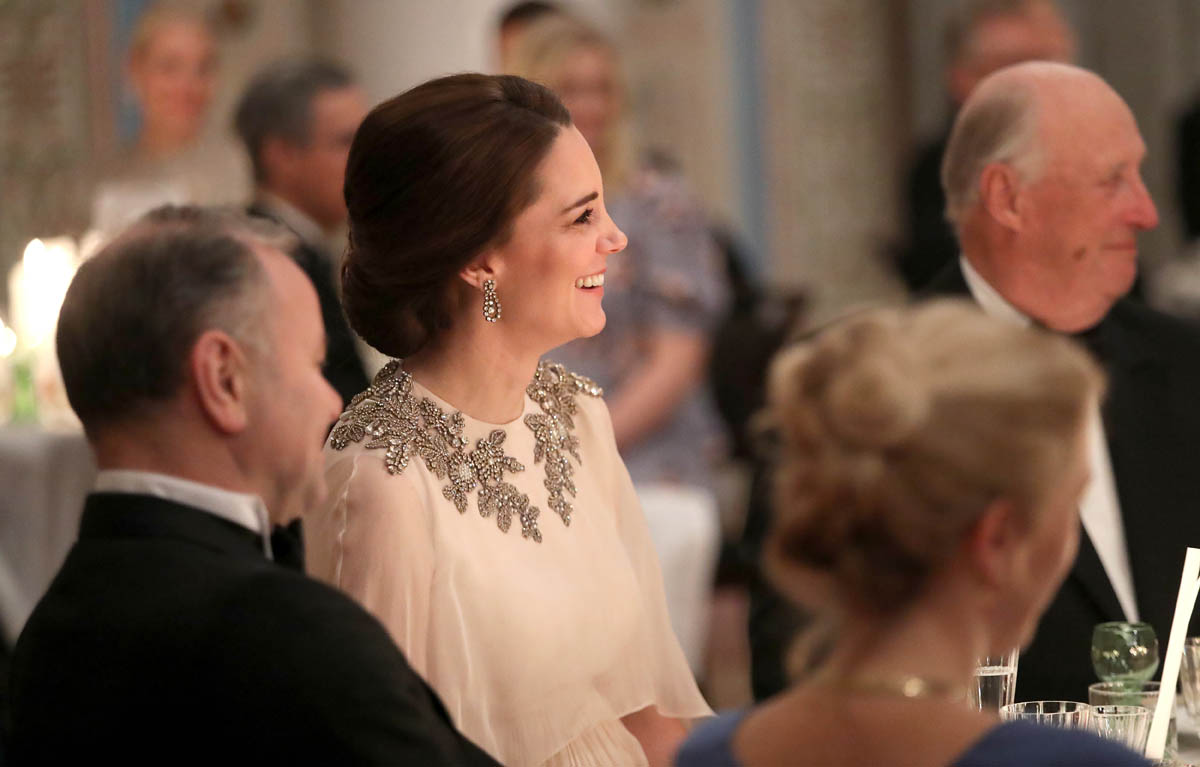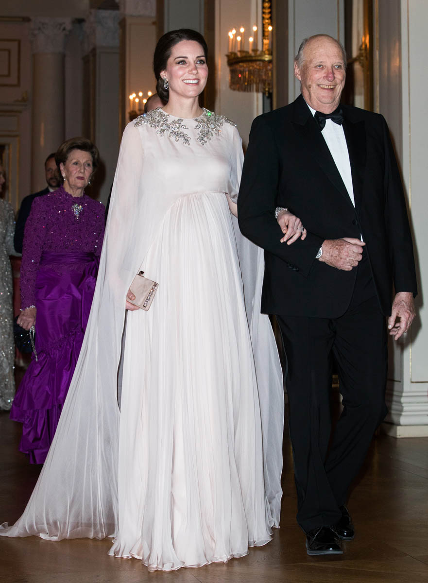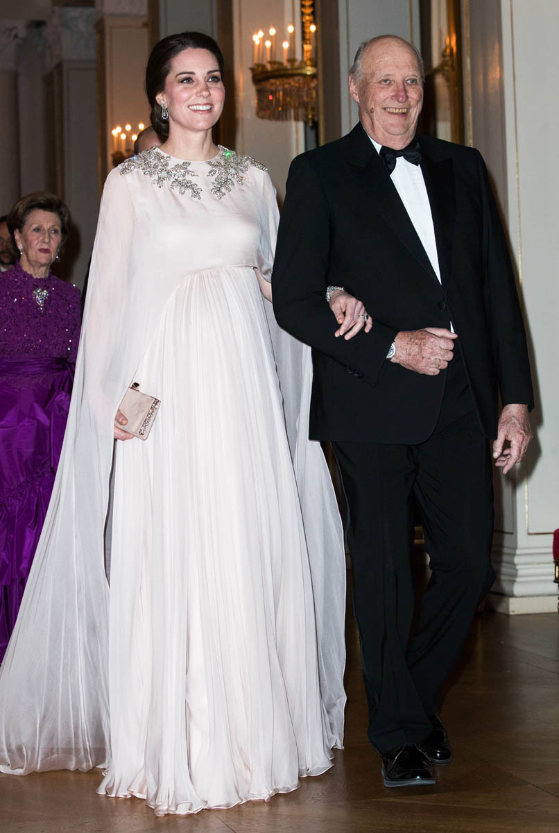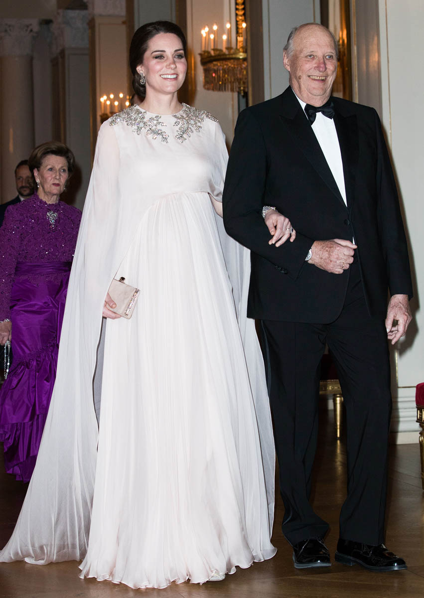 Prince William and Catherine attended a dinner at the Royal Palace in Oslo last night as part of their tour of Sweden and Norway. Kate wore a McQueen dress, embellished around the neckline, and caped around her shoulders. I like it. I’ve liked her entire wardrobe during this tour – the coats have been lovely, the two Erdem dresses she’s worn have been unexpectedly of the style moment, and this McQueen is so much better than that lace all that Jenny Packham lace business she usually favours.