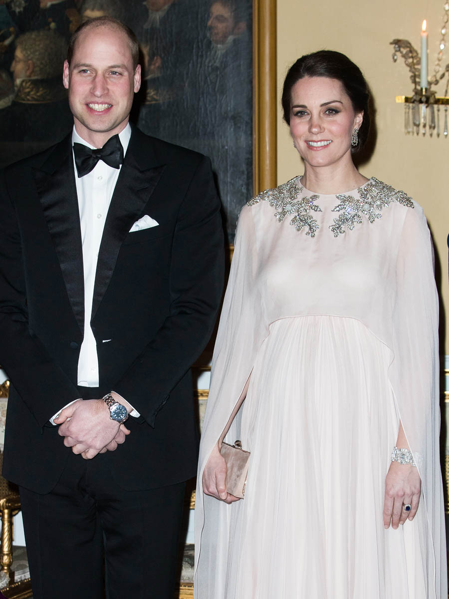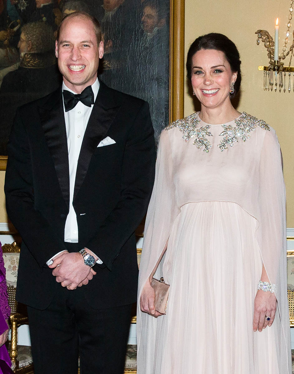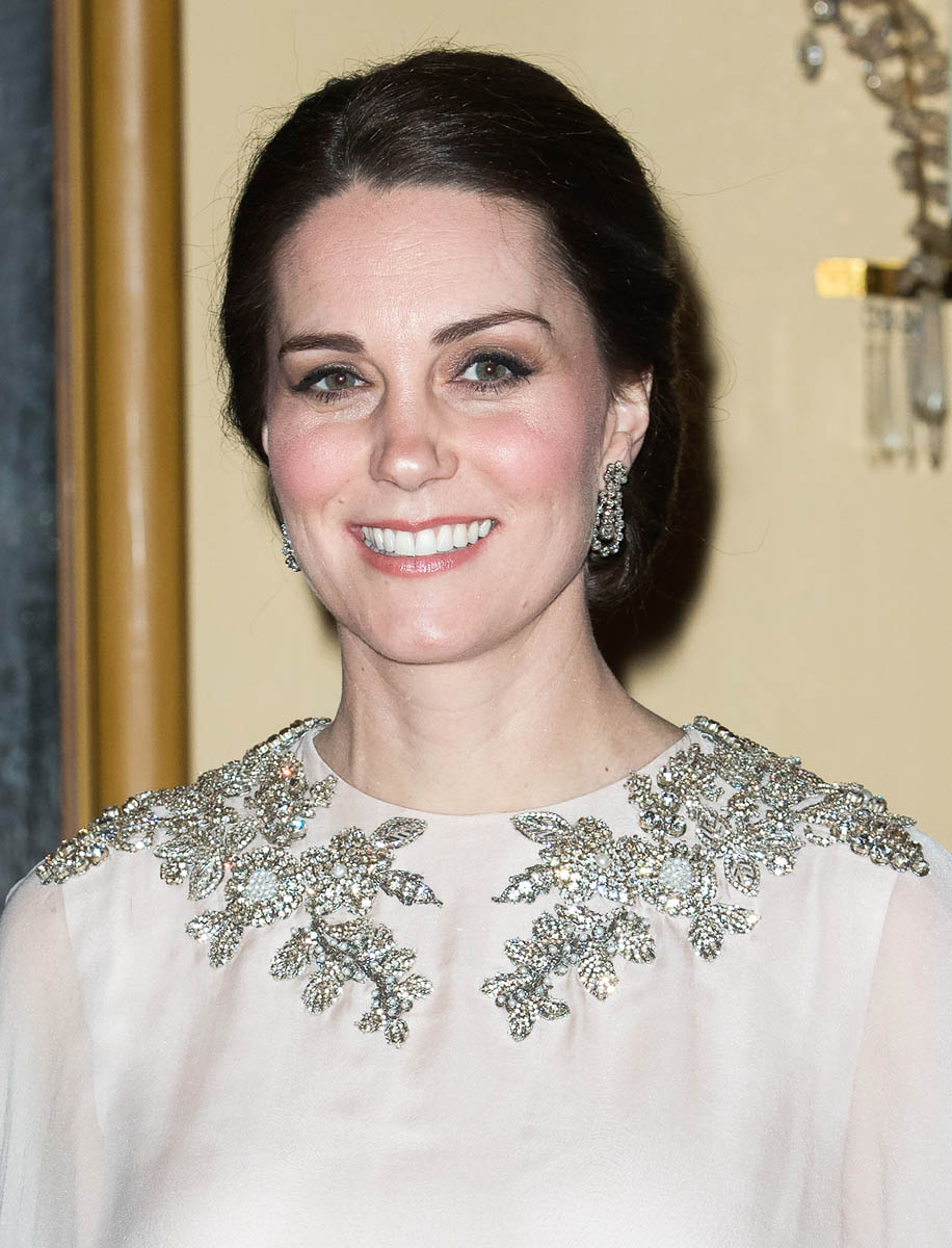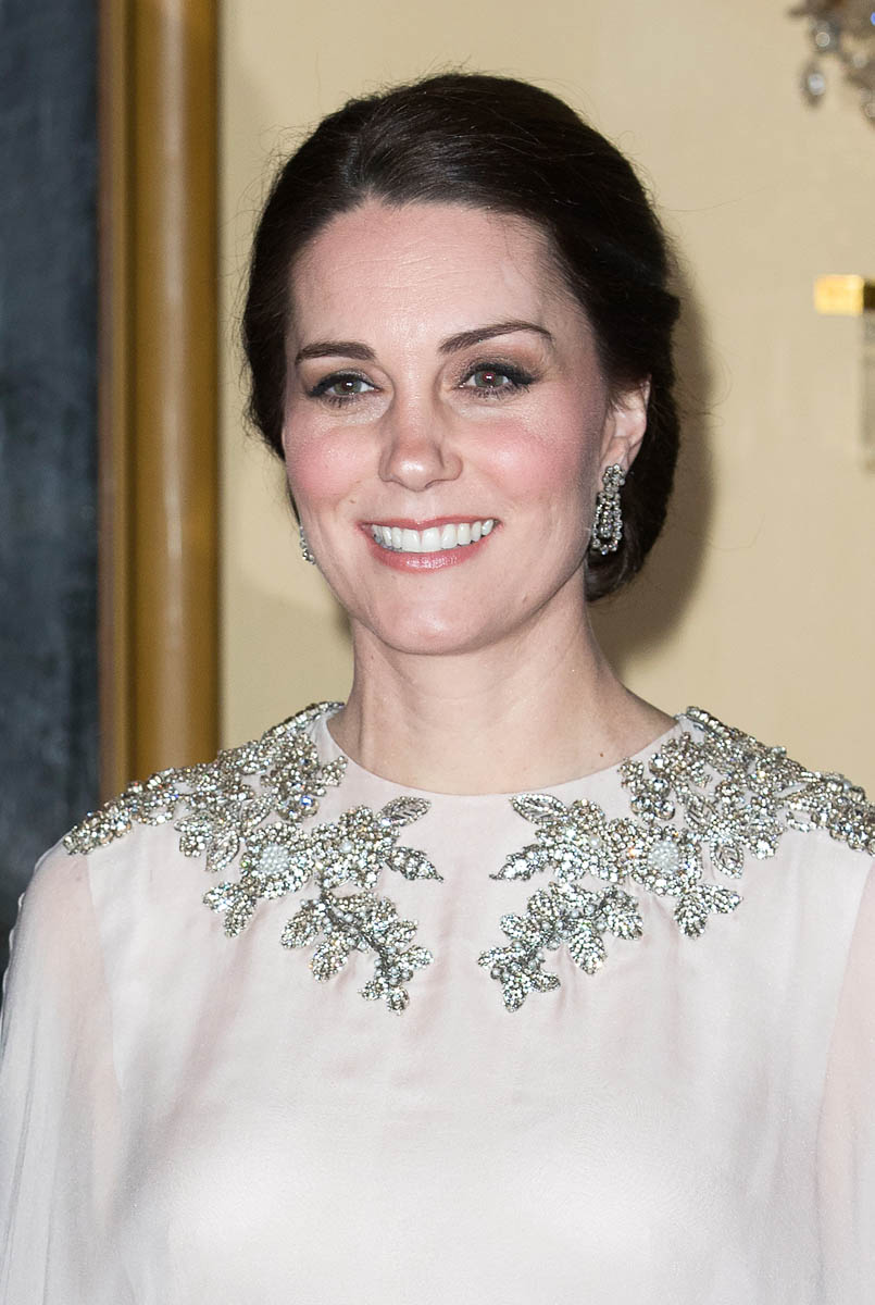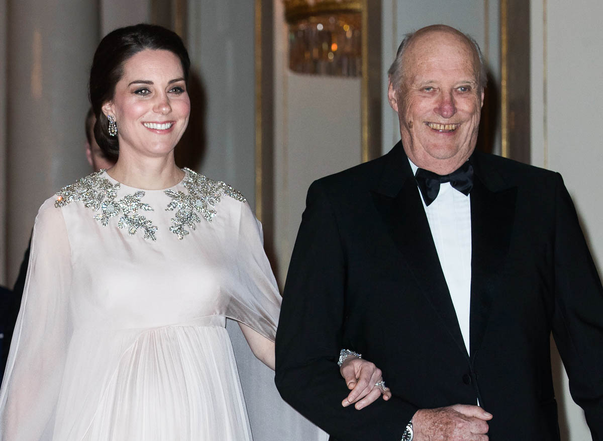 Prince William and Catherine attended a dinner at the Royal Palace in Oslo last night as part of their tour of Sweden and Norway. Kate wore a McQueen dress, embellished around the neckline, and caped around her shoulders. I like it. I’ve liked her entire wardrobe during this tour – the coats have been lovely, the two Erdem dresses she’s worn have been unexpectedly of the style moment, and this McQueen is so much better than that lace all that Jenny Packham lace business she usually favours.