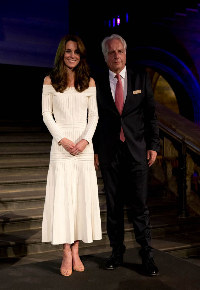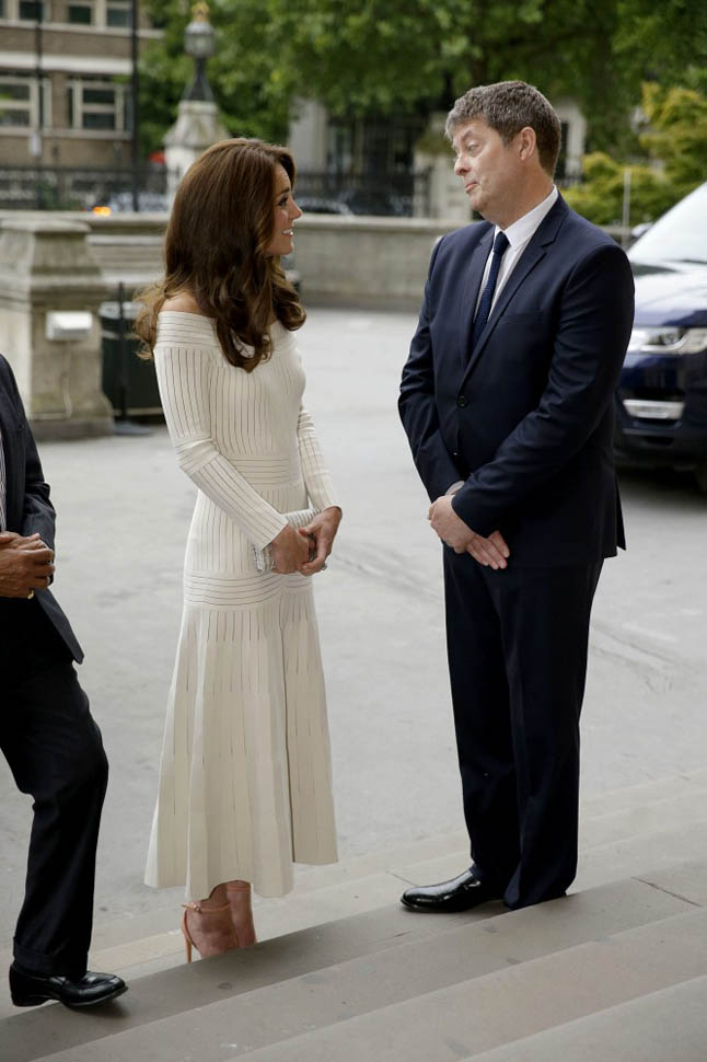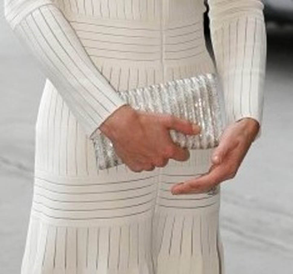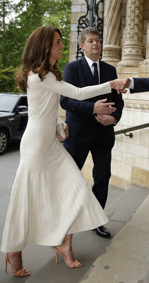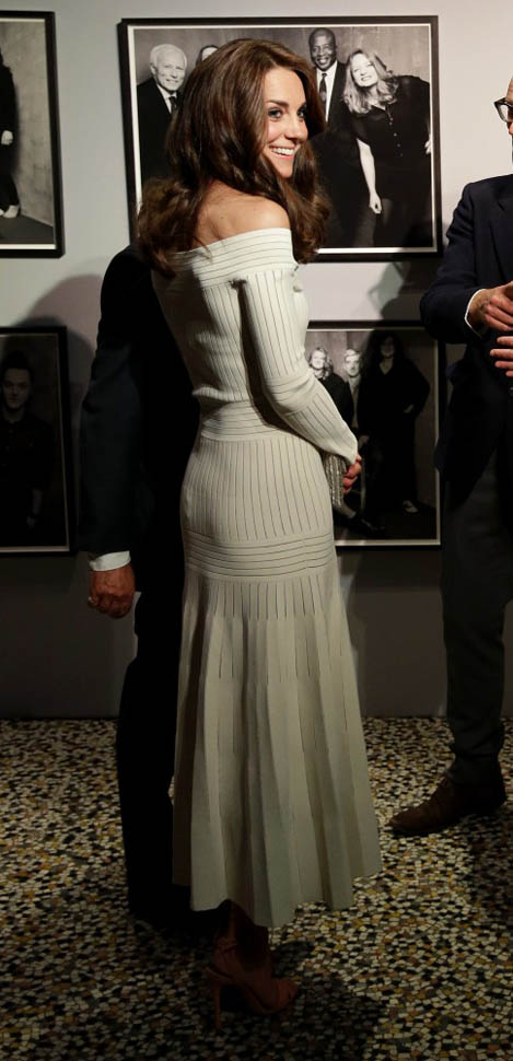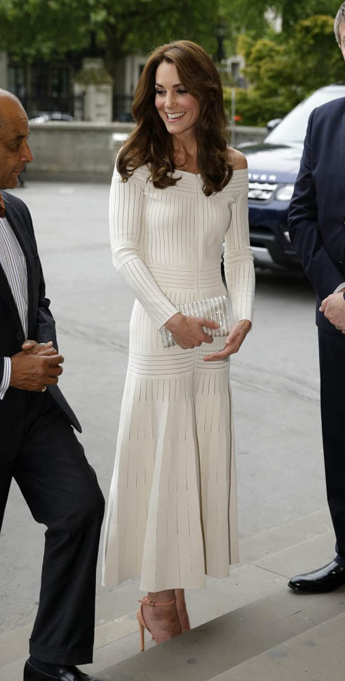 Princess Kate stepped out last night in a dress that …isn’t boring! Since it’s Kate though, she had to go too on the nose with the styling and match the strips on her dress to the strips on her clutch.