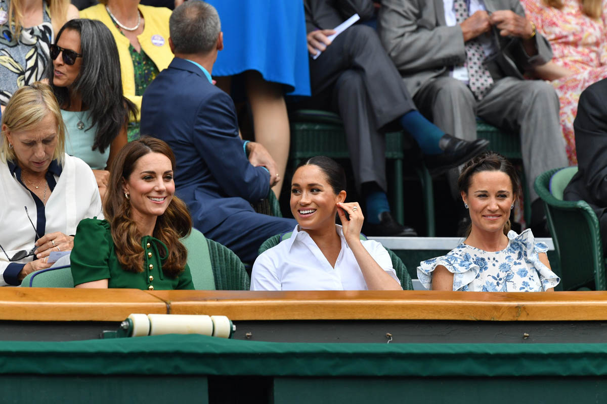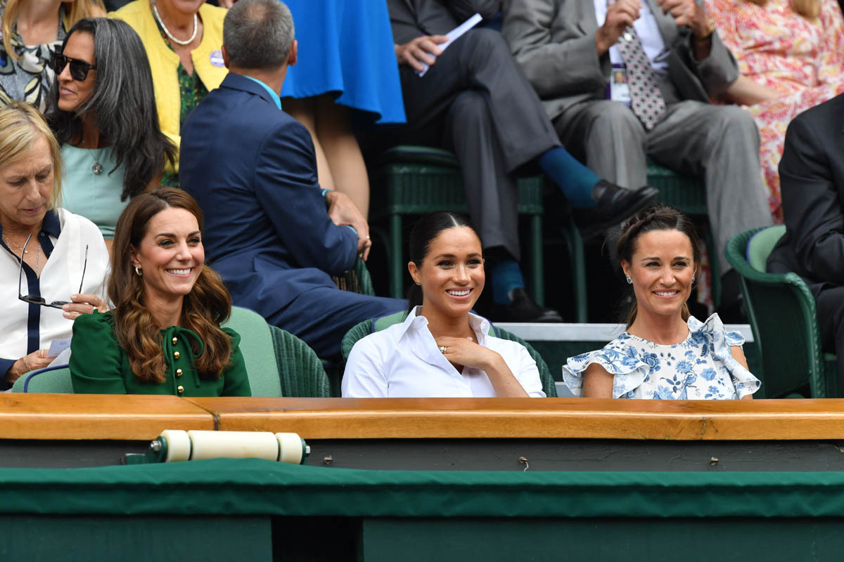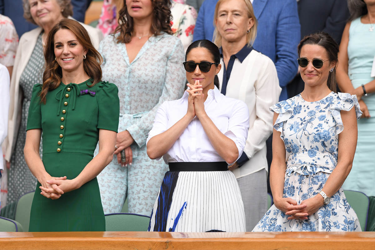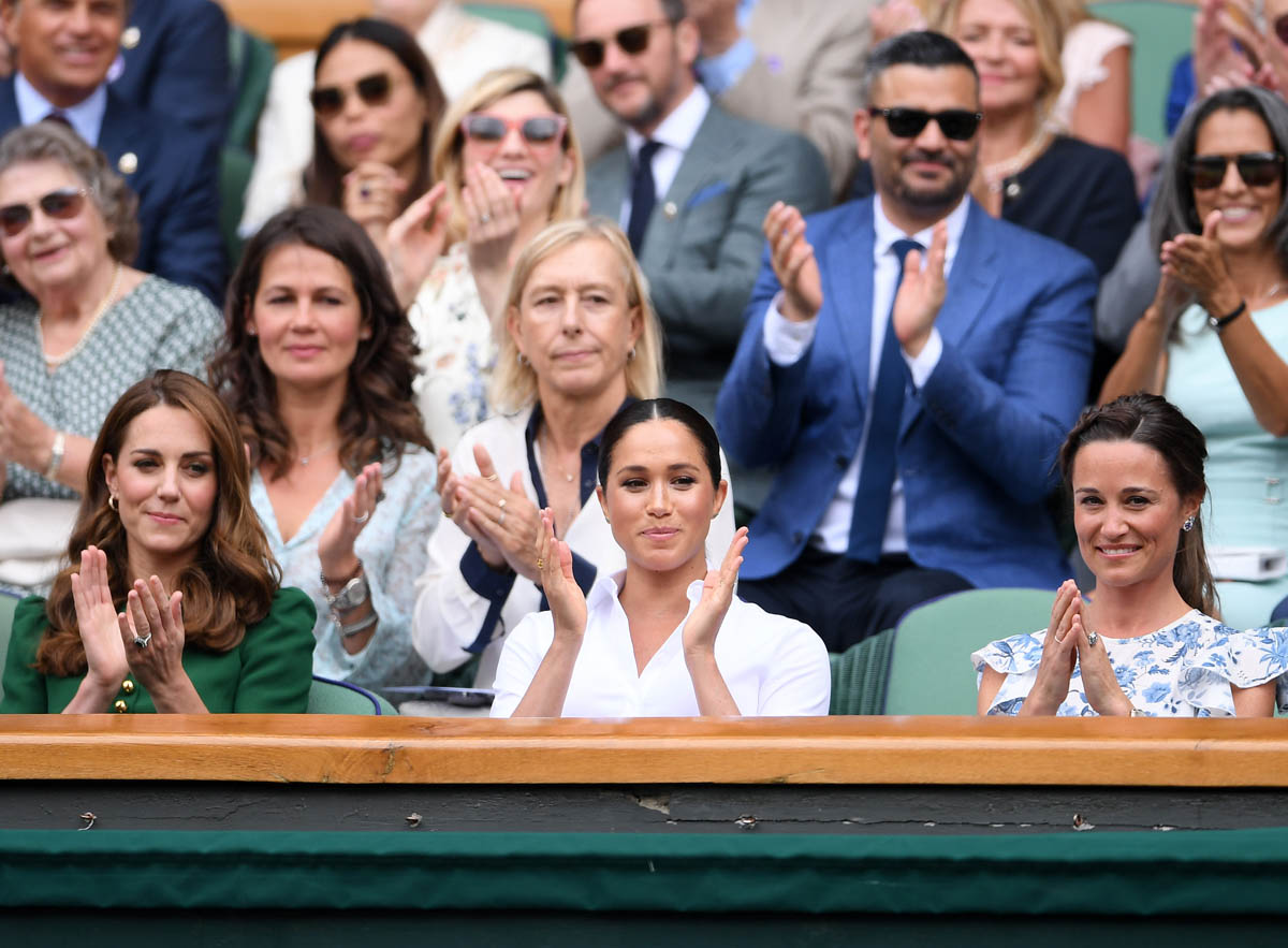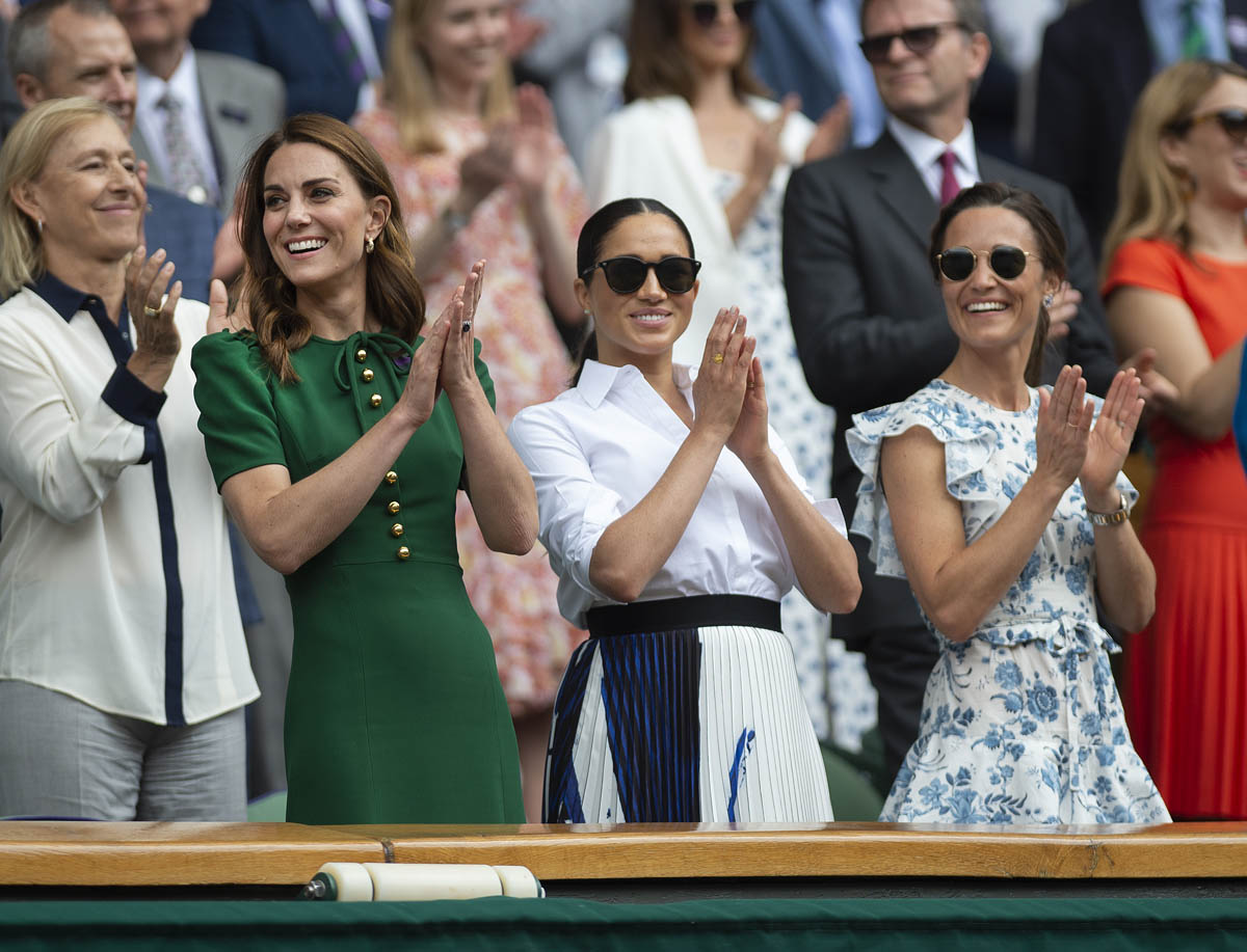 So we begin on Saturday, at Wimbledon, the women’s final featuring Serena Williams and Simona Halep, with Simona (who played lights out, good for her) taking the title. Princess Kate and Royal Meghan were there last year too on this day, seated in the royal box. This year Pippa came along and they looked like they all got on well, big smiles on their faces, sharing warm asides with each other, turning back to talk to Martina Navratilova, so here we are, twice in one week, Meghan and Kate are rebuilding the connection between House Sussex and House Cambridge with matching posts on Instagram: