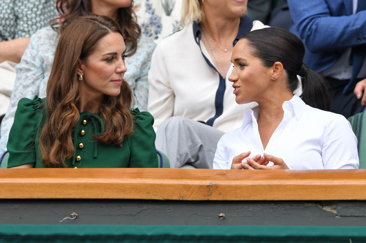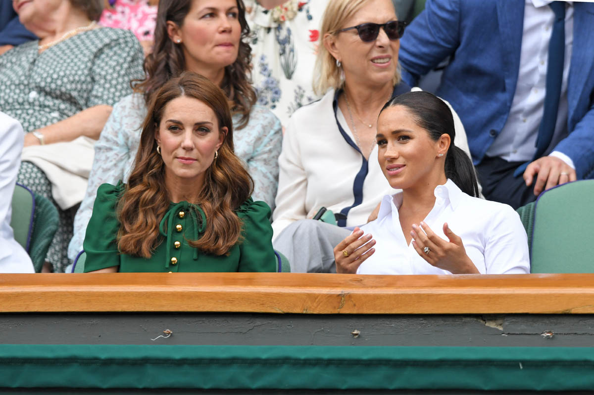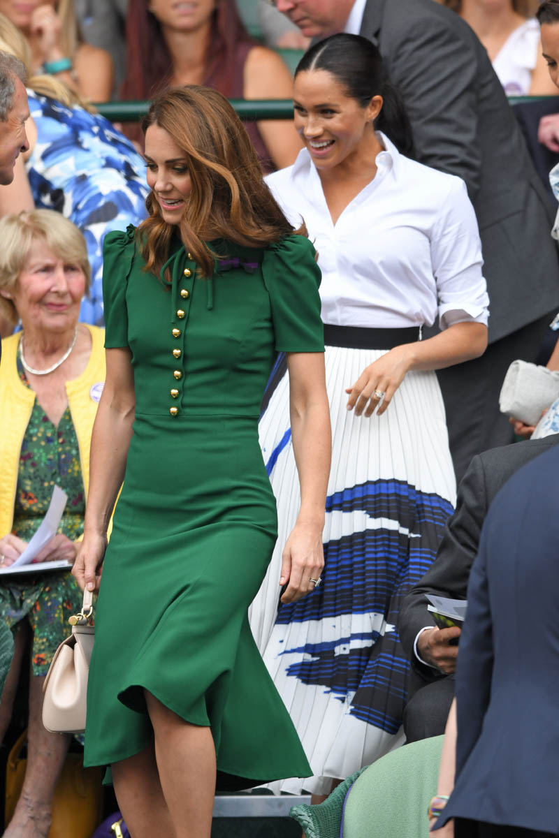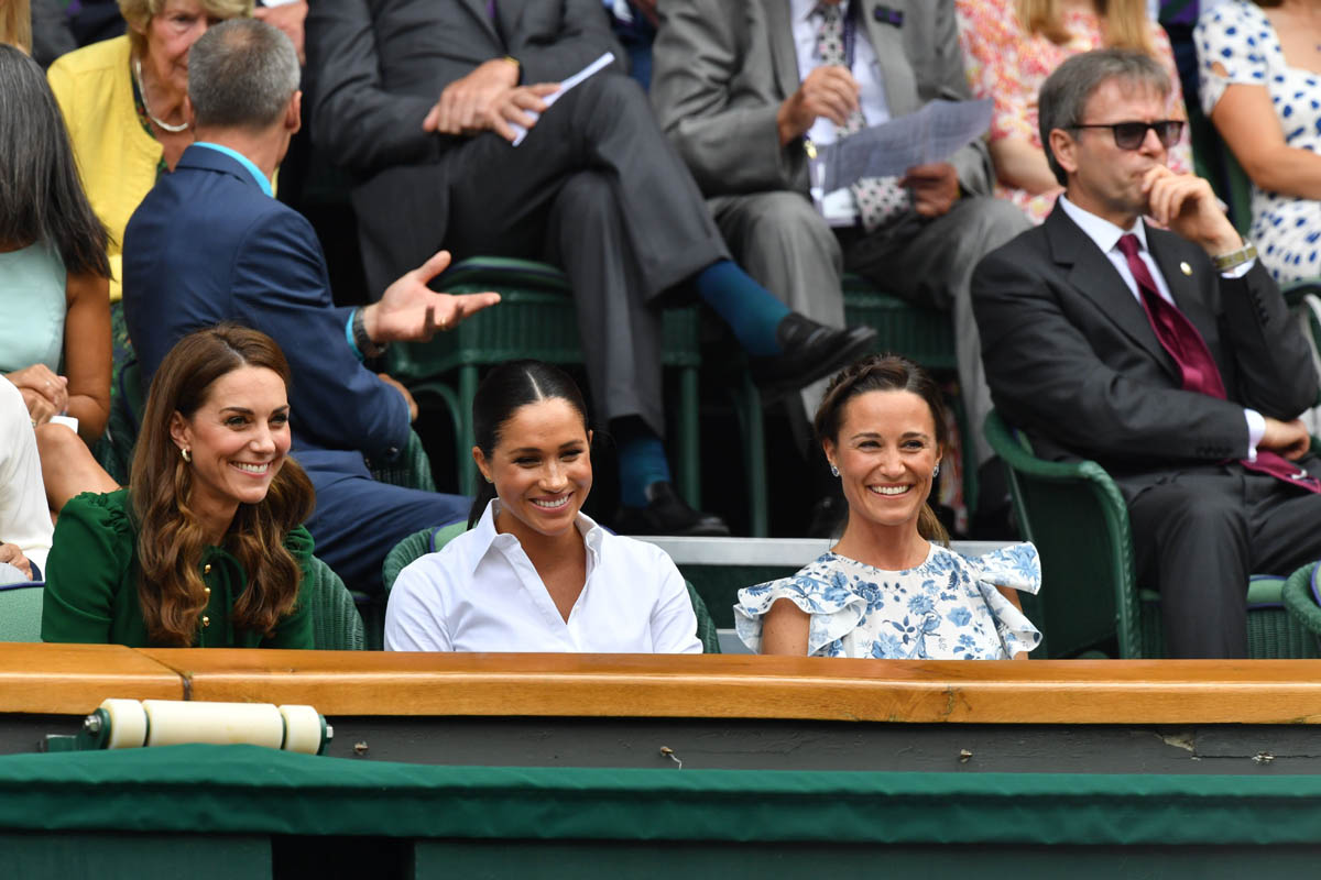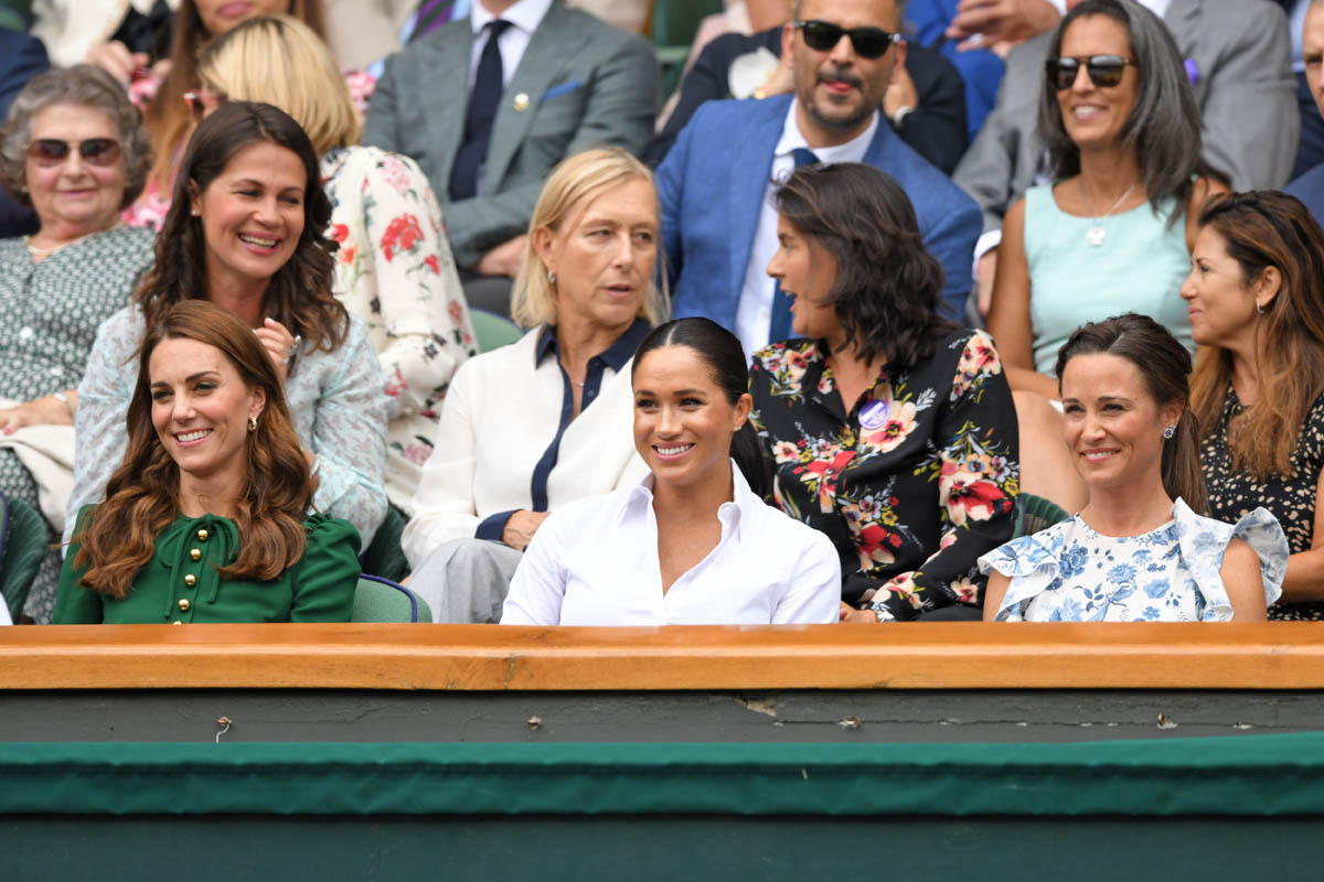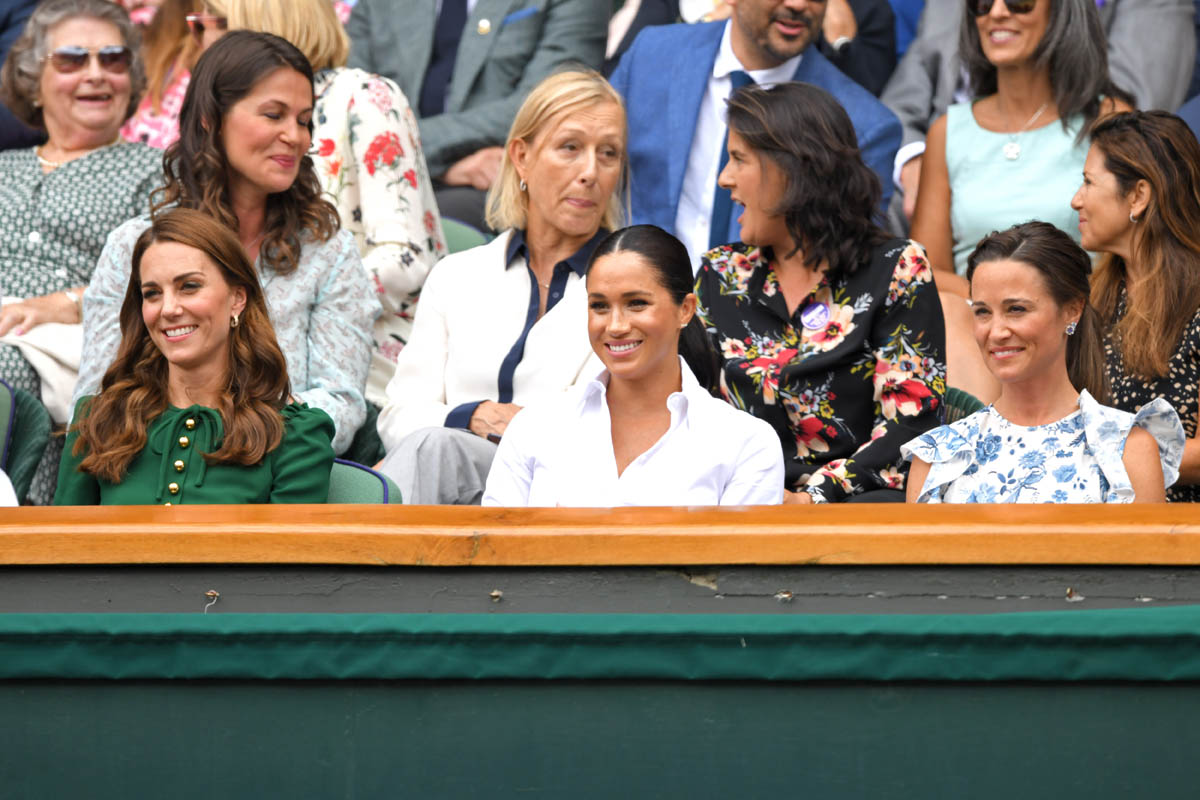 So we begin on Saturday, at Wimbledon, the women’s final featuring Serena Williams and Simona Halep, with Simona (who played lights out, good for her) taking the title. Princess Kate and Royal Meghan were there last year too on this day, seated in the royal box. This year Pippa came along and they looked like they all got on well, big smiles on their faces, sharing warm asides with each other, turning back to talk to Martina Navratilova, so here we are, twice in one week, Meghan and Kate are rebuilding the connection between House Sussex and House Cambridge with matching posts on Instagram: