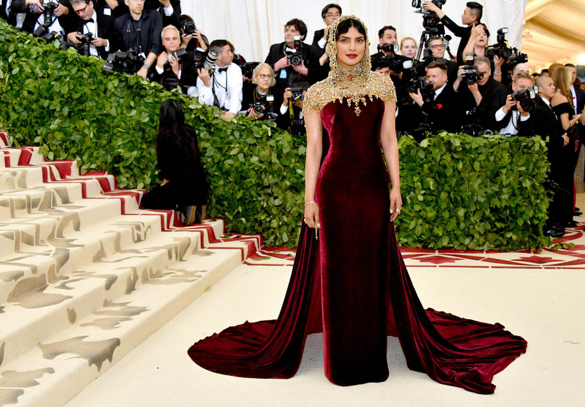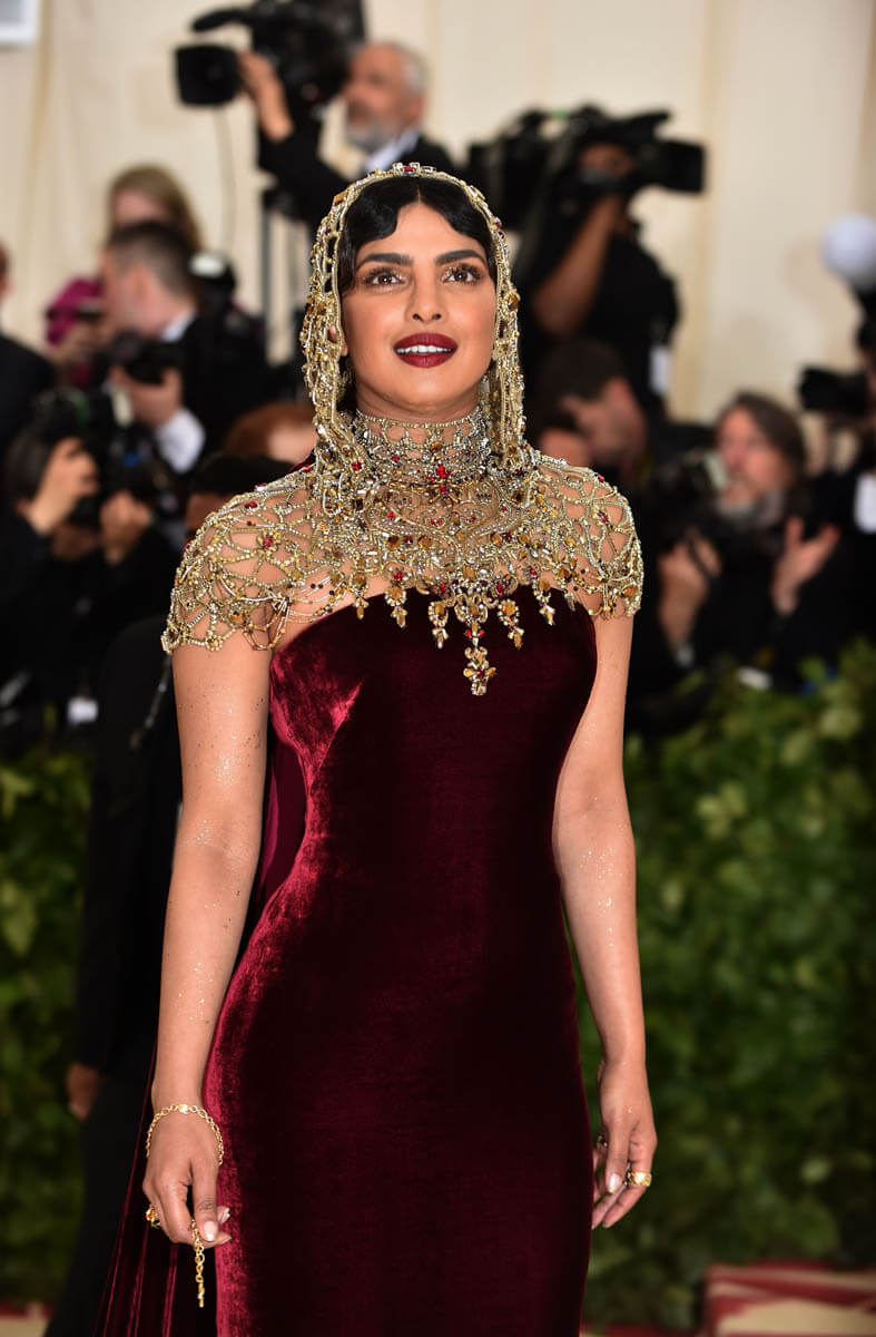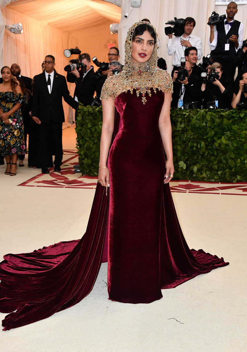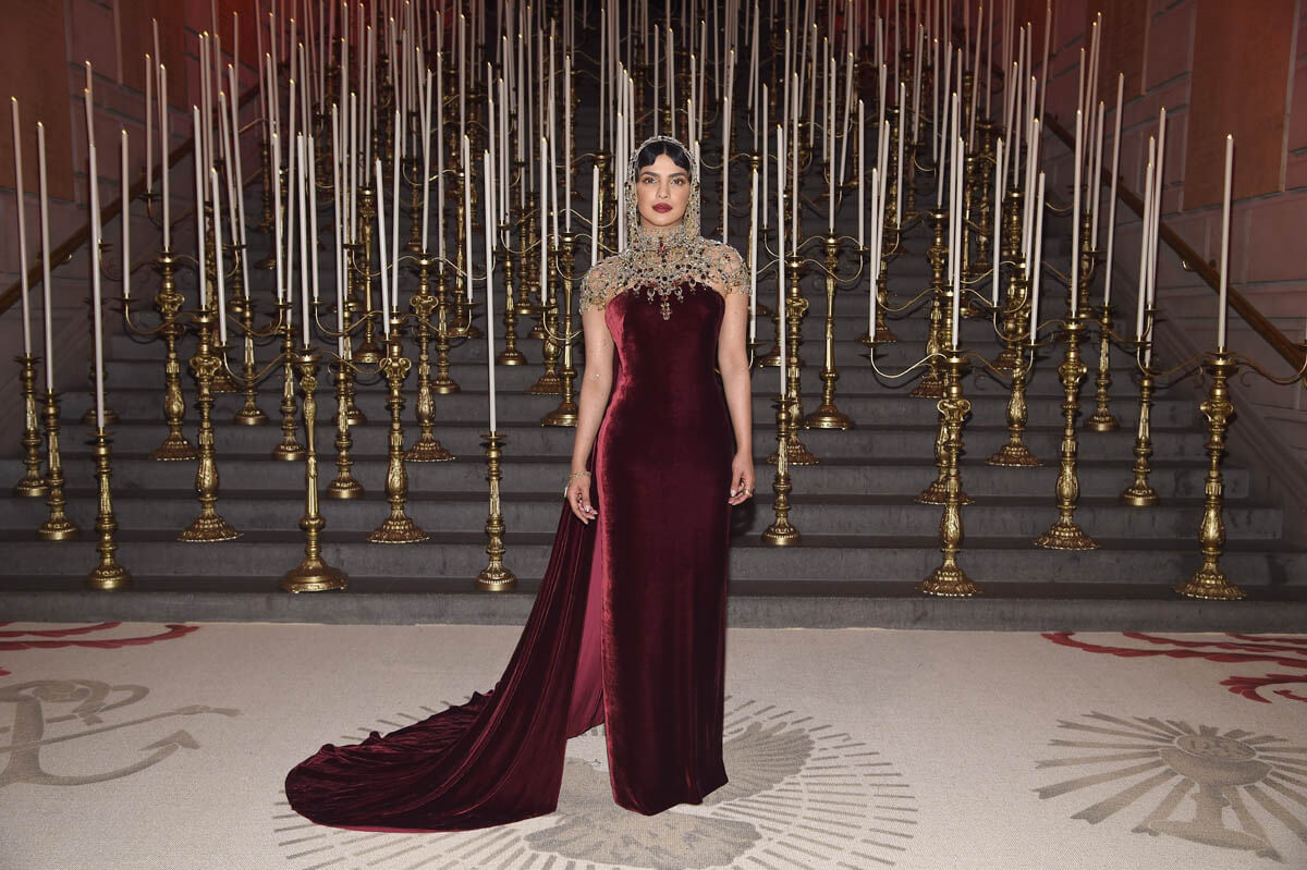 Now that is a statement. It’s SO f-cking good. And it’s exactly what a headpiece can do for an otherwise not-that-remarkable dress. Yes, it’s velvet in a colour that is deluxe as f-ck on her. But, really, it’s just a strapless Ralph Lauren. Not all that special until the headpiece comes on. With the headpiece, this becomes a Moment. I love how gently it falls around her face, suggesting that despite how decorative it is, there’s movement here. There’s a softness to how it wears. And of course I love how where it’s placed – perfectly back off her hairline, with her hair pressed flat to her forehead in waves that almost, subtly, mimic the way the headpiece might undulate ever so slightly by her chin. Every decision here is the right one – the eye makeup is gorgeous, the eyebrows, GOD those eyebrows, and the lip colour, thank you, Priyanka, for not being afraid of a dark lip despite the darkness of the dress. The more I look at this the better it gets.