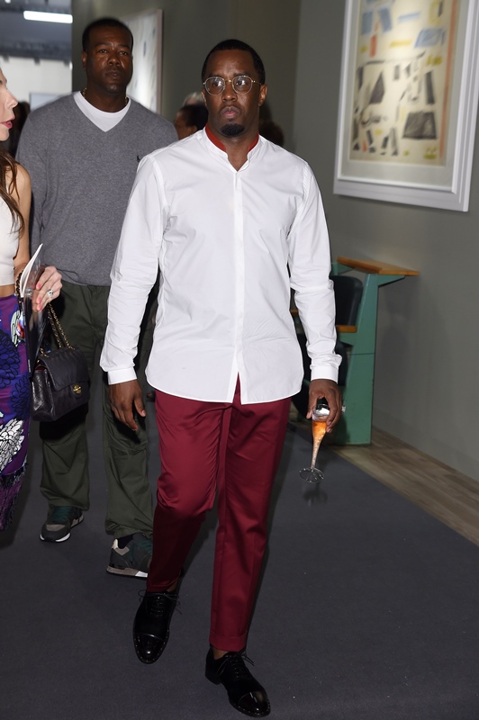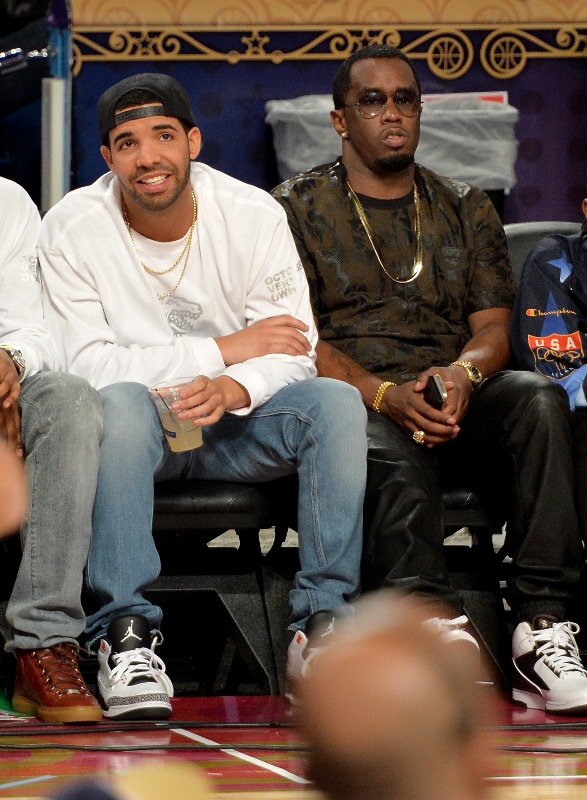 Here are Drake and Puffy earlier this year at the NBA All Star Game in happier times. And attached – Diddy walking around Miami Art Basel not offending anyone with his fashion, for a change.