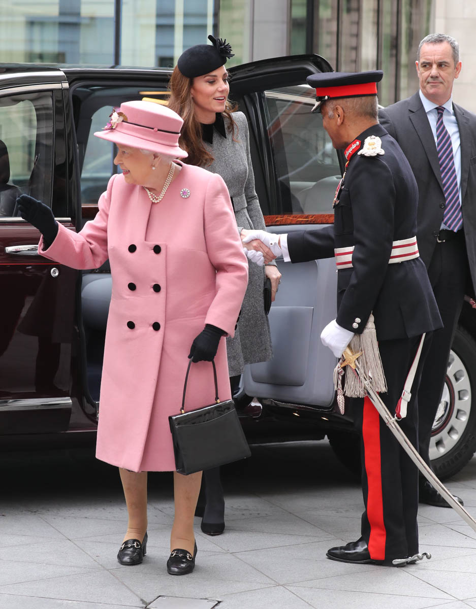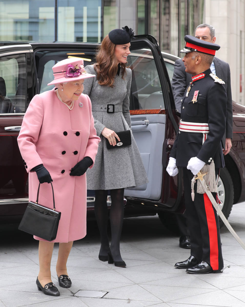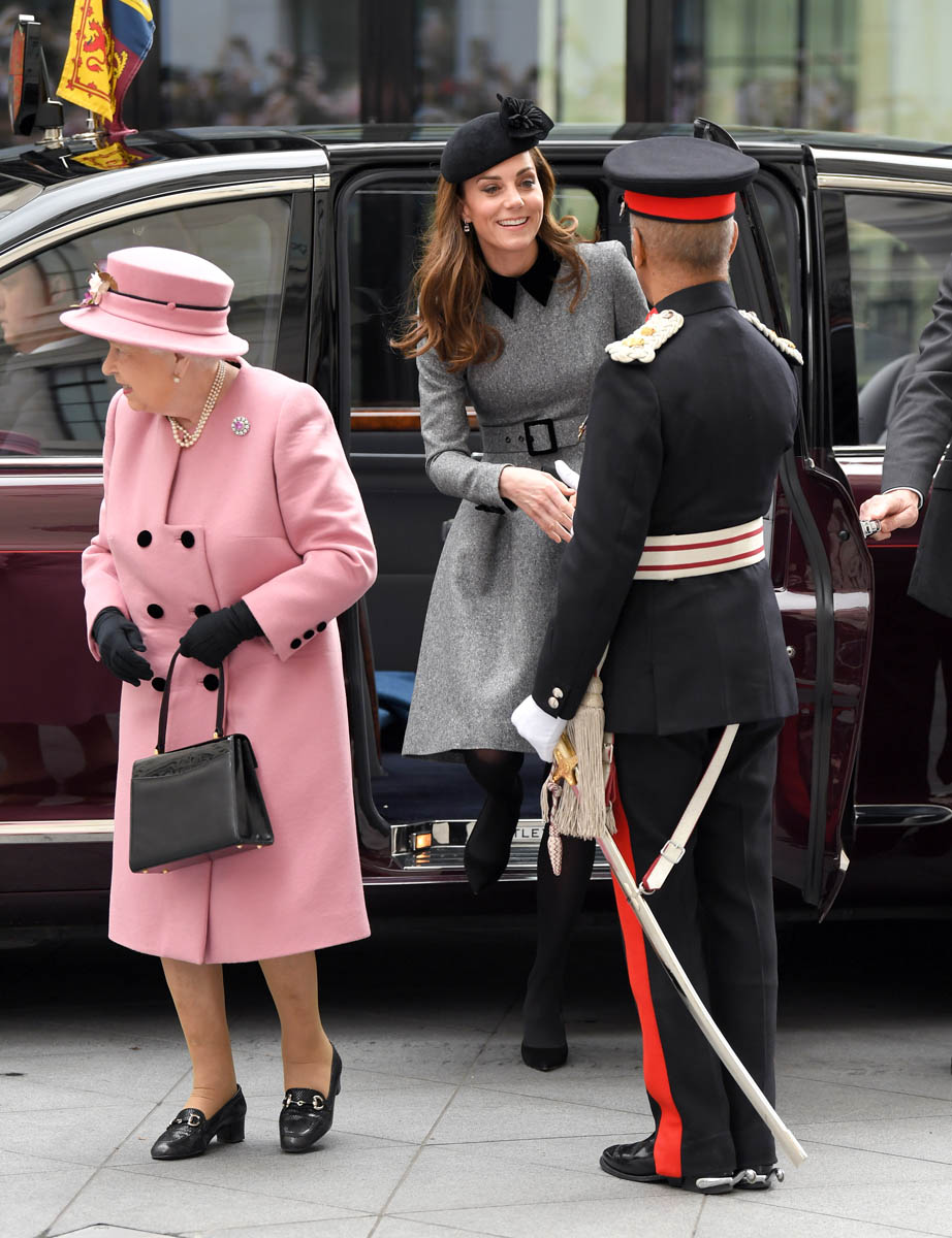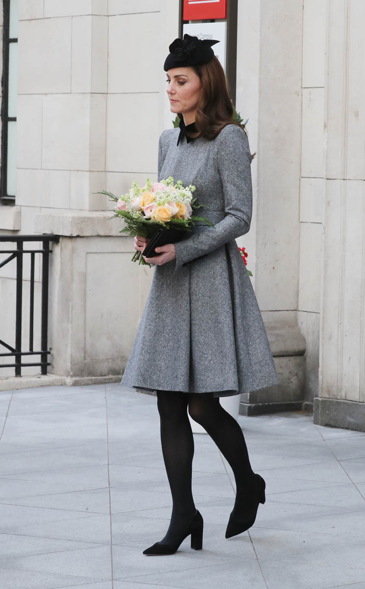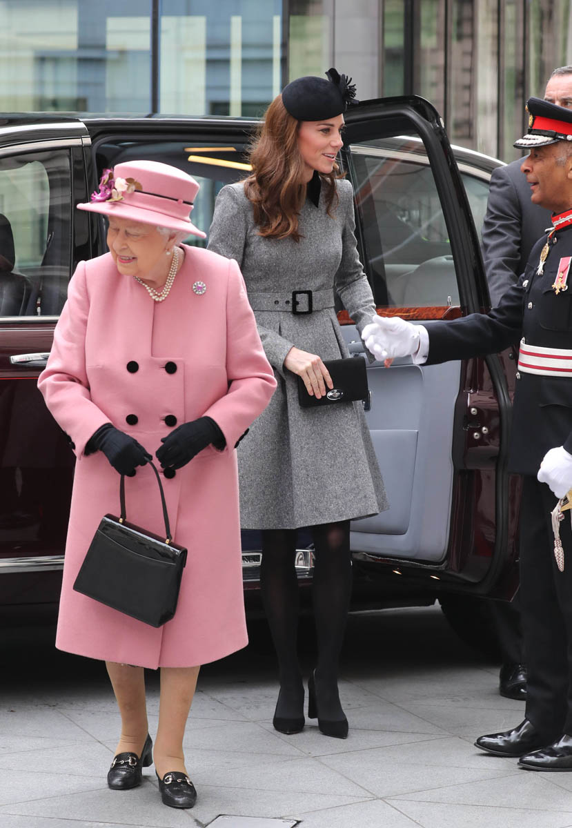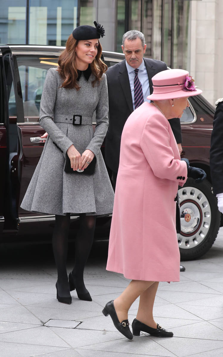Kate wore a grey Catherine Walker dress coat. Really like the black collar, it’s a good look on her. Nothing super exciting but well-tailored, fits perfectly, will definitely be re-worn later. And totally suitable for the occasion. Grey is exactly where you want to be when you’re with Her Majesty in pink.