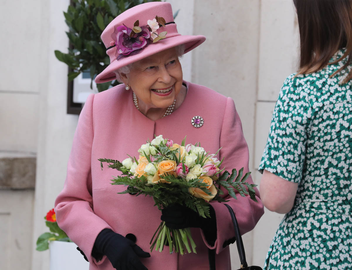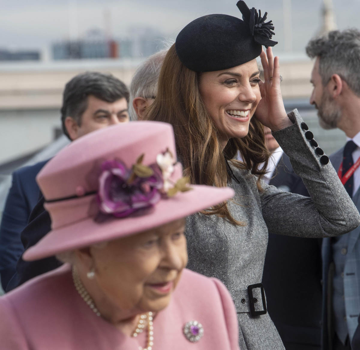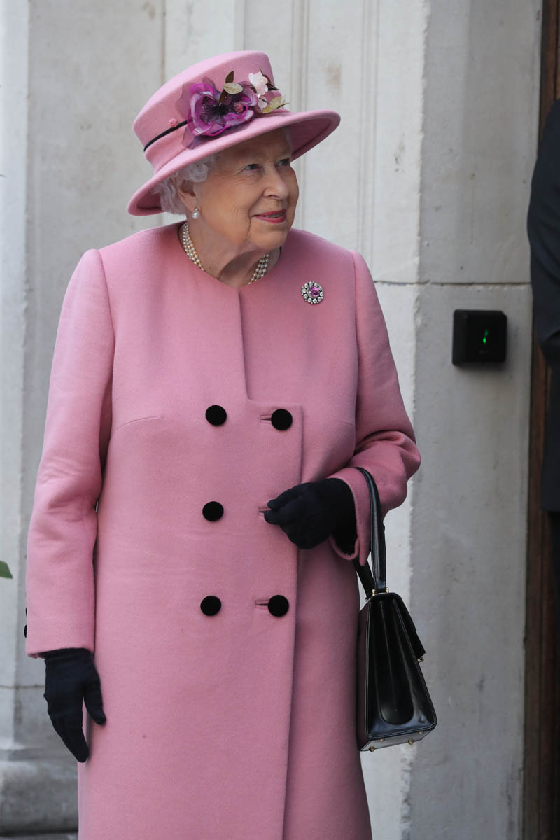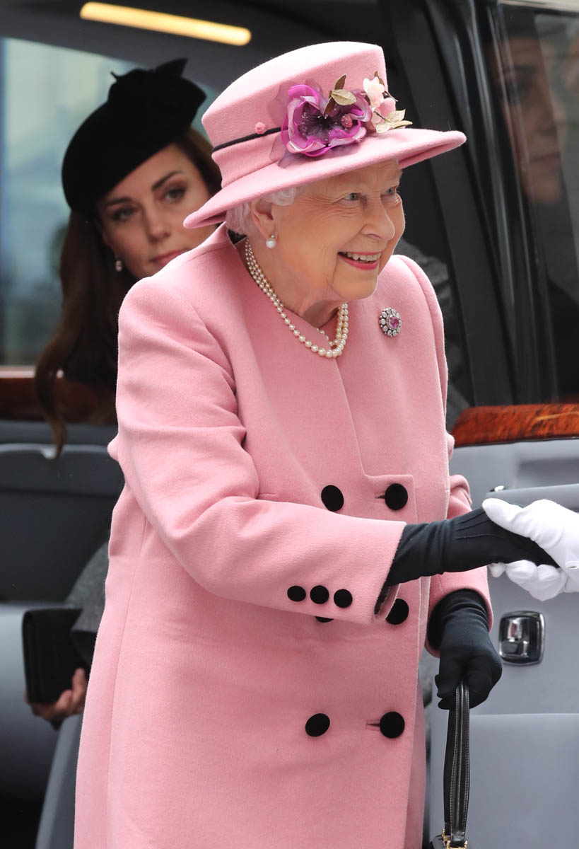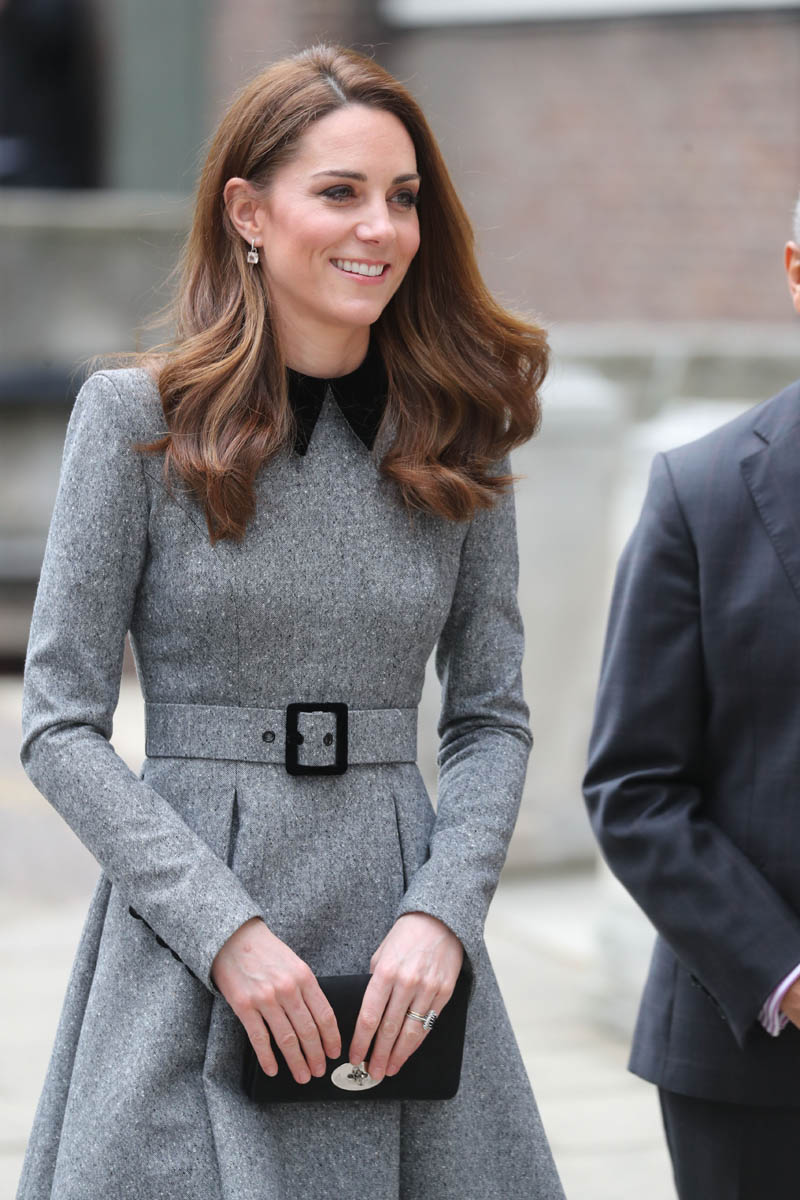 Kate wore a grey Catherine Walker dress coat. Really like the black collar, it’s a good look on her. Nothing super exciting but well-tailored, fits perfectly, will definitely be re-worn later. And totally suitable for the occasion. Grey is exactly where you want to be when you’re with Her Majesty in pink.