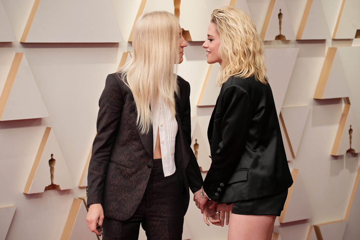 And certainly not with one of the Best Actress nominees. Kristen Stewart arrived with her fiancée Dylan Meyer. They wore matching outfits, open white shirts under black blazers, all Chanel, of course. They coordinated their blonde hair. They held hands. They kissed before Dylan left Kristen to pose at the photo wall.