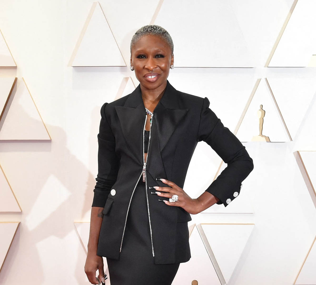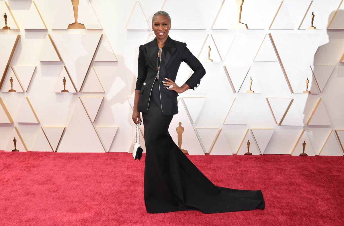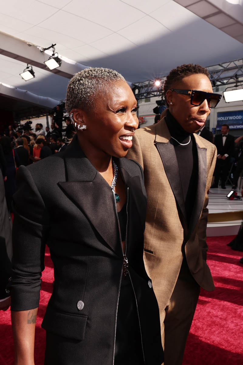 Next – Cynthia Erivo and Lena Waithe, also coordinated in their own way. Cynthia’s in Louis Vuitton, a longer jacket half-zipped over a bra with a long skirt. We’re playing with proportions here and it’s exactly the right balance. Also, you cannot go wrong with that necklace, WOW.