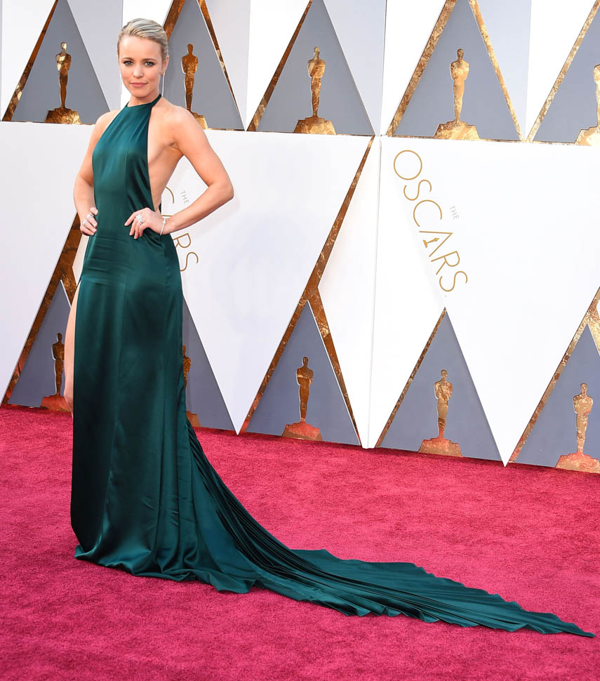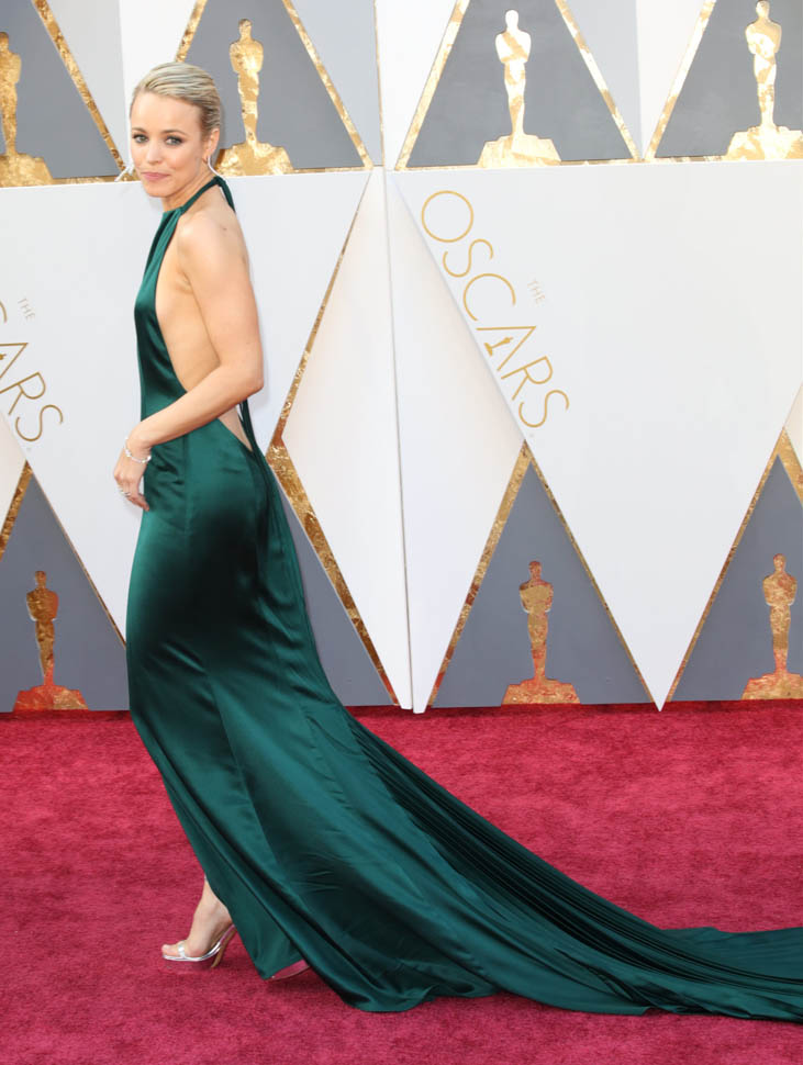 Rachel, by the way, like Jennifer Lawrence and Brie Larson and Kerry Washington and etc etc etc, all those major Hollywood players, changed for the Vanity Fair after-party. The second dress was a really gross pink. And sparkly. So, not that much better.