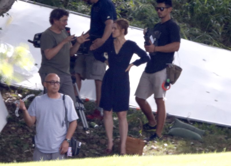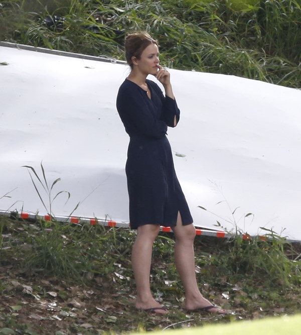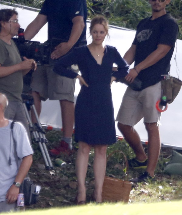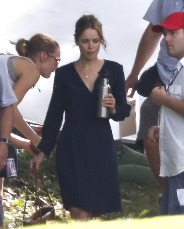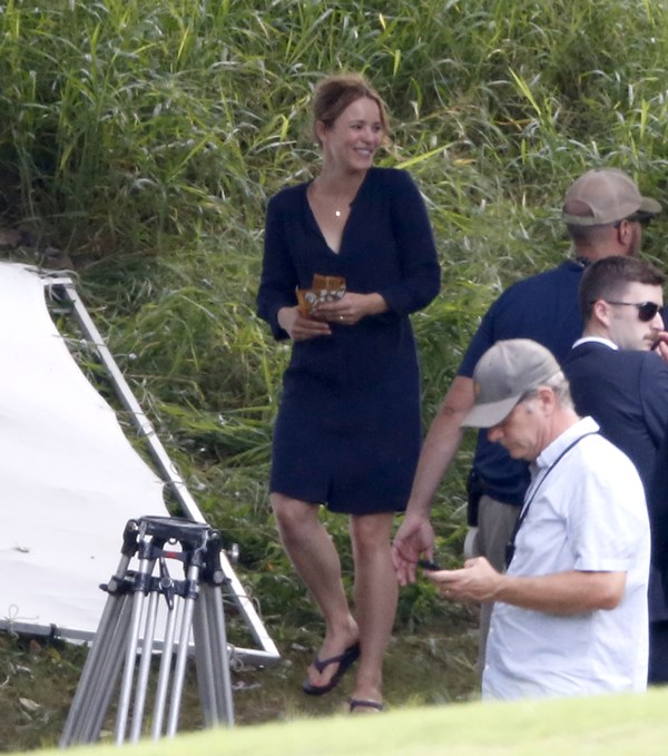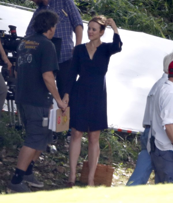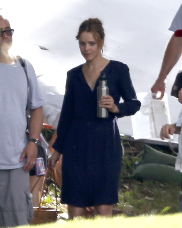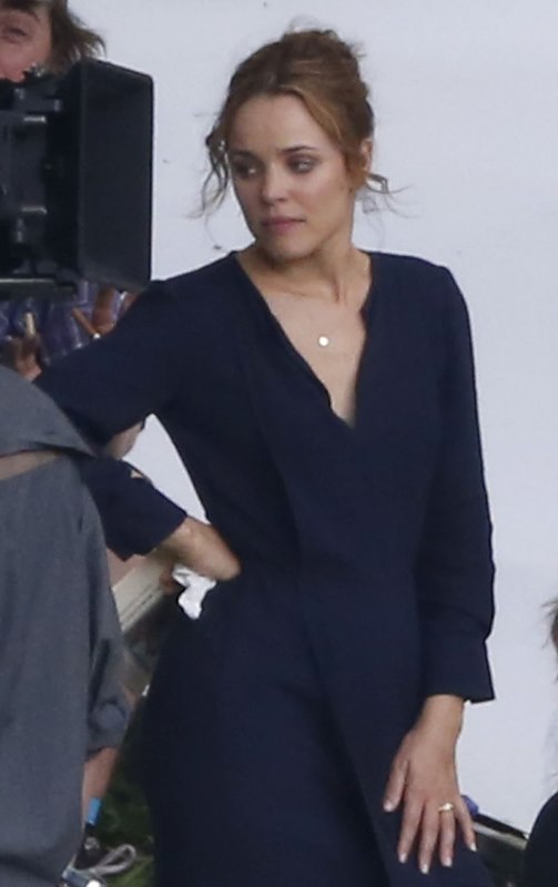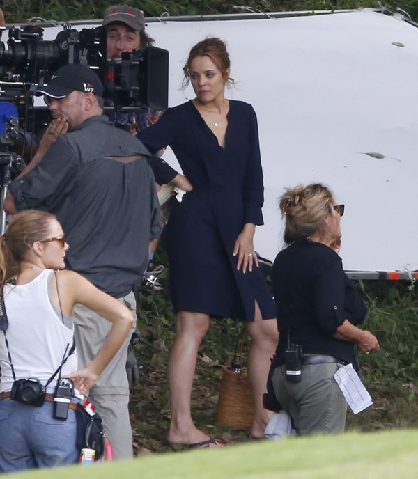 Only, as I mentioned yesterday in my dick-deflating post, Rachel’s been in Hawaii shooting a movie and no one has seen him there. Here she is though on set yesterday looking lovely and happy, which means she must have just received a text from him because he texts her all the time – he texted her every day for a year! It wasn’t over. It still isn’t over!