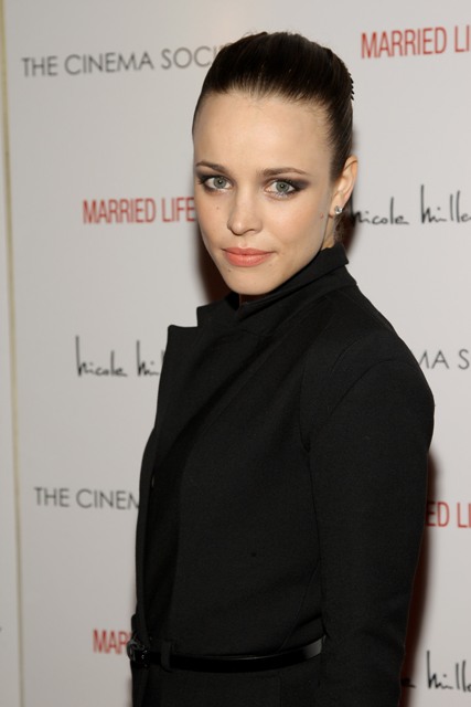 Rachel McAdams at the premiere of Married Life last night – a departure from her soft prettiness, pulled back into severity. Don’t know if it’s her most flattering look but love the experimentation and am all over that little dress. Especially the way it accentuates her little waist. Not crazy about the shoes – too clunky at the heel – they do nothing for her legs.