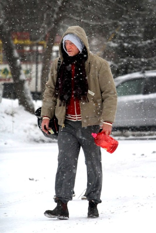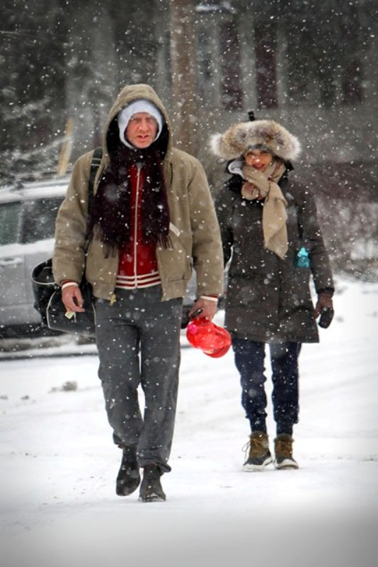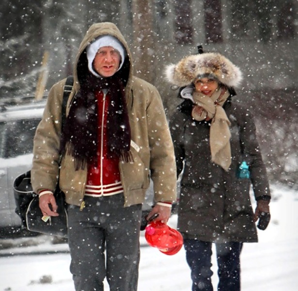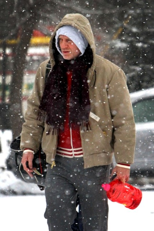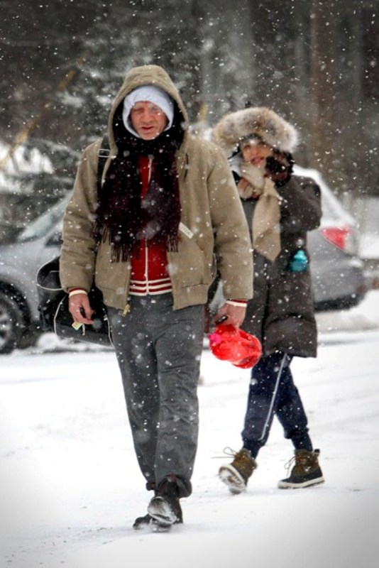 Here are Rachel Weisz and Daniel Craig yesterday heading to the gym in heavy snow in New York instead of ordering up Sandra Bullock’s While You Were Sleeping, eating bread and tomato bisque, and watching from under the covers.