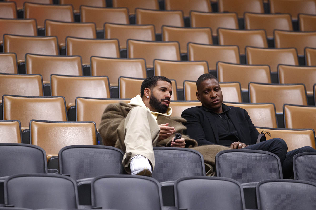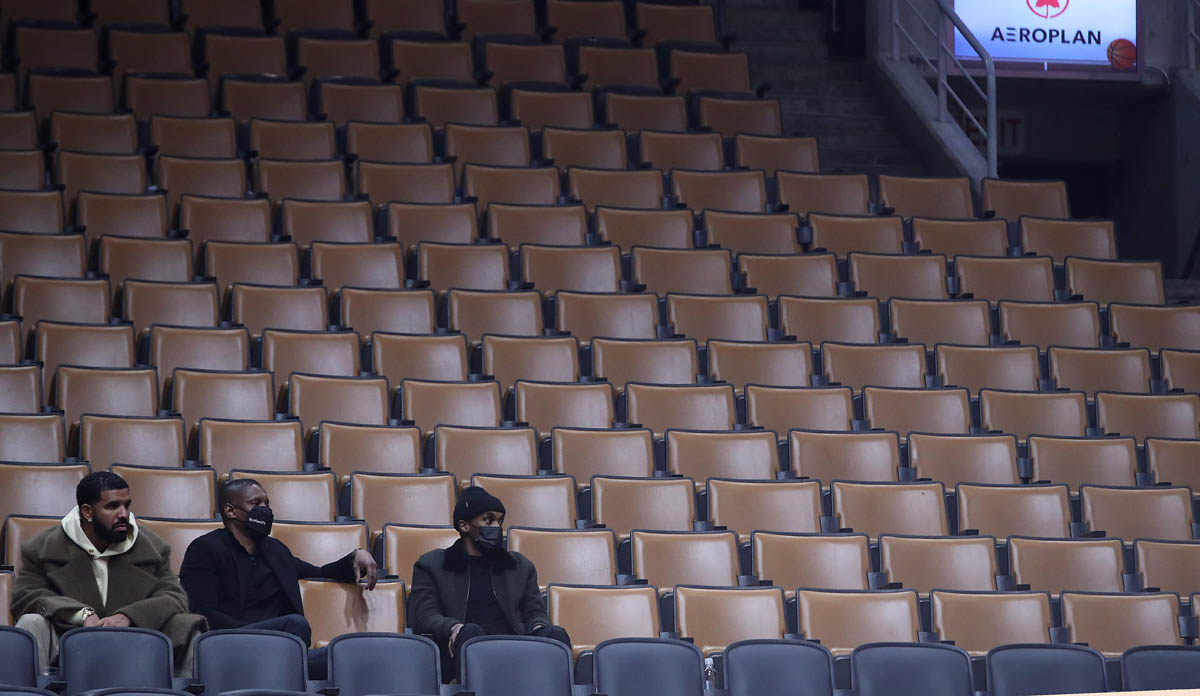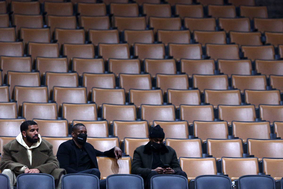 Drake was there to watch the Raptors host the Miami Heat last night – and win – and was seated at one point with Raptors team president Masai Ujiri in the empty stands. He also spent time at his regular seat on the court.