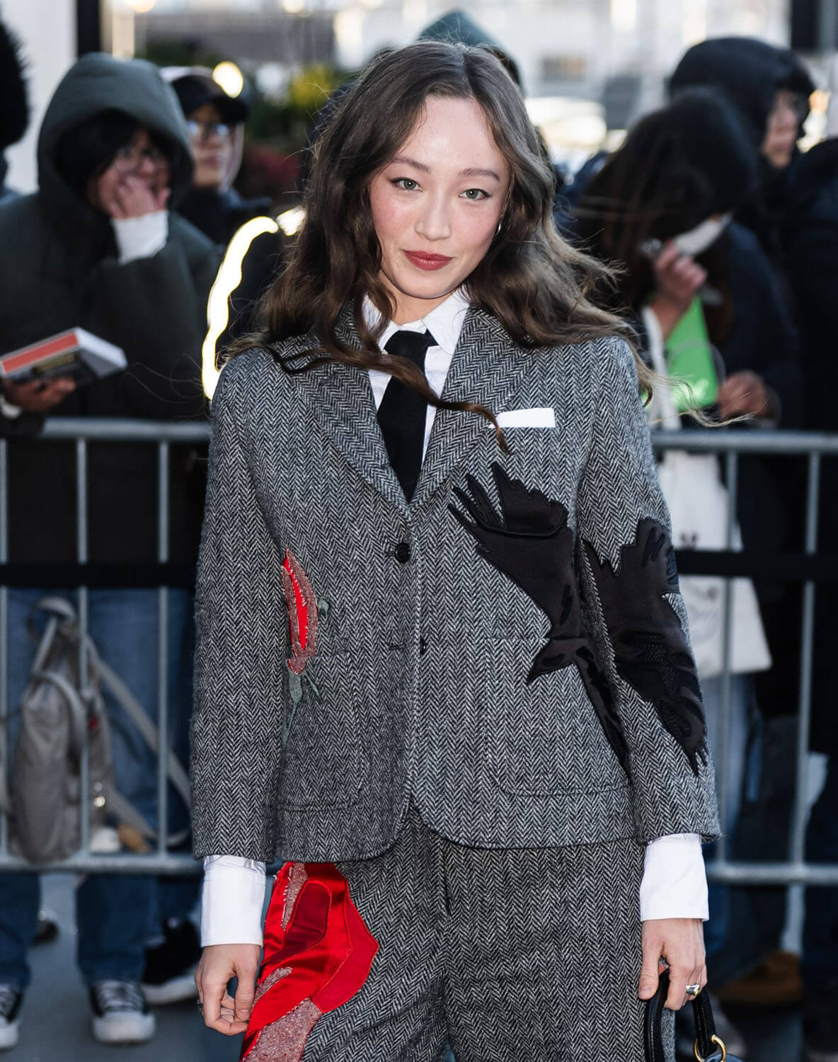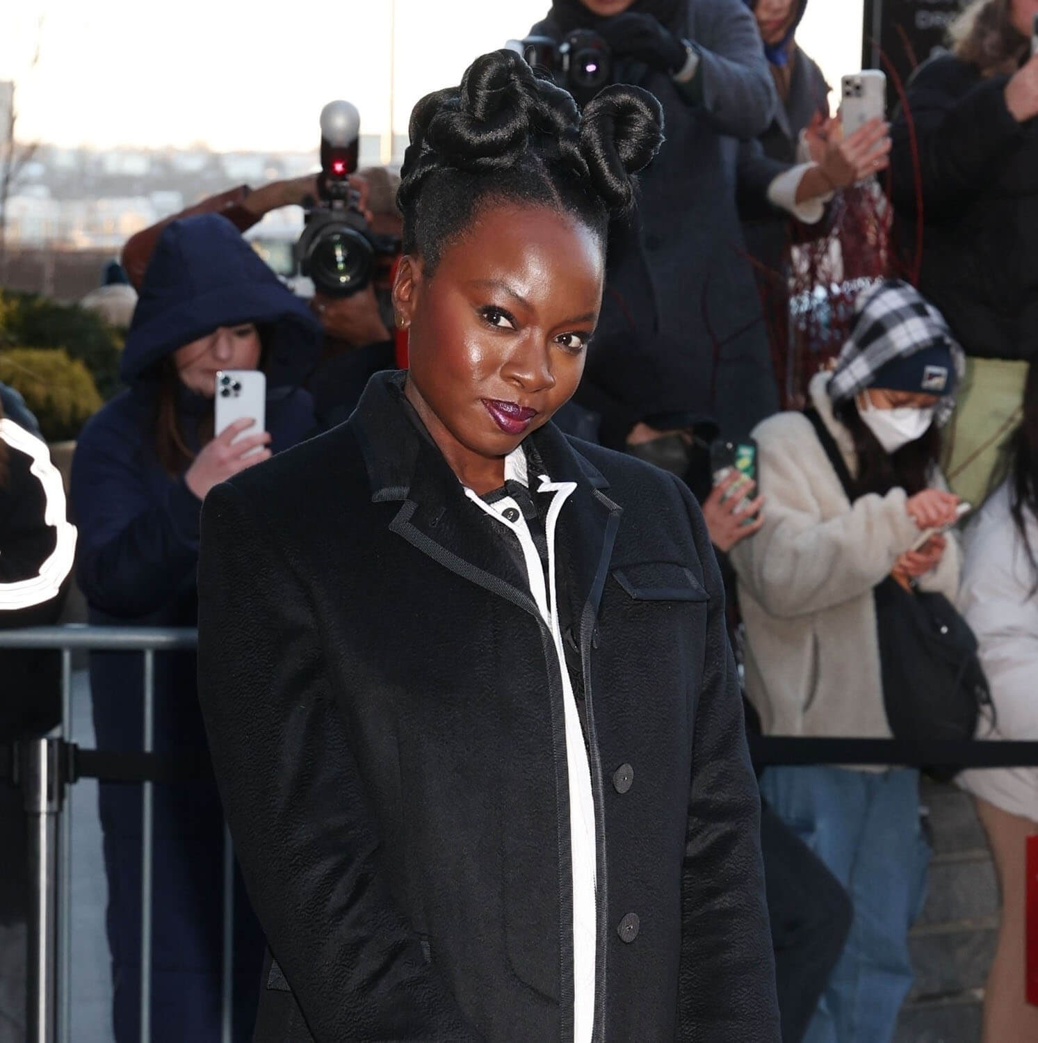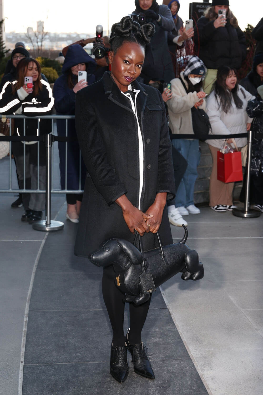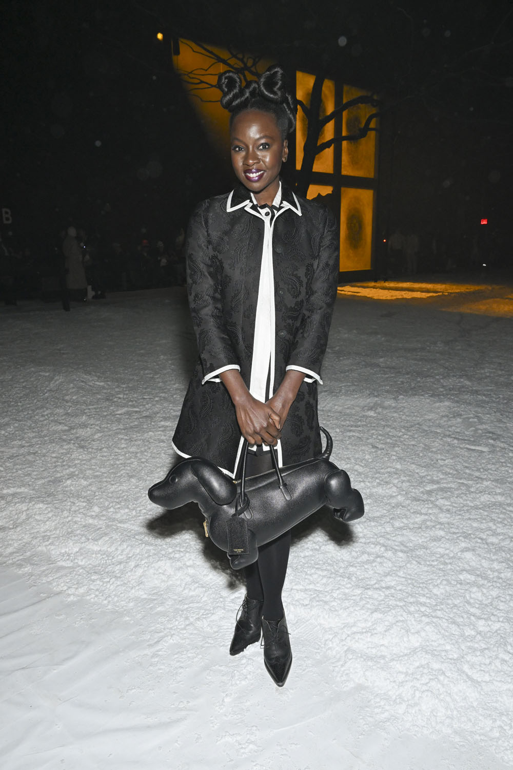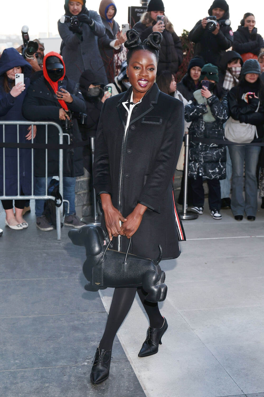 Danai Gurira, a Thom Browne regular, was also at the show, carrying the now famous dog bag and looking sharp in this black jacket with the white piping: