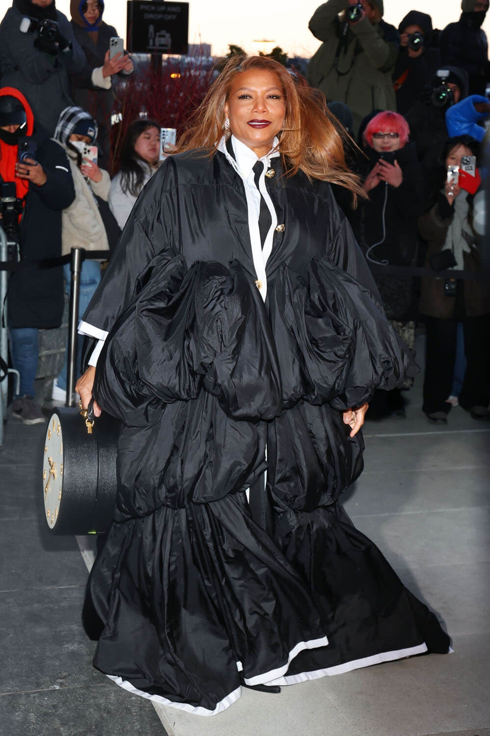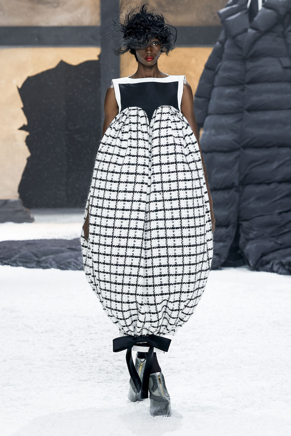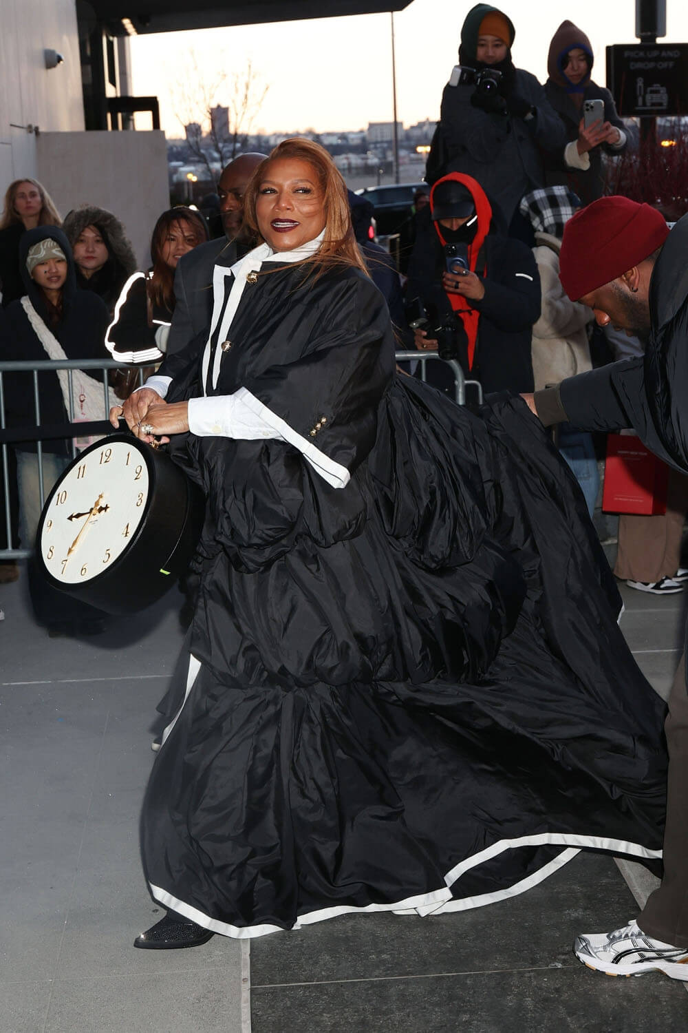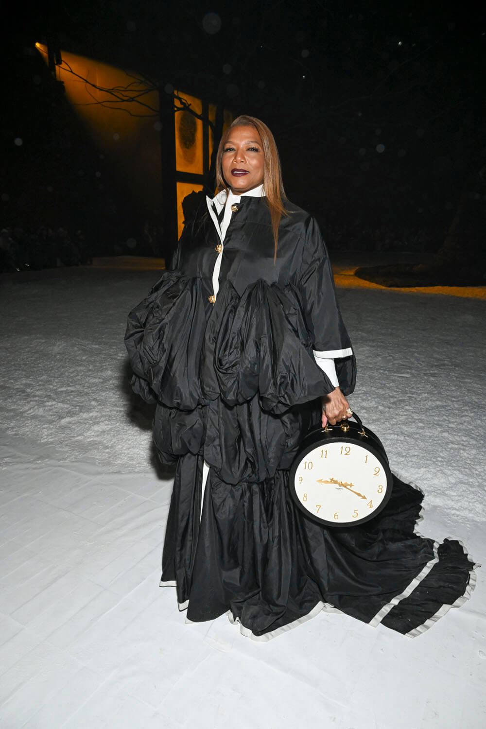Speaking of white piping, OMG look at Queen Latifah! It’s a puffed robe with a bit of an Asian vibe worn over a black suit and tie with a white shirt and showcase of the variety that Thom Browne can bring to a collection.
