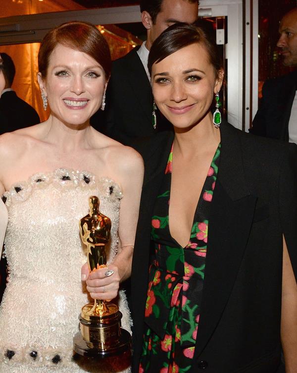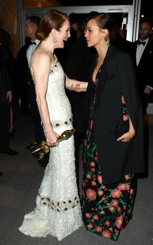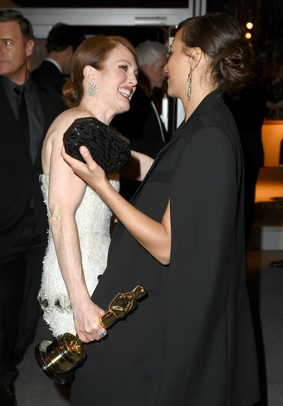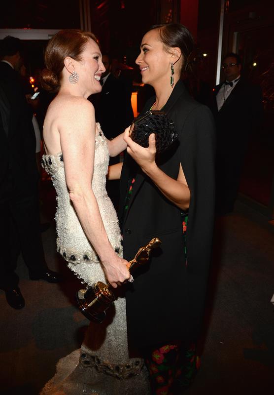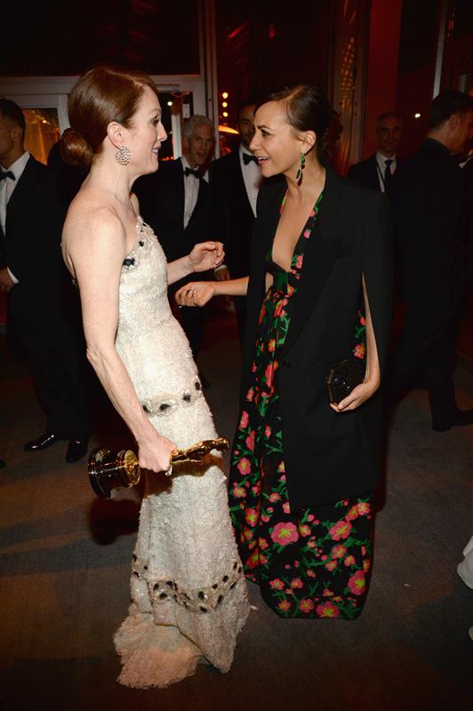 After she went in, on the other hand, she decided to confess her love to Julianne Moore, who appears to be saying it’s mutual, and she found a floor length cape which proves more is more, and seemed to perk up a lot. Sometimes all it takes is going inside the party (and finding Julianne Moore) to actually start enjoying yourself.