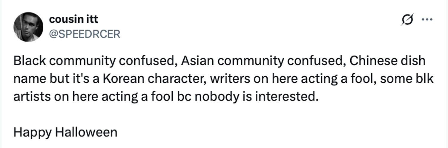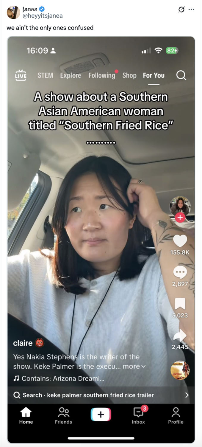 None of this is to say that there is no need for more shows with Asian protagonists. But we need to be doing this in a meaningful way. And the Southern Fried Rice storyline is so far from believable that it’s not just falling flat with its Black audience, but its Asian audience, too. Asian content creators have taken to TikTok to express their confusion with the show’s premise.
