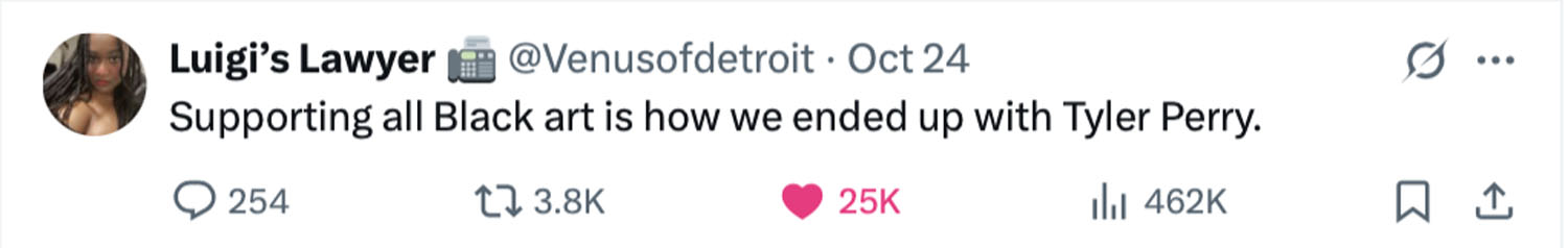 To that user’s point, Black artists calling on Black audiences to be more interested in Black art is an idea worth exploring. Do we have to be interested and supportive of content just because we share aspects of our identity with the person or team behind it? It’s a question worth asking, considering that Black creators can and have contributed to negative, stereotypical or internalized portrayals of Black people, namely Black women, which makes the mere act of supporting their work incredibly difficult and nuanced.