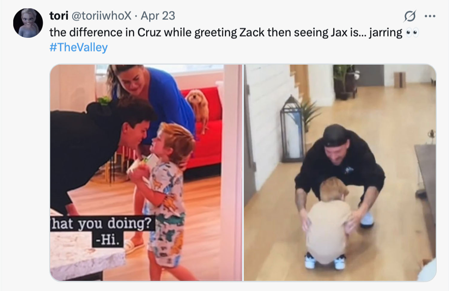 It was interesting seeing social media users using his son’s behaviour as an indication of just how bad things have become. People pointed to how much more open, receptive and affectionate Cruz was in greeting Zack compared to him pretty much sinking into himself when Jax arrived.