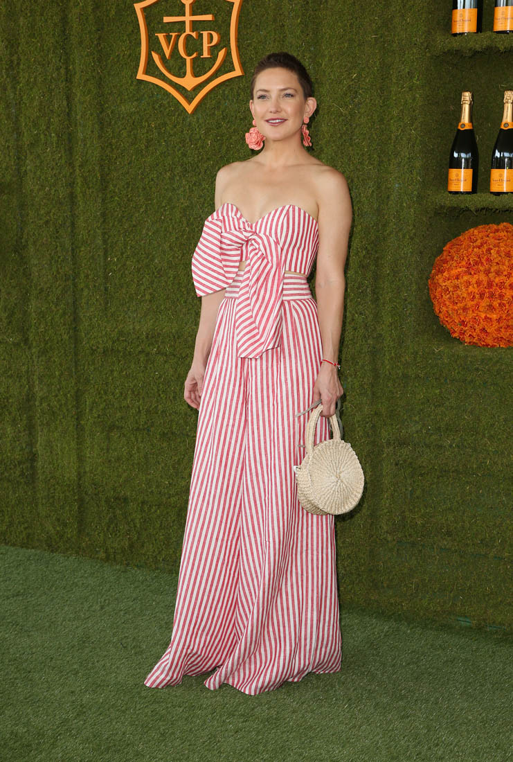 Last night, Lainey emailed me to tell me there were some new photos of Kate Hudson at an event. So I went online to find them and I realized there are always new photos of Kate at an event. In fact this weekend she was at the amfAR Gala on Friday and the Veuve Clicquot Polo Event Classic on Saturday. Let’s focus on Saturday, because it’s the more interesting outfit. Strapless jumpsuit, bow on the front, a bit of a cut-out, wide leg pants and stripes. Cute, right? I could have lived without the floral earrings but fine. And I appreciate that she is sticking with the short hair – it’s growing out very nicely.
