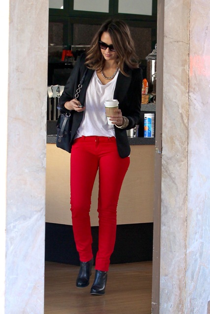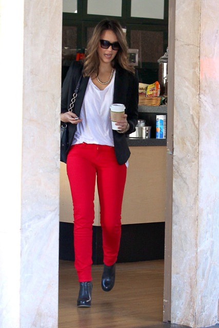 Here’s Jessica Alba, also evidently into red jeans, hitting up a coffee shop yesterday. I prefer wearing mine with a little bootie too, though I haven’t tried them with a wedge. My legs are on the short side and they just don’t look quite right in a flat shoe.