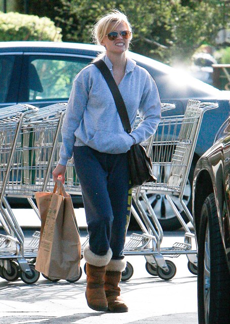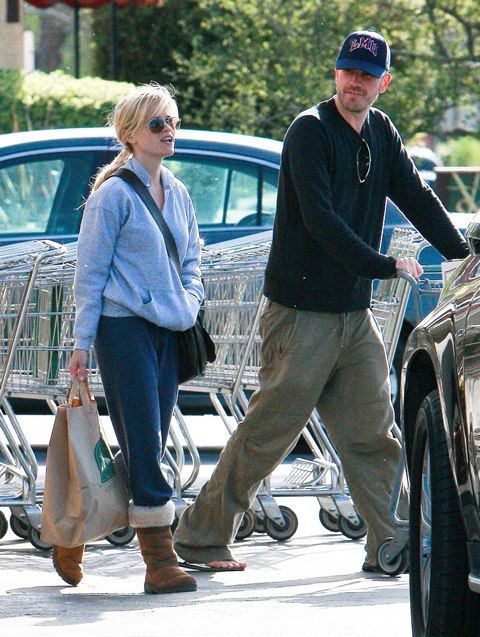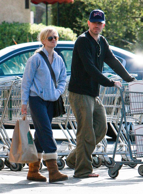 That’s a sleepover outfit, non? Reese Witherspoon stepped out with her boyfriend Jim Toth yesterday to hit up the supermarket dressed very casually in sweats and uggs just 2 days after her birthday and a weekend with him in Ojai, no kids. Cosy.
