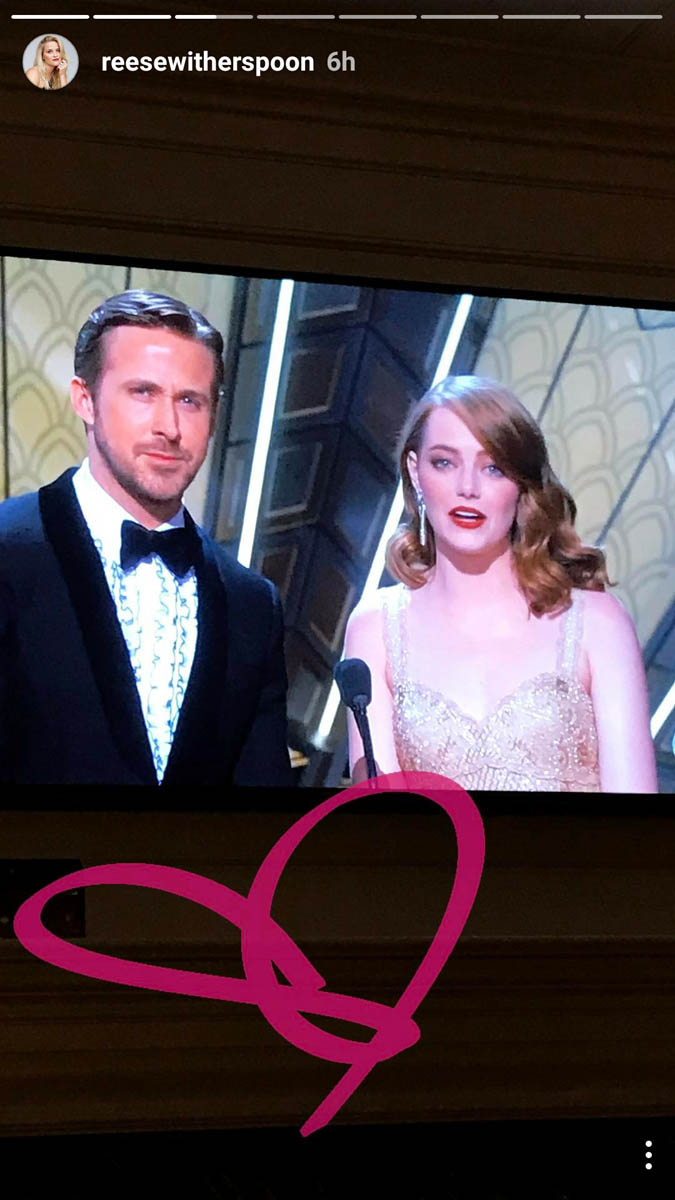 Speaking of power players… Reese was watching E! and the Oscar broadcast while she was getting ready for the soiree. She posted a few shout-outs on her Instastory, to Ava DuVernay and her Big Little Lies sister Nicole Kidman, respectively. But she also drew a heart emoji on a photo of Ryan and Emma presenting together at the Oscars. Back in January, Reese attended a private screening of Jackie, and a month before that, she pledged her support to Natalie and her “timeless performance” online. It all appeared like Reese was Natalie’s champion, and while she likely was, after the Golden Globe sweep, I wrote about how she may have switched horses, and jumped on board the Emma train as Natalie’s campaign began to lose momentum.