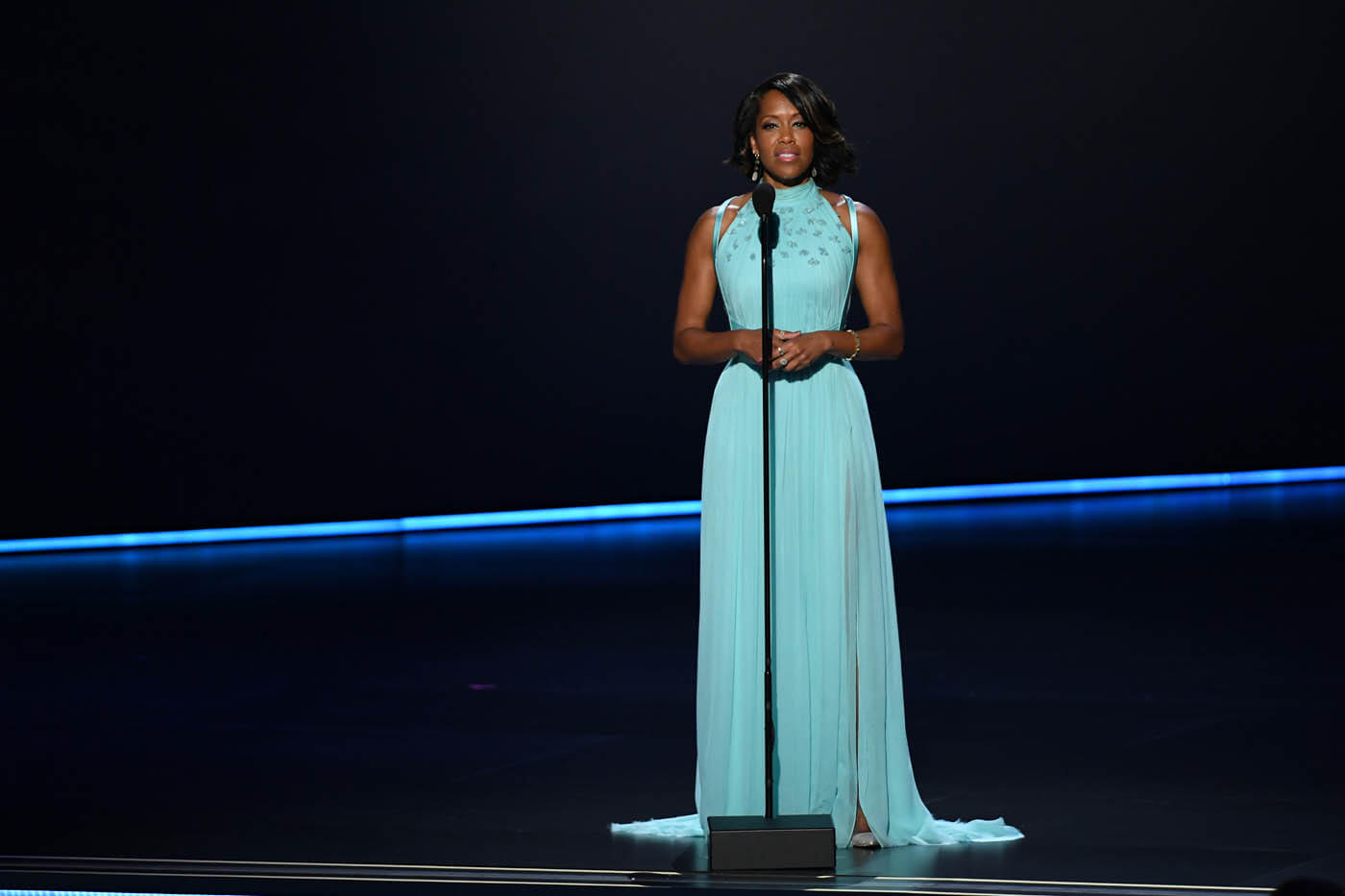 This is an excellent start to her victory tour, even though this is never my favourite colour. Whatever you want to call it – periwinkle, sea foam, baby blue – it’s still too prom for me, as far as prom has come. And yet, on her, in this dress, it’s not annoying, not at all. Mostly because this colour just pops off of her, so vibrant and electric, like she’s her own energy source, but also because it’s purposefully not cutesy. The addition of that harness, though not as extreme as other harnesses we’ve seen over the last year, makes a difference, makes it feel like it’s not quite meant for prom or bridesmaid. And I love how that high collar increases her natural stateliness. Her name, after all, is Regina King – a double regal, she’s a Queen and a King. And she wears that neckline like a monarch.