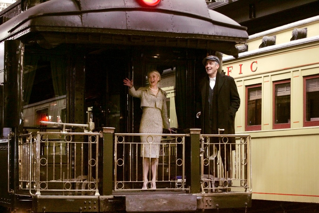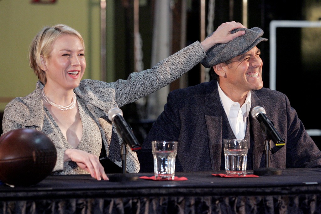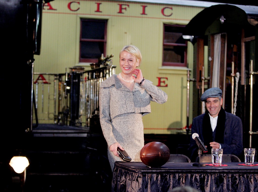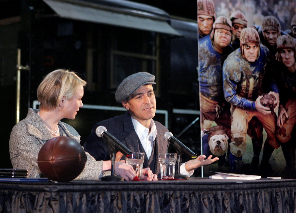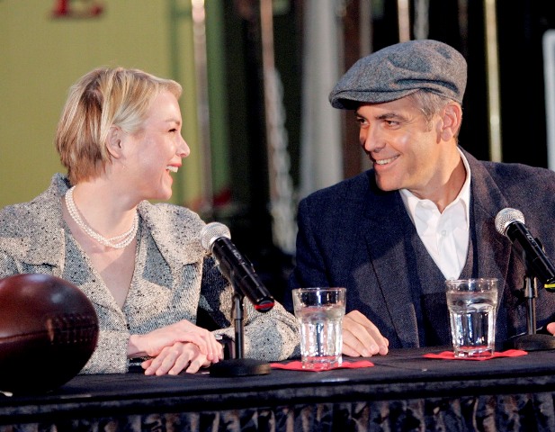 This is Renee in Minnesota yesterday with George Clooney promoting Leatherheads on a train. In spite of the pain her face must have been inflicting, she was in great spirits – and why not? George Clooney can charm the pants off anyone. George Clooney is like cool aloe on a burn. And she needed it. And they do have great chemistry. And he did look so handsome. And she wants him so badly.