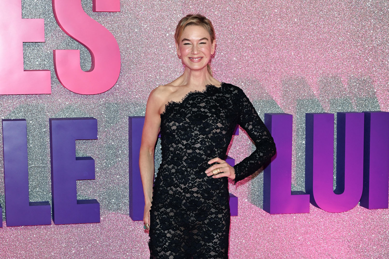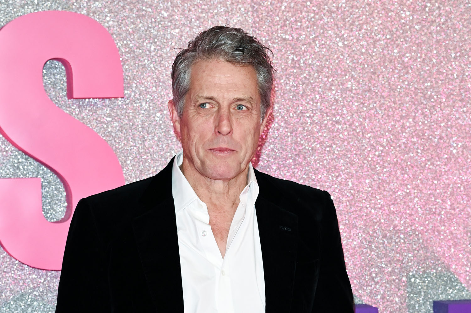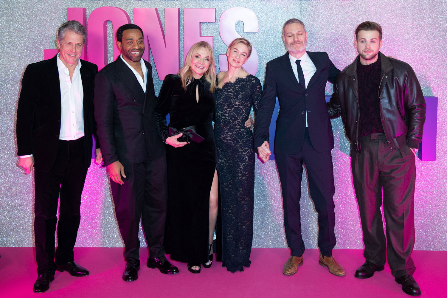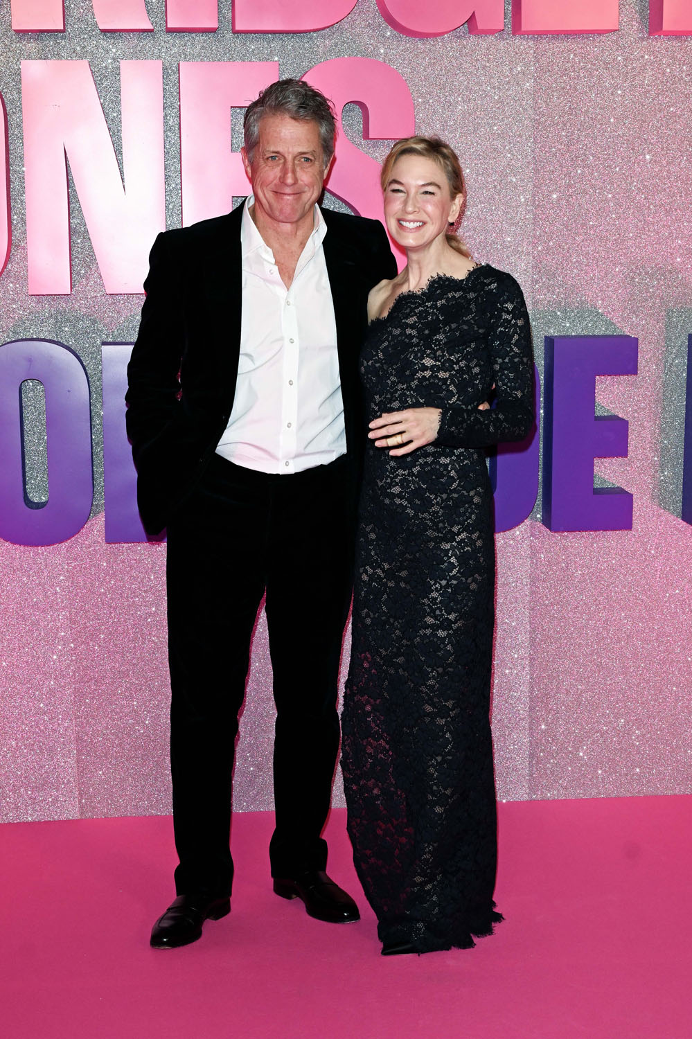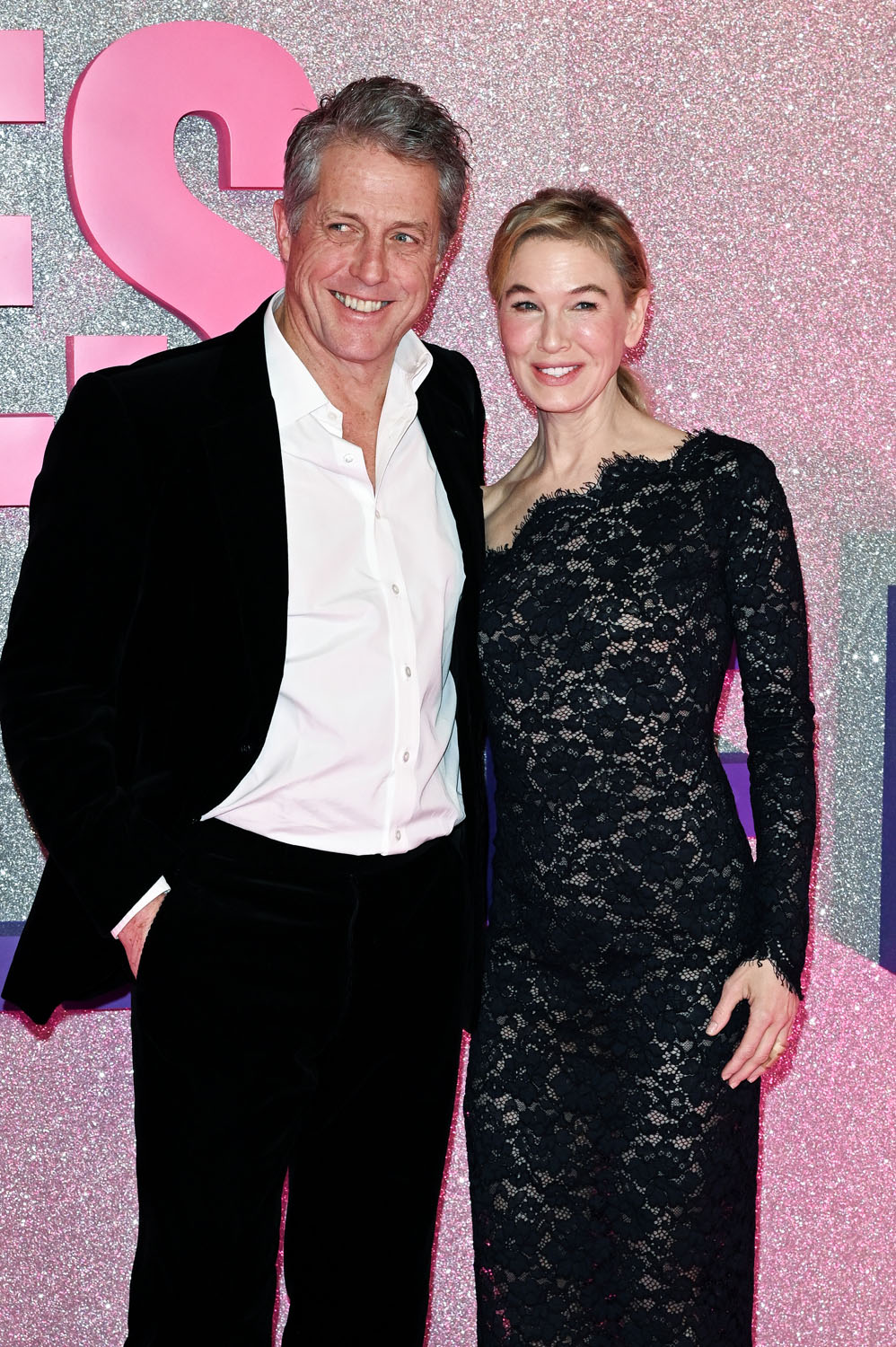 Until those two establish themselves, though, which will be after we’ve seen the movie, the money shot here is Renée with Hugh because, of course, it’s the nostalgia, the familiarity, and… well… the Hugh. He doesn’t even look that grumpy in any of these photos, despite the presence of all that pink and purple, and the sparkles, which I’m sure he would have said something about. Maybe it’s because it was Paris, and the studio probably had him in a gorgeous hotel suite, and he would have had a reservation at one of the best restaurants, and it’s not like this man doesn’t like the finer things, while hating the cliché of being someone who loves the finer things.