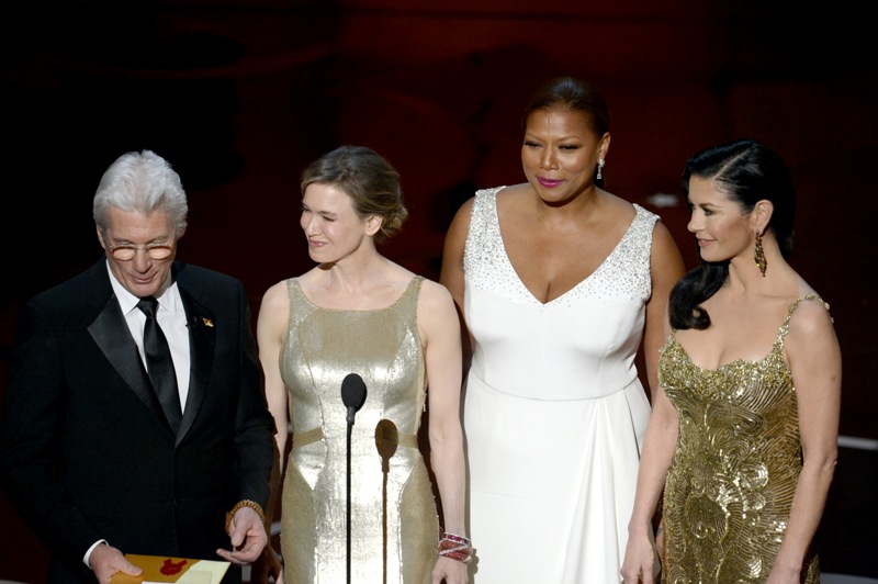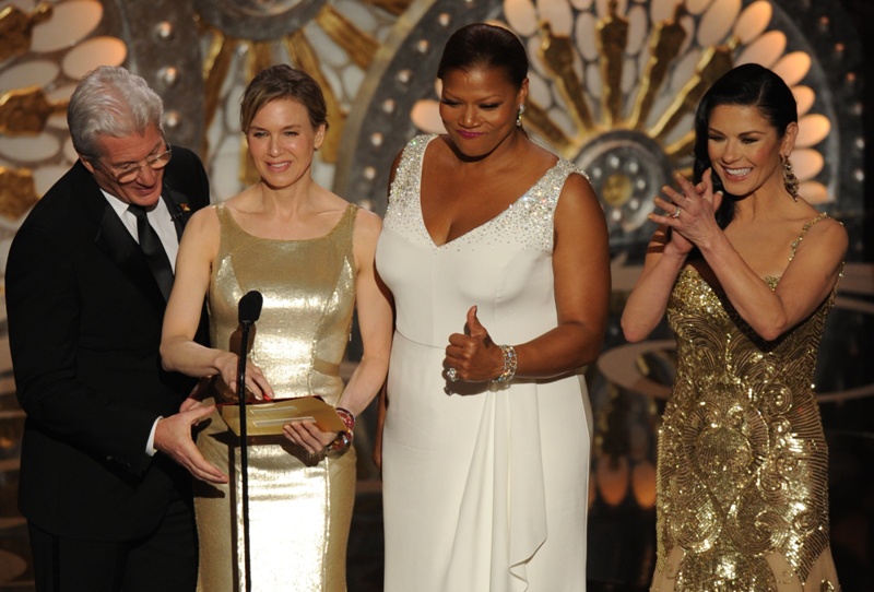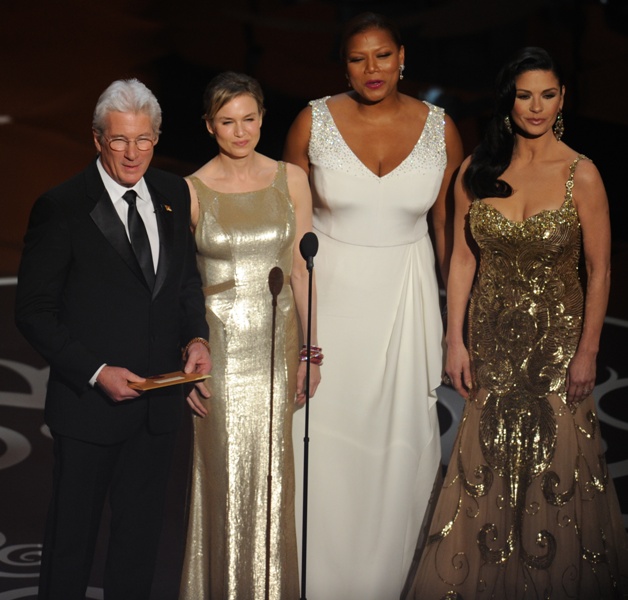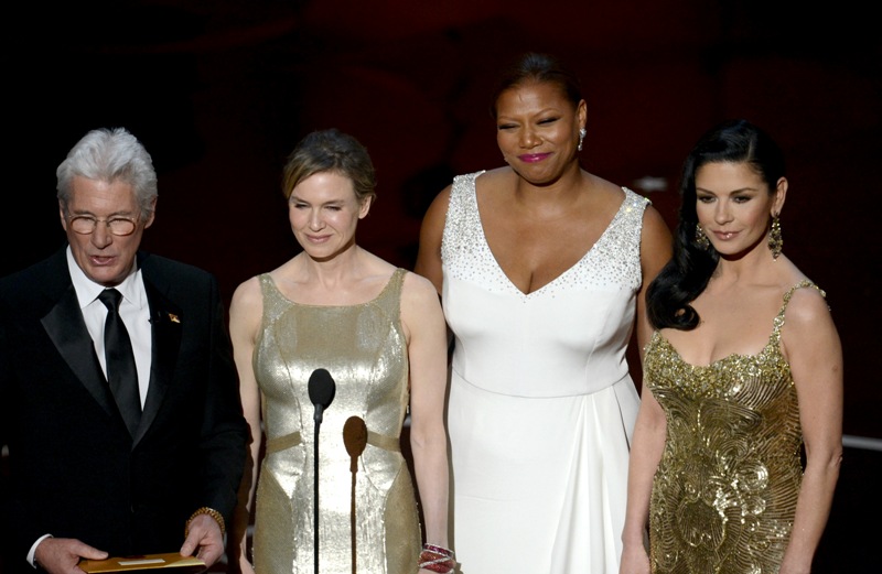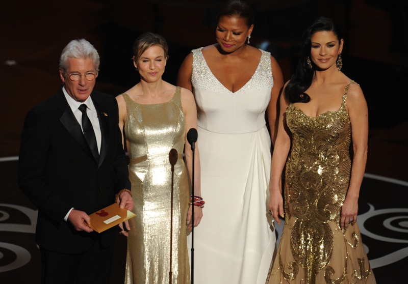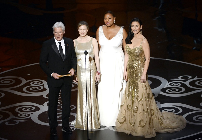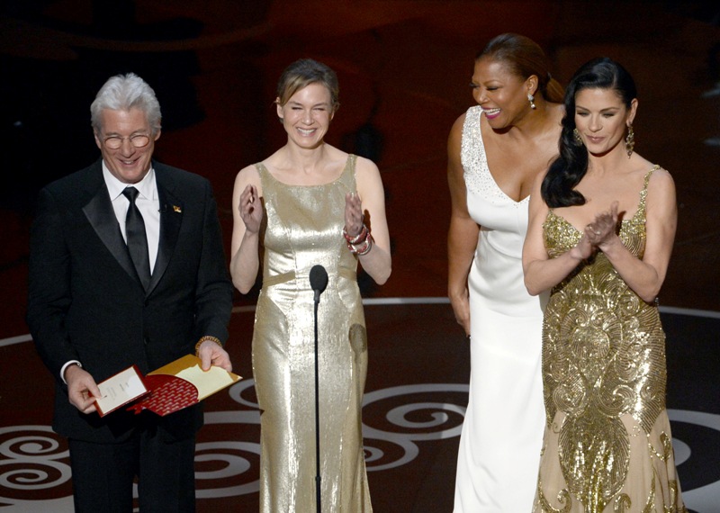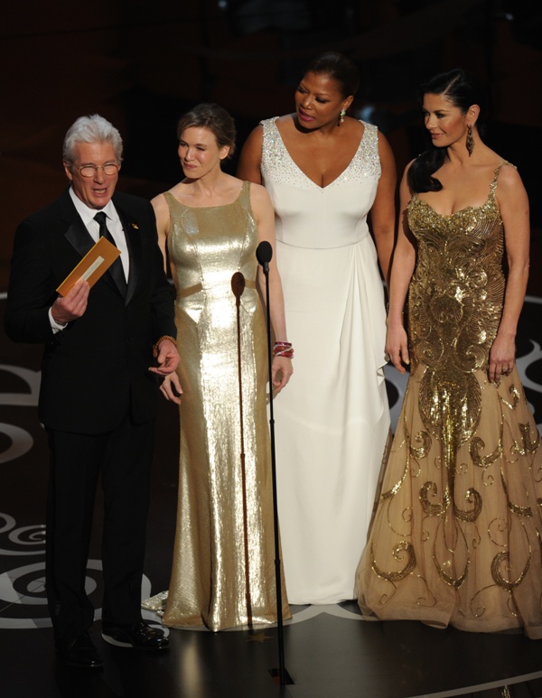 Renee Zellweger went back to her favourite, Carolina Herrera, to present at the Oscars. It was one of several “tank” style dresses with gold accents that we saw on the night -- including Catherine Zeta-Jones, with whom she presented. It didn’t work for Zeta and it doesn’t work for Renee.