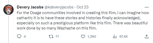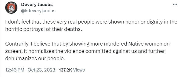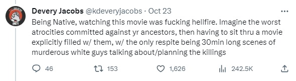 Reactions to Jacobs’ tweets are predictable. They go thusly: 1) Osage consulted and worked on the film, so it’s fine; 2) it’s important that this story be told; 3) Jacobs is starring in an upcoming Marvel series, Echo, so she’s just a bitter betty Marvel stan mad at Marty for calling Marvel movies theme park trash.