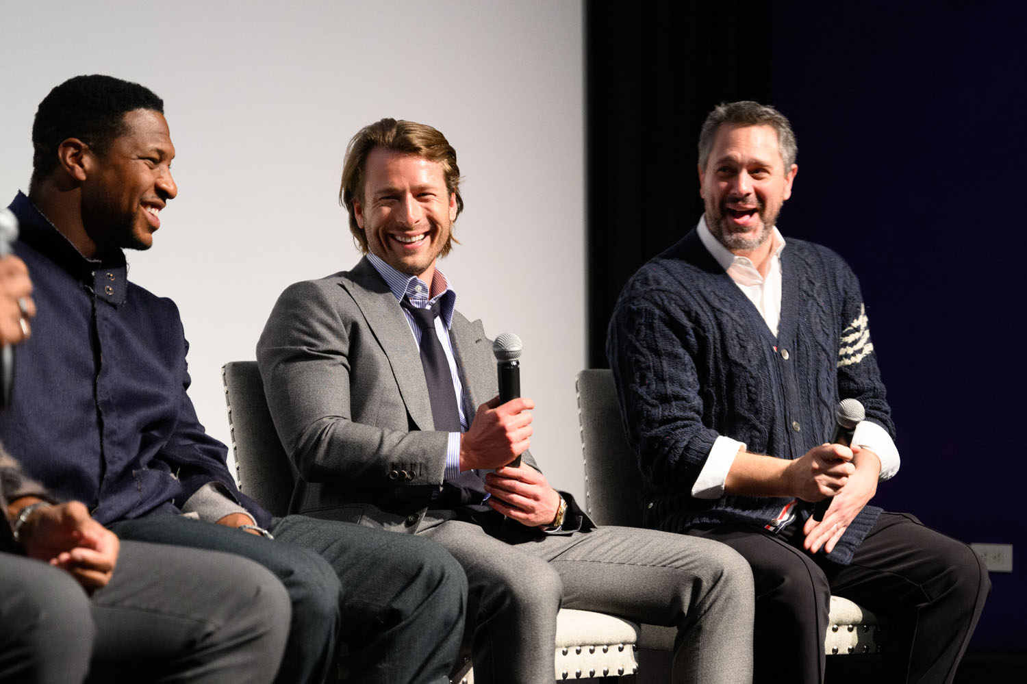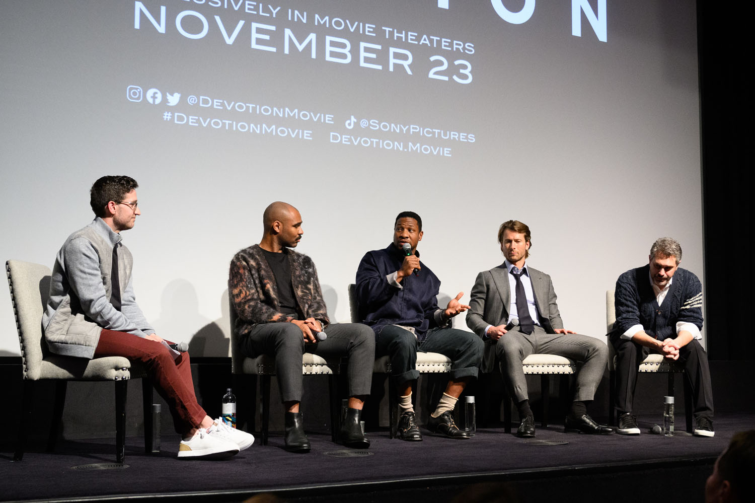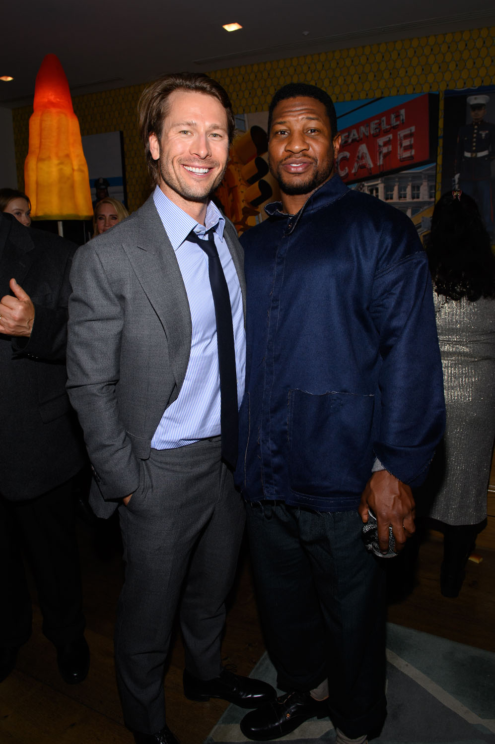 Attached - Glen Powell, Jonathan Majors, and Thomas Sadoski attend the Devotion VIP Screening Event at Crosby Street Hotel on November 16, 2022 in New York City