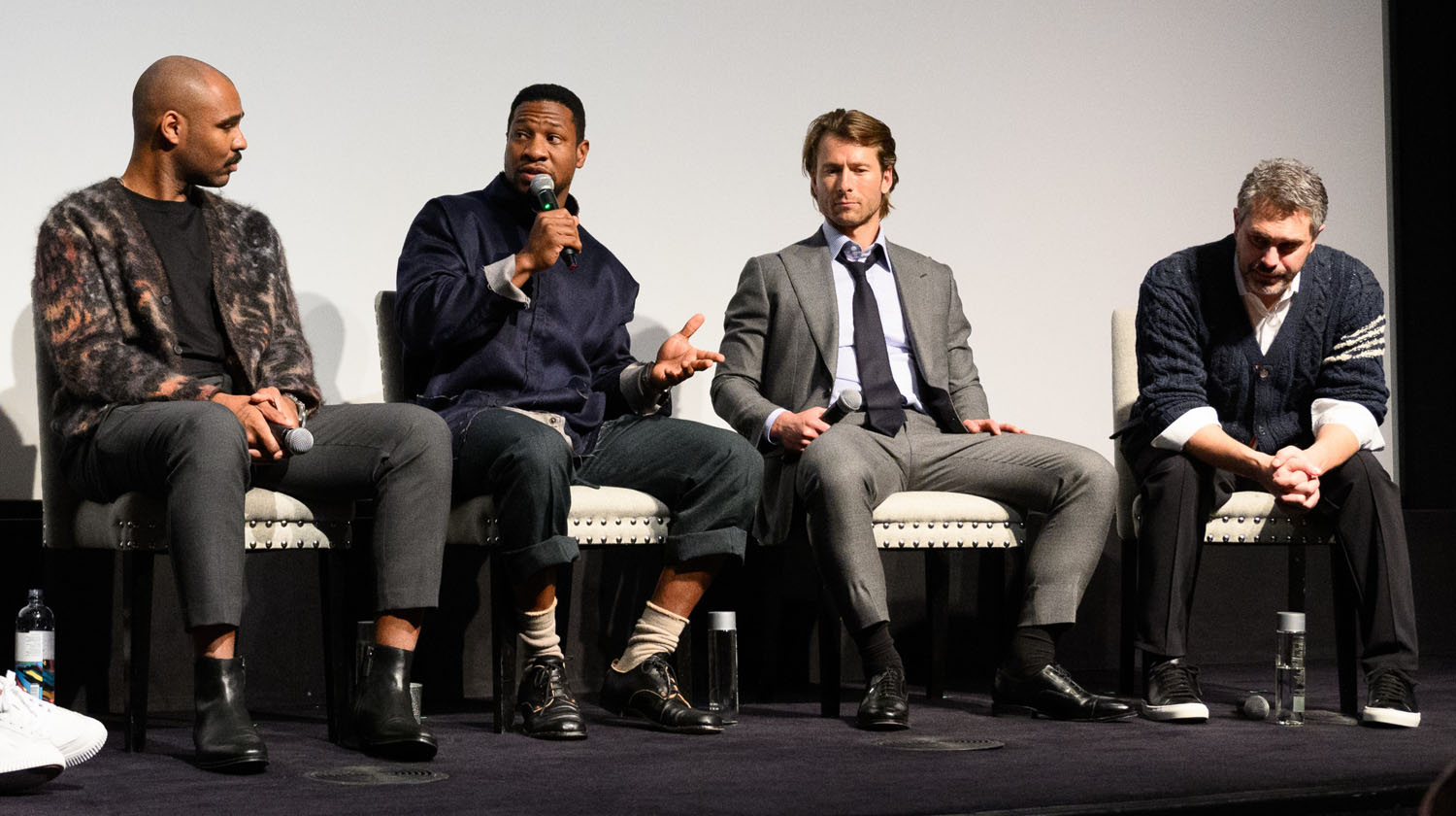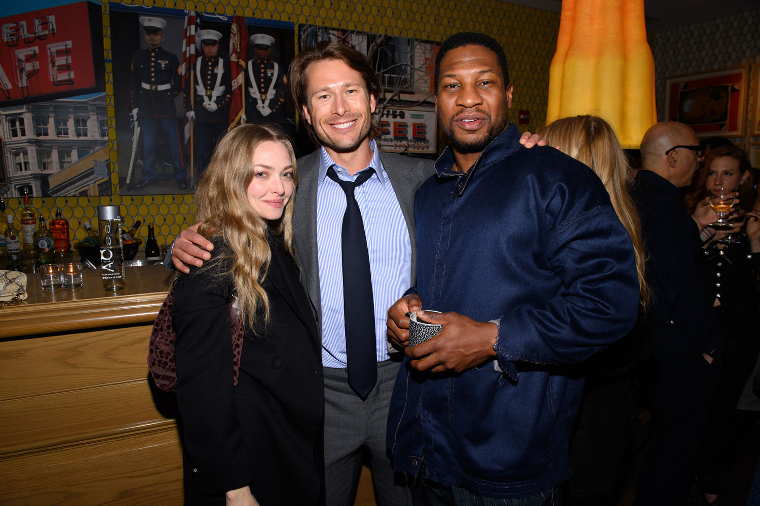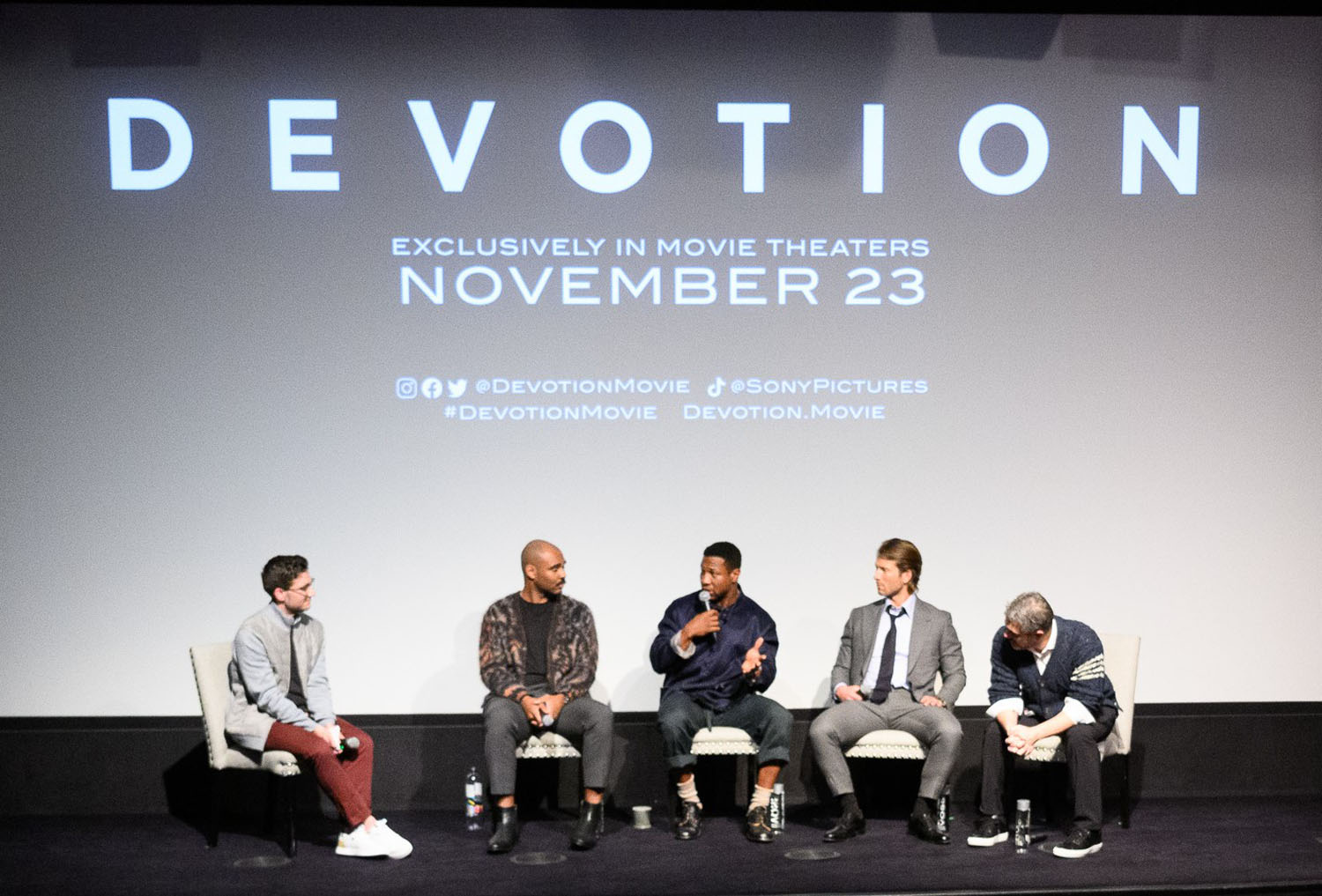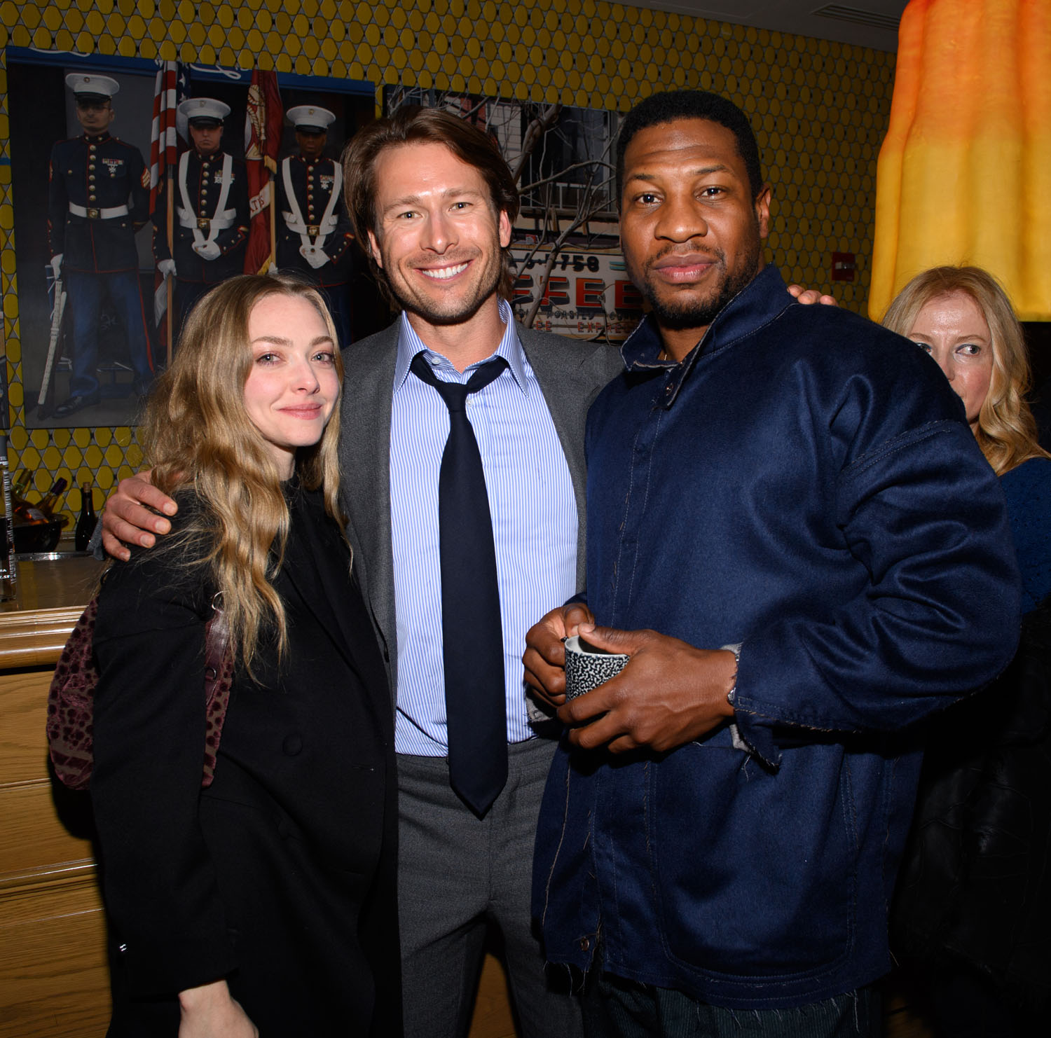 Attached - Glen Powell, Jonathan Majors, and Thomas Sadoski attend the Devotion VIP Screening Event at Crosby Street Hotel on November 16, 2022 in New York City