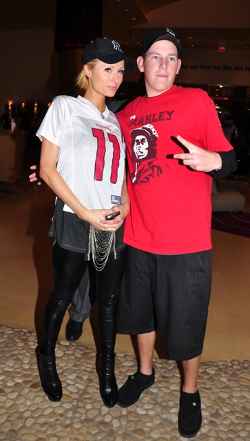 As for the Ebola, not surprisingly, she showed up in Tampa Bay to party at the Super Bowl yesterday. Here she is posing with some fanboy, a classic douchebag. I mean, really, it doesn’t get more douchebaggy than this. The shorts, the shirt – he’s sh*ttng on Bob Marley’s memory – the beat-me face, the two finger salute…I’m actually surprised he’s not wearing a LiveStrong bracelet, but I would bet Posh’s concrete tits that he does drive a pick-up truck. Or a Dodge Magnum.