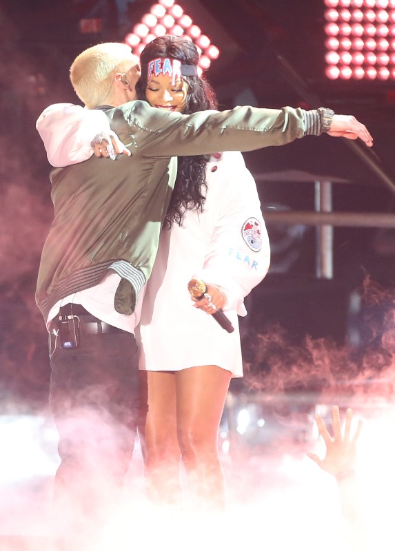 As you know, Rihanna performed at the Movie Awards last night with Eminem. She was live. And she sounded good. I’m not convinced he was live though. Which is kind of a bummer for me. Because I feel like he wasn’t live on SNL either.