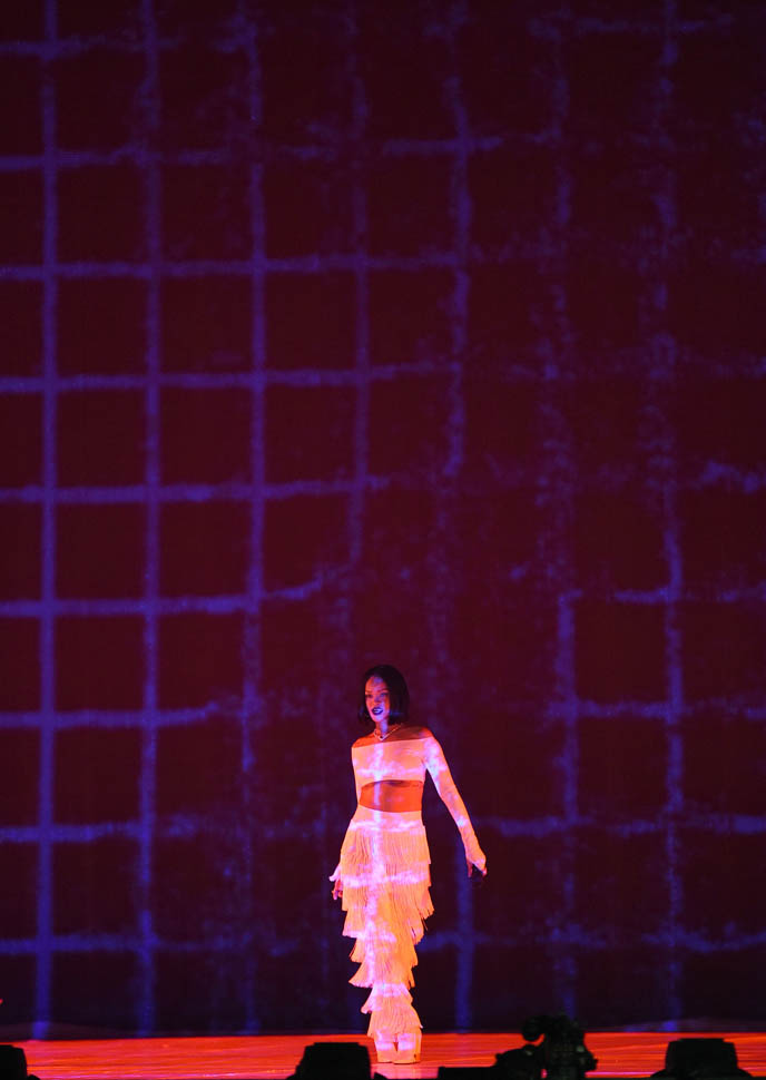 But Lindsay Lohan had to ruin it for everyone so now every time someone is actually not feeling well, we assume they're spiralling out of control. Rihanna did not look out of control last night at the BRITs. Her set design was sharp. The lighting was especially well done. And while her voice wasn't at its strongest, she seemed relaxed, comfortable, particularly during Consideration, having a good time. Then Drake came out and they did their rub and grind thing and it was cute and fun and ...in progress. Meaning you can tell she's been rehearsing for the tour and she's clearly getting more and more familiar with the feel of presenting the album live but it's definitely not there yet. Which of course is why the tour has been pushed back two weeks. So now she has two weeks to get it down, and not just for two songs either. This is an entire show, minimum 15 tracks.