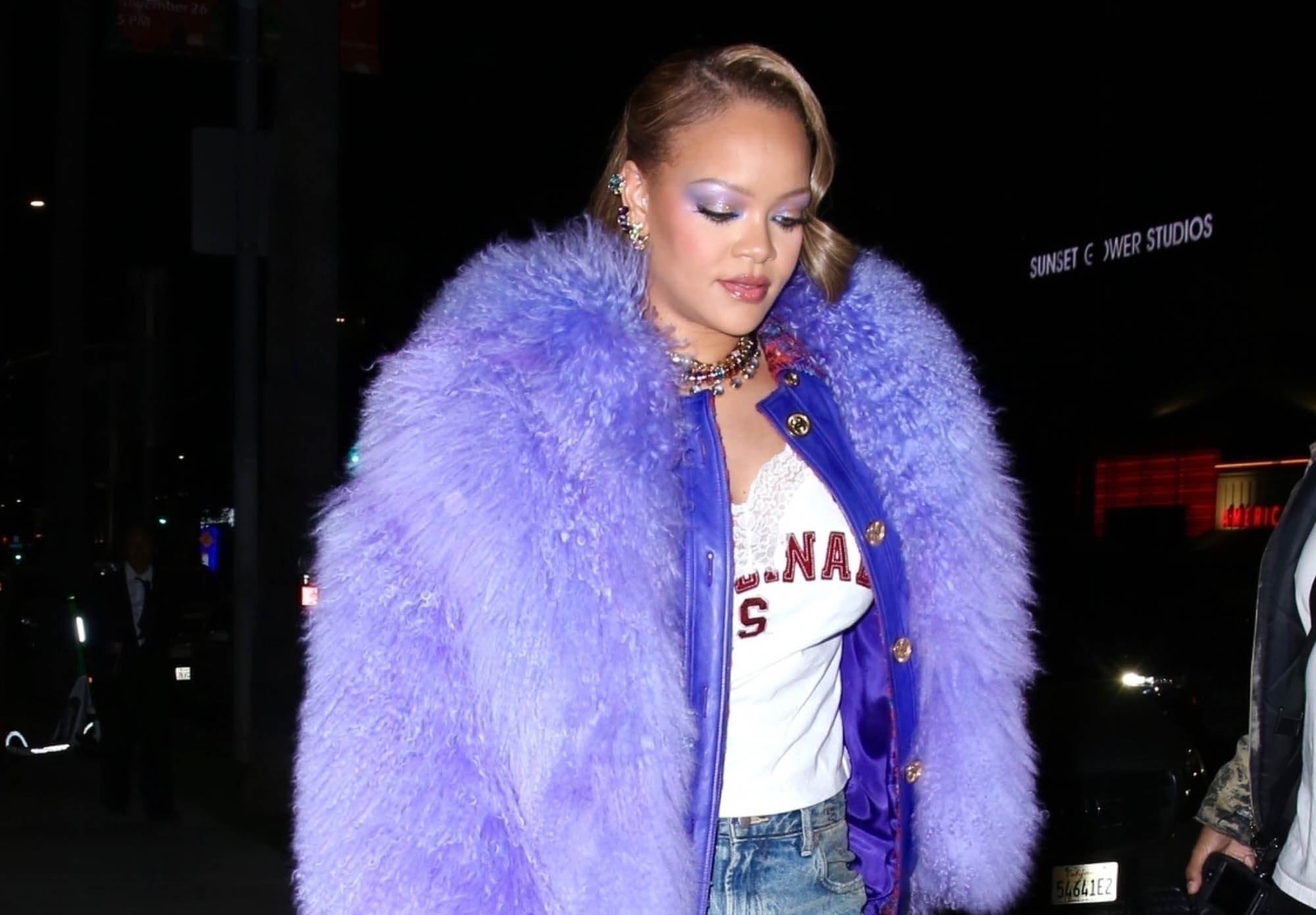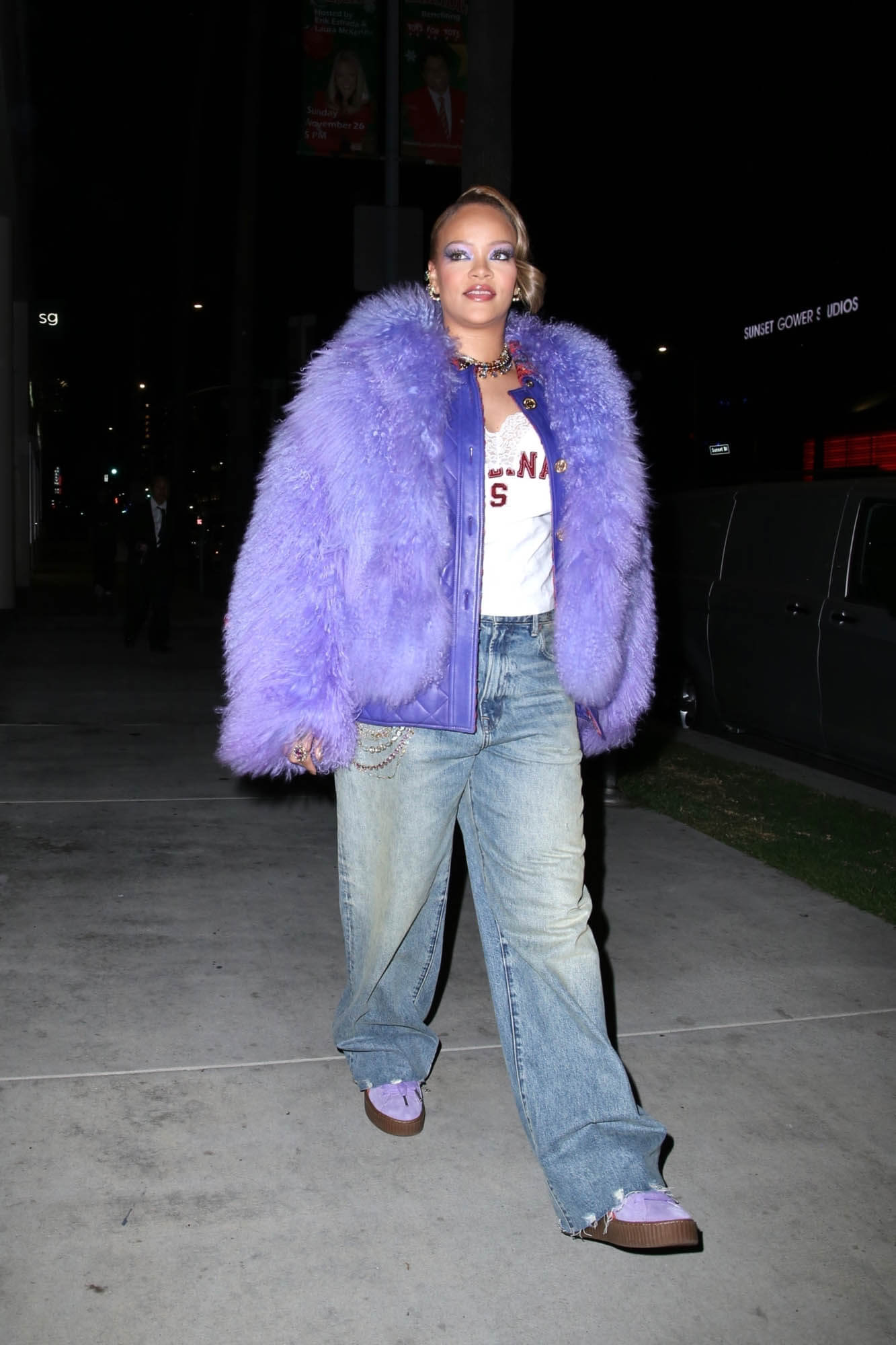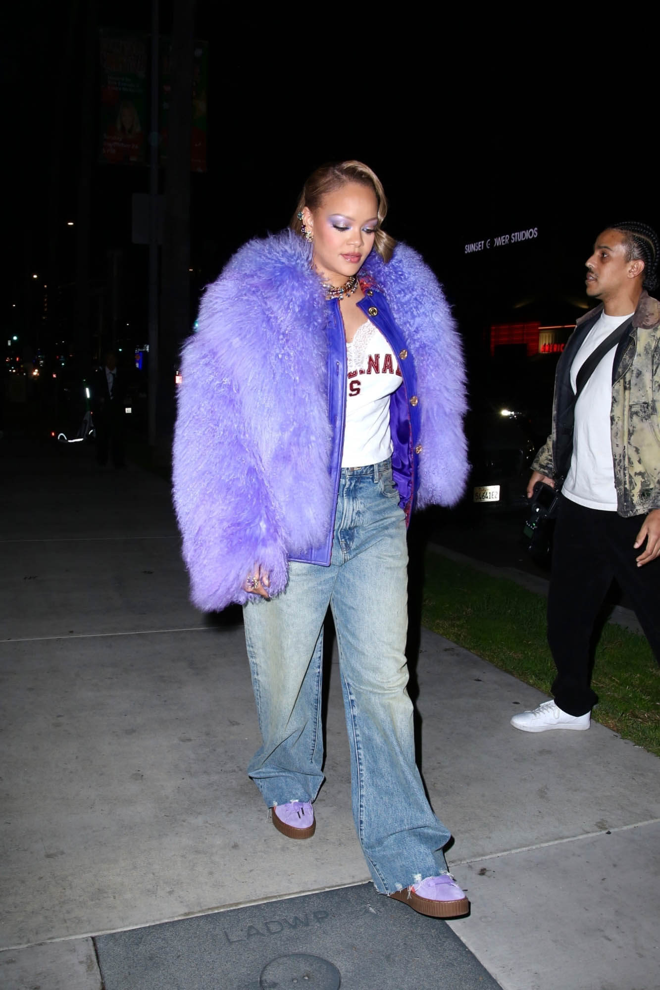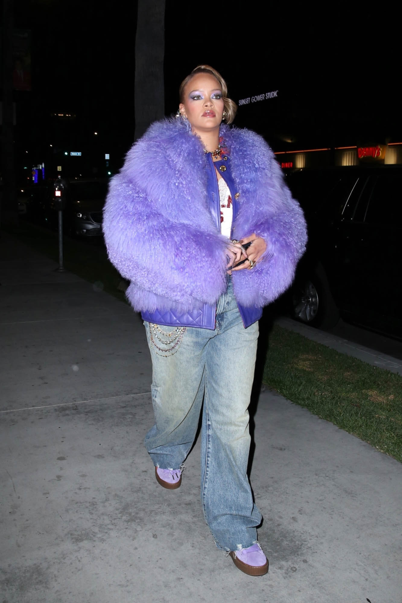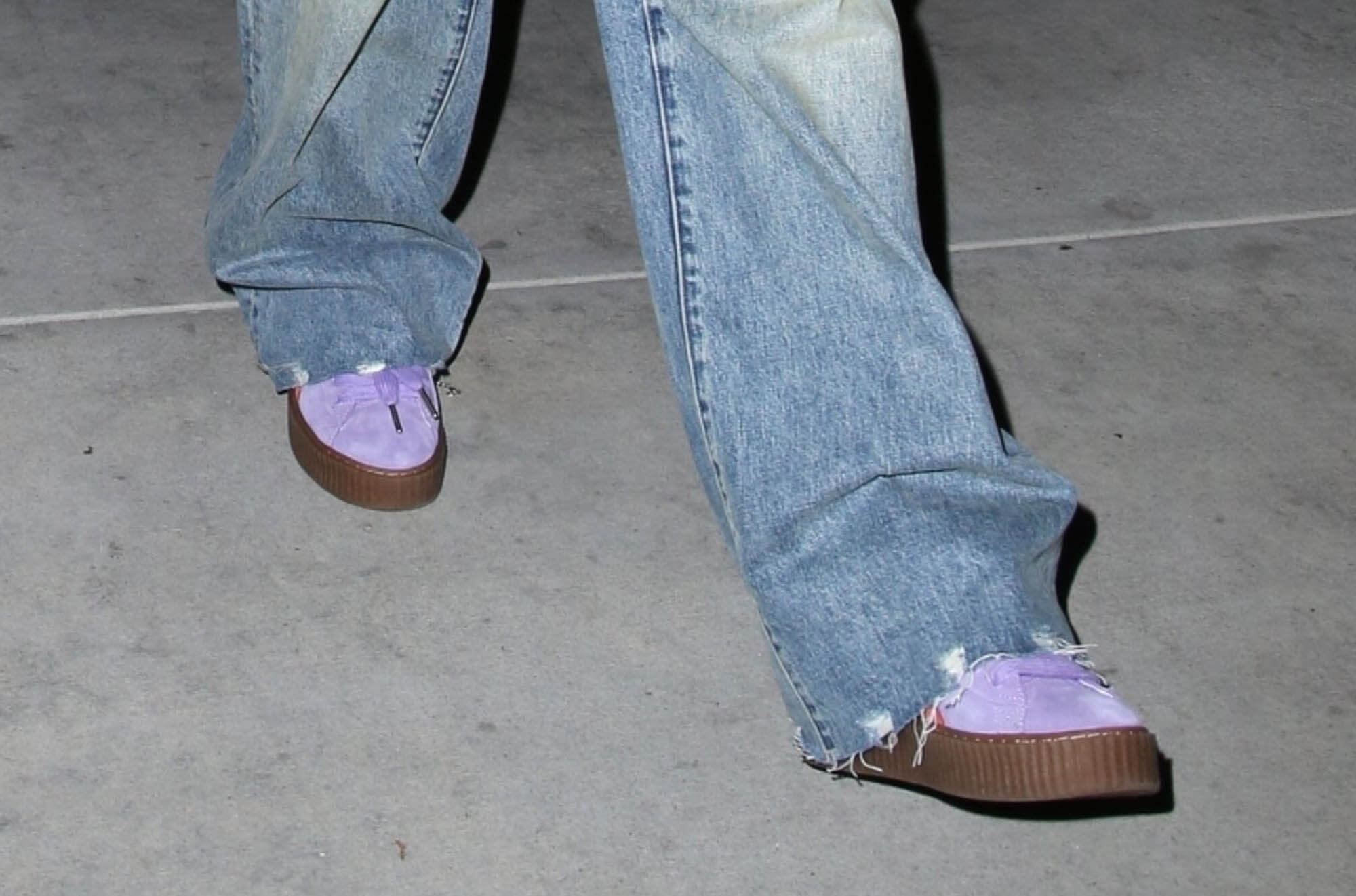 Rihanna stepped out last night at the launch party for the Fenty x Puma Creeper Phatty wearing a big purple fur to match her kicks. The Creepers were always popular and now that she’s brought them back, I’m sure it’ll be the same.