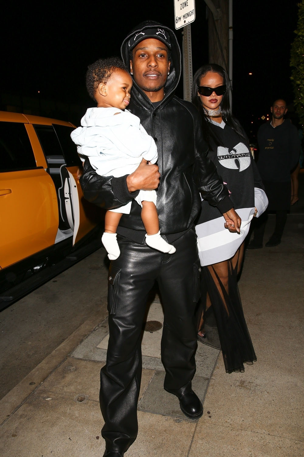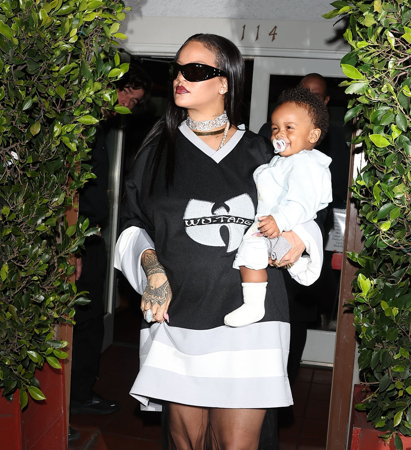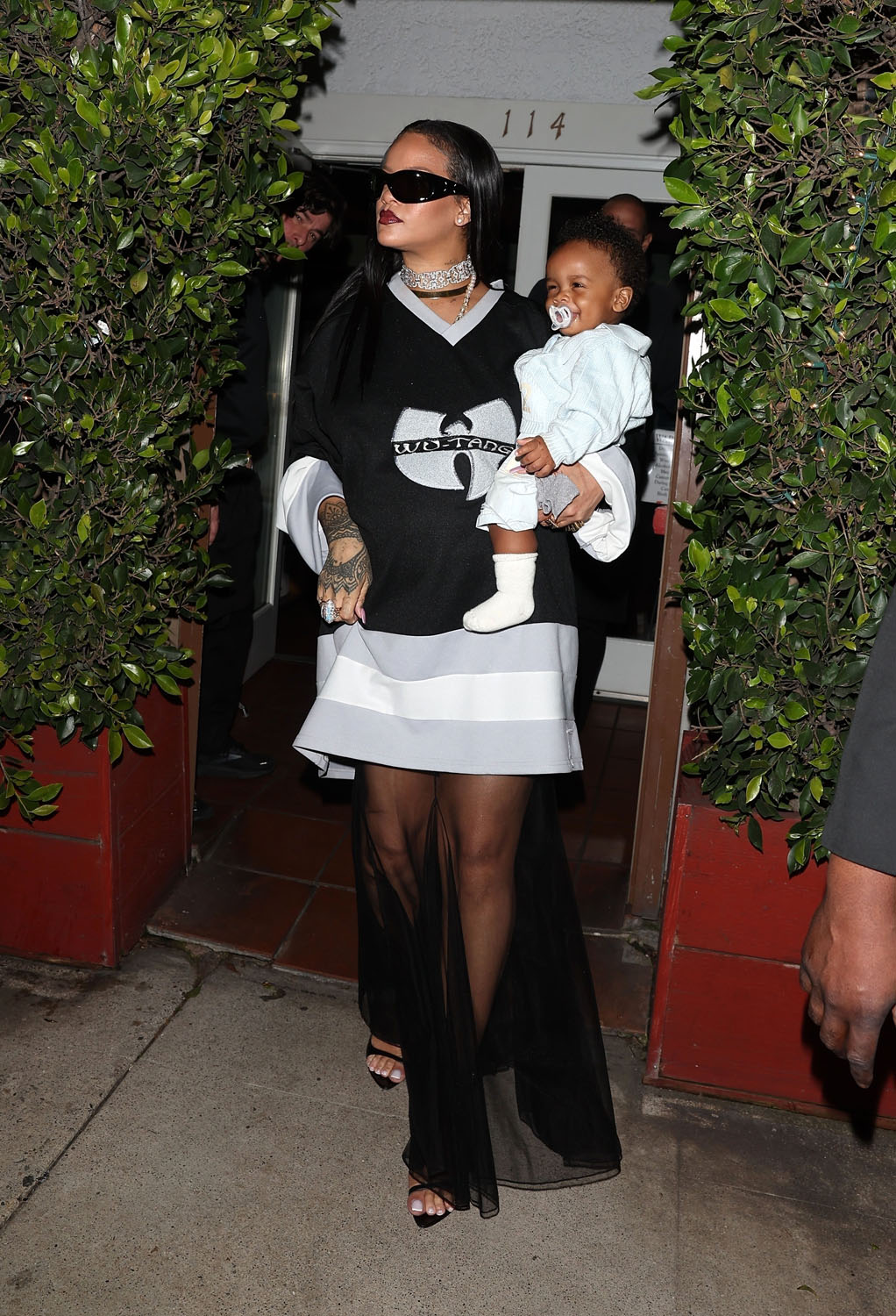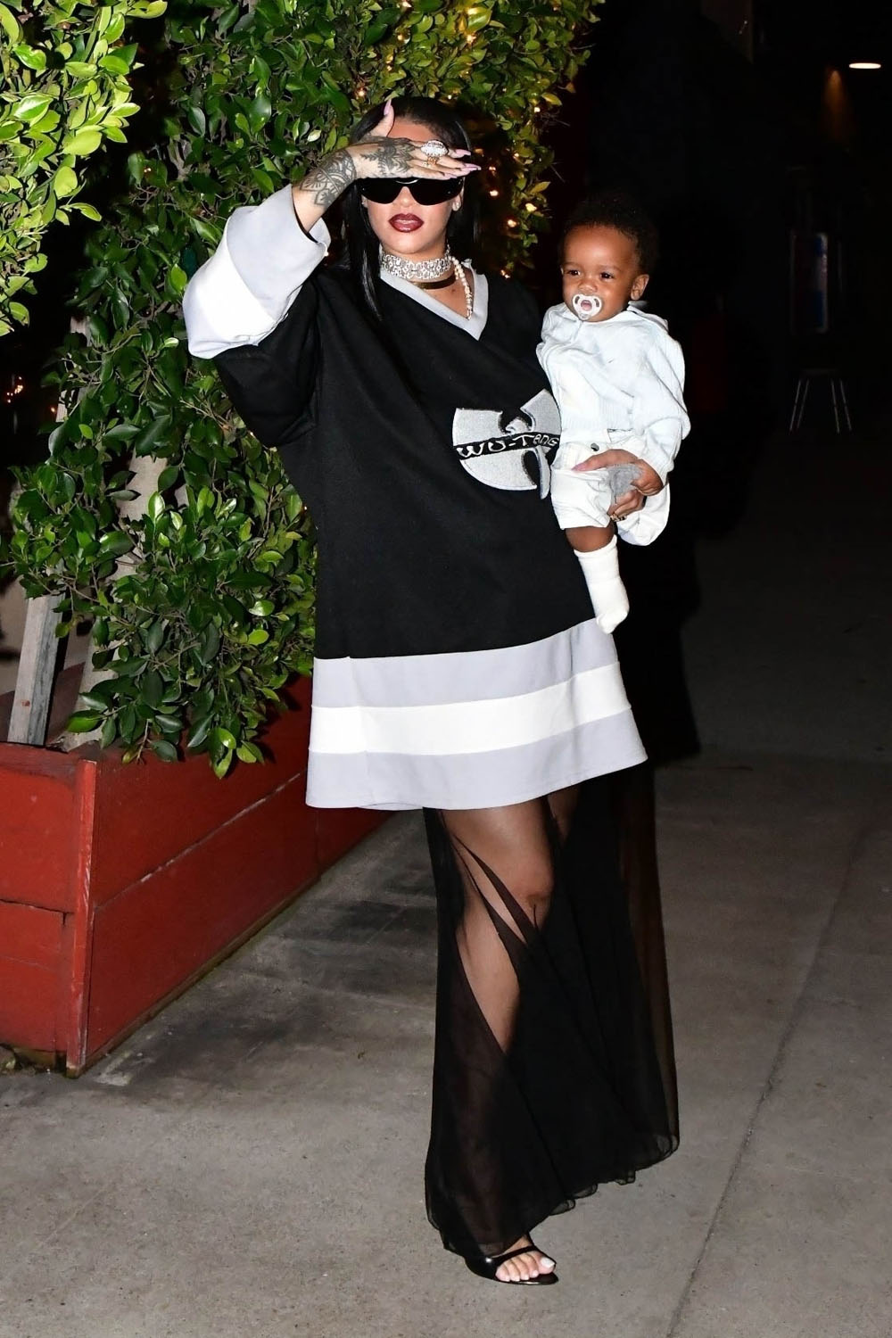 We’ve been seeing more and more of this lately. Rihanna took her baby to the studio recently from night to morning and now she’s bringing him along when she needs her pasta fix in person. As I noted last week when she picked up her food via drive-thru, it could have been because she didn’t feel like getting hair and makeup ready to eat. Obviously that wasn’t a factor this time because everything is working from top to bottom – the sheer dress under the Wu-Tang jersey and all the accessories and strappy heels, RiRi is always putting on a fashion show. And, you will note, the show involves all three of them, because she, Rocky, and the baby are all coordinated in black and white.